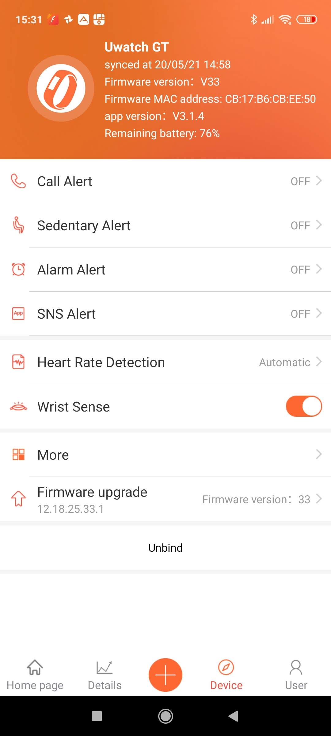 Données cardiaquesLa Umidigi uWatch GT permet de suivre votre rythme cardiaque mais elle ne propose pas de suivi en continu. Vous pouvez voir votre fréquence cardiaque en temps réel lorsque vous accédez à la fonctionnalité sur la montre, vous y retrouverez également la fréquence la plus élevée et la plus basse de la journée. Par contre, contrairement à beaucoup d'autres montres, vous ne verrez pas de graphes montrant l'évolution du rythme cardiaque à travers la journée.
