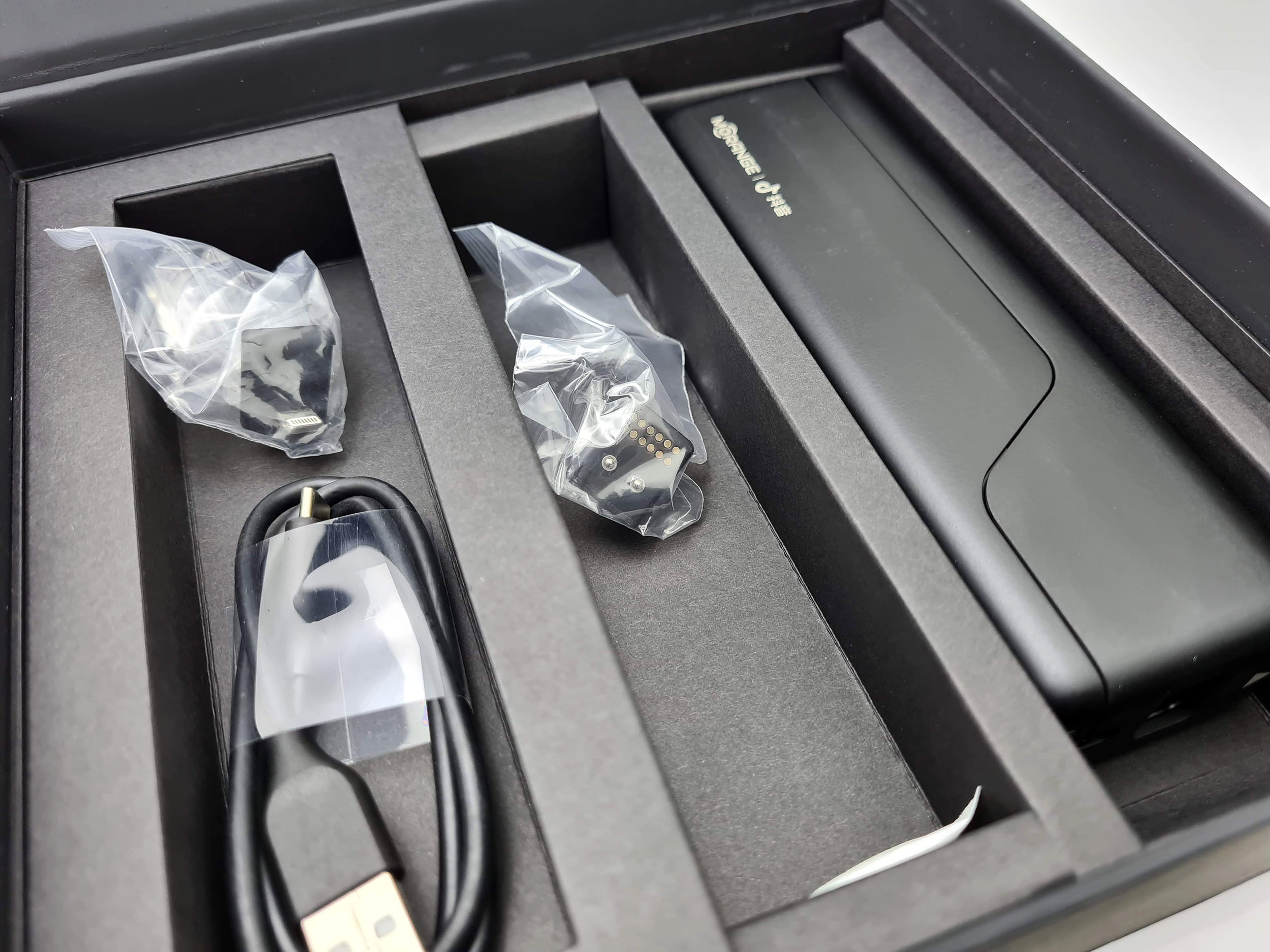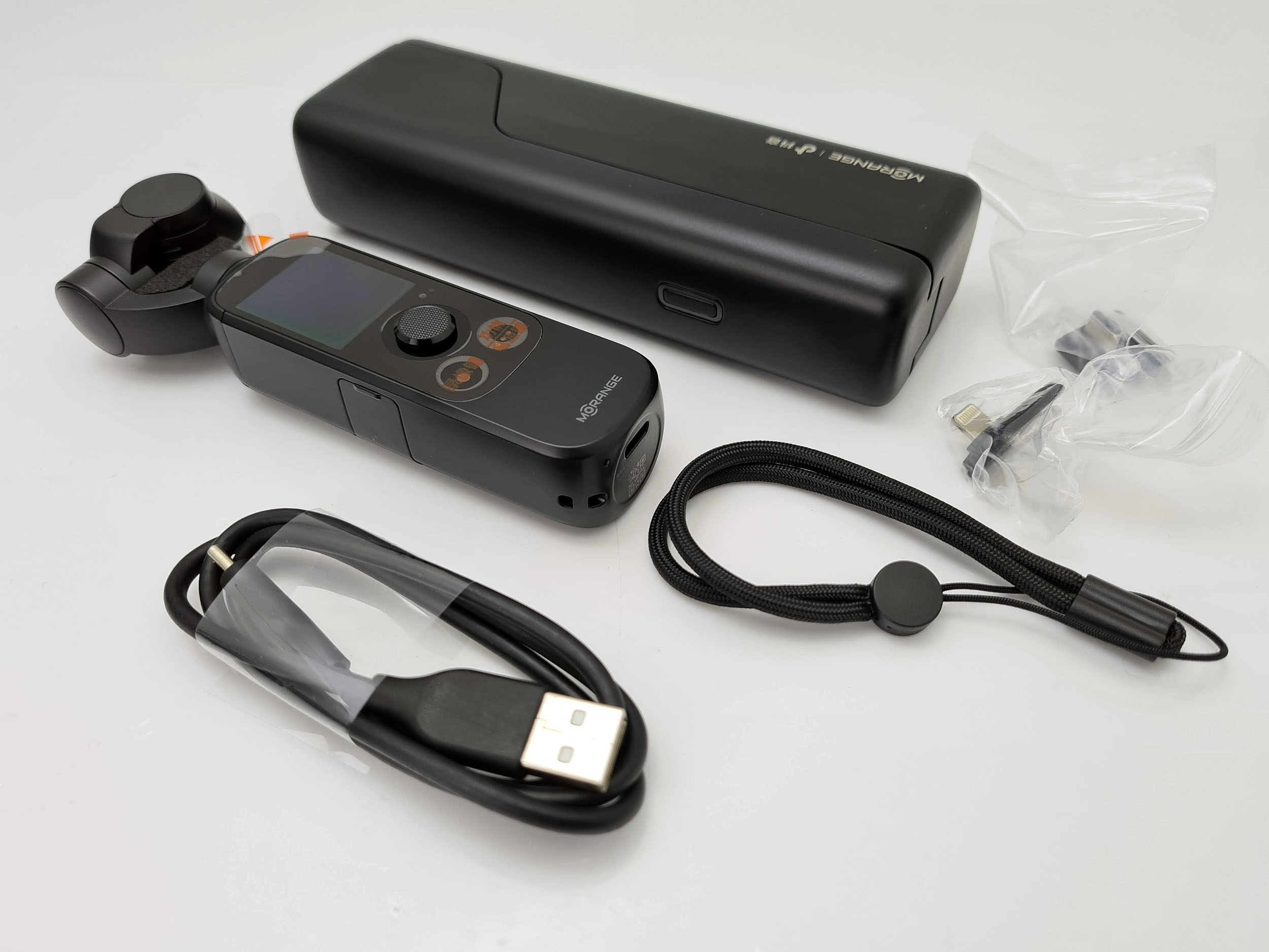 La boîte contient le stablisateur, les câbles et les connecteurs pour la recharge et un étui pour protéger la caméra. La boîte contient également un adaptateur USB pour connecter le Morange M1 Pro directement à votre smartphone. Dans cette configuration, vous pouvez utiliser l'application Morange pour contrôler le stabilisateur vidéo.