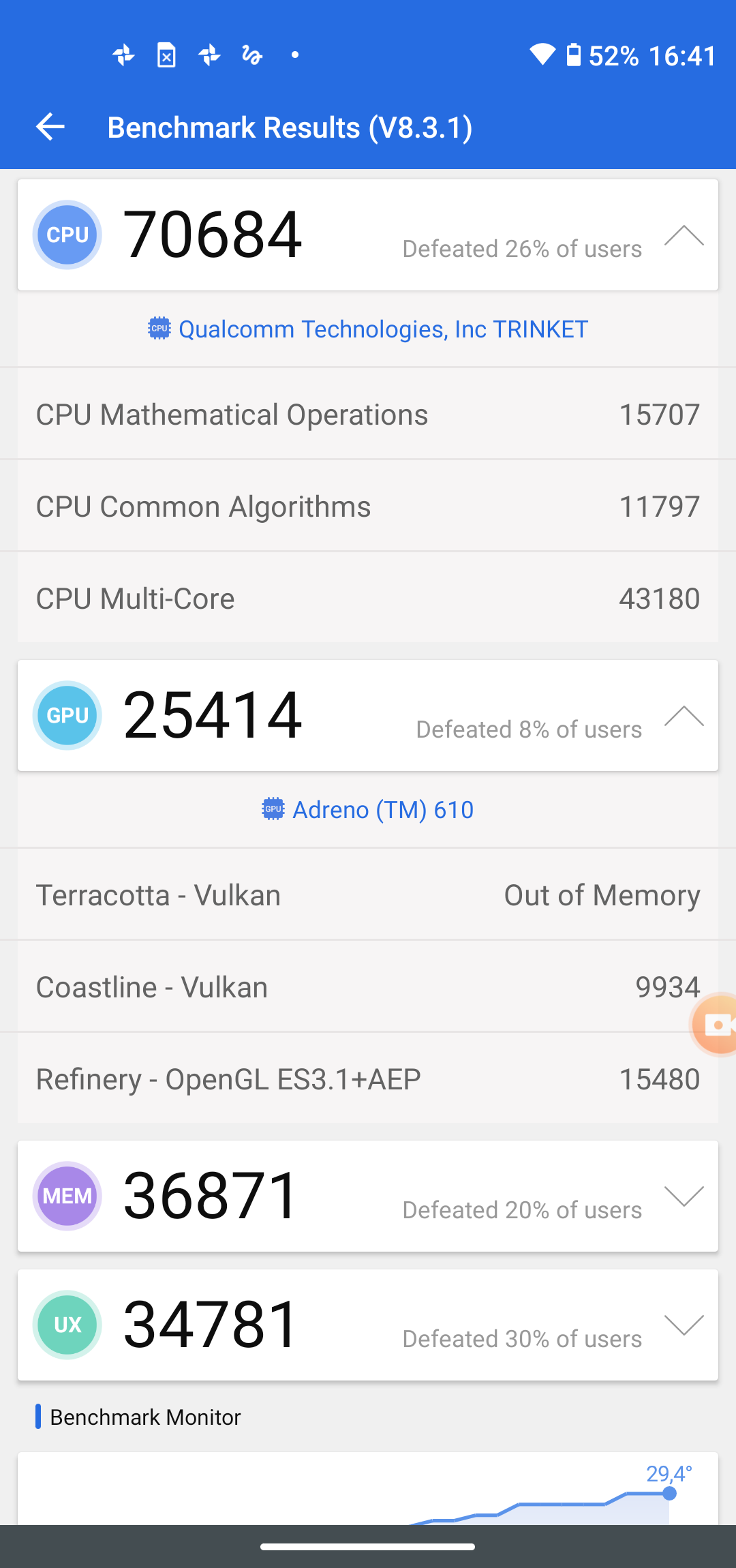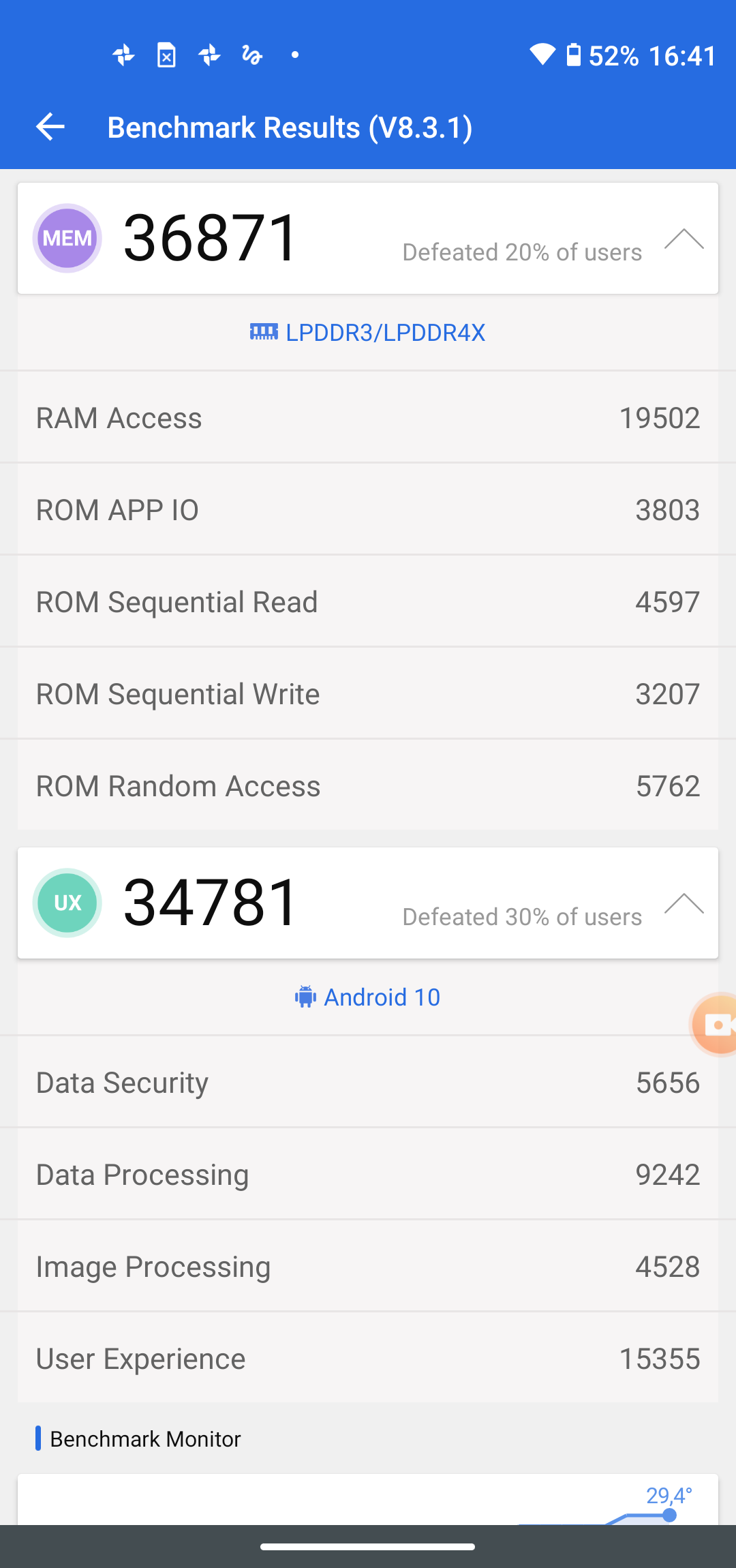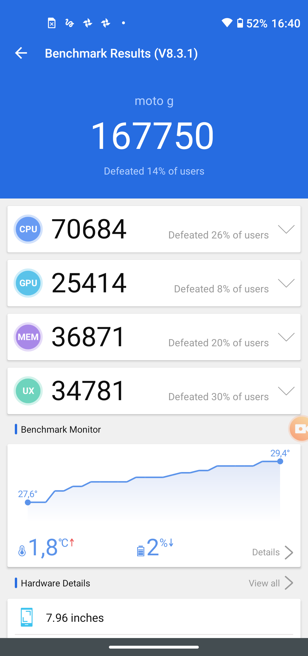 Avec Antutu, j'obtiens un score de 167750 points, c'est légèrement moins que ce que j'ai obtenu avec un Redmi Note 8. Sans tenir compte du prix du Motorola, la combinaison CPU + GPU est une bonne combinaison qui conviendra à une grande majorité d'utilisateurs mais je prends le prix en compte, le rapport prix / performance du Motorola est inférieur à ce que le Redmi Note 8 peut offrir.