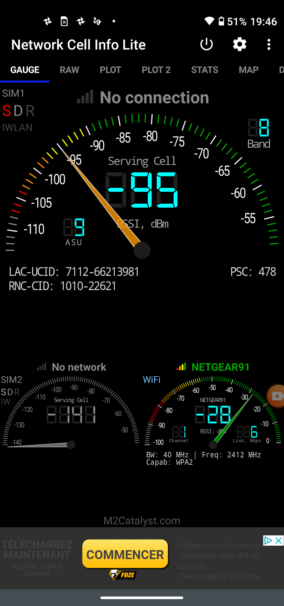 Pour tester la capacité d'un téléphone à bien capter le réseau j'effectue des mesures à proximité de mon routeur et ensuite à distance (et toujours dans les mêmes conditions). J'obtiens ainsi une moyenne en dBm où une valeur de -90 dBm indique une moins bonne performance qu'une valeur à -30 dBm.Signal Wifi: