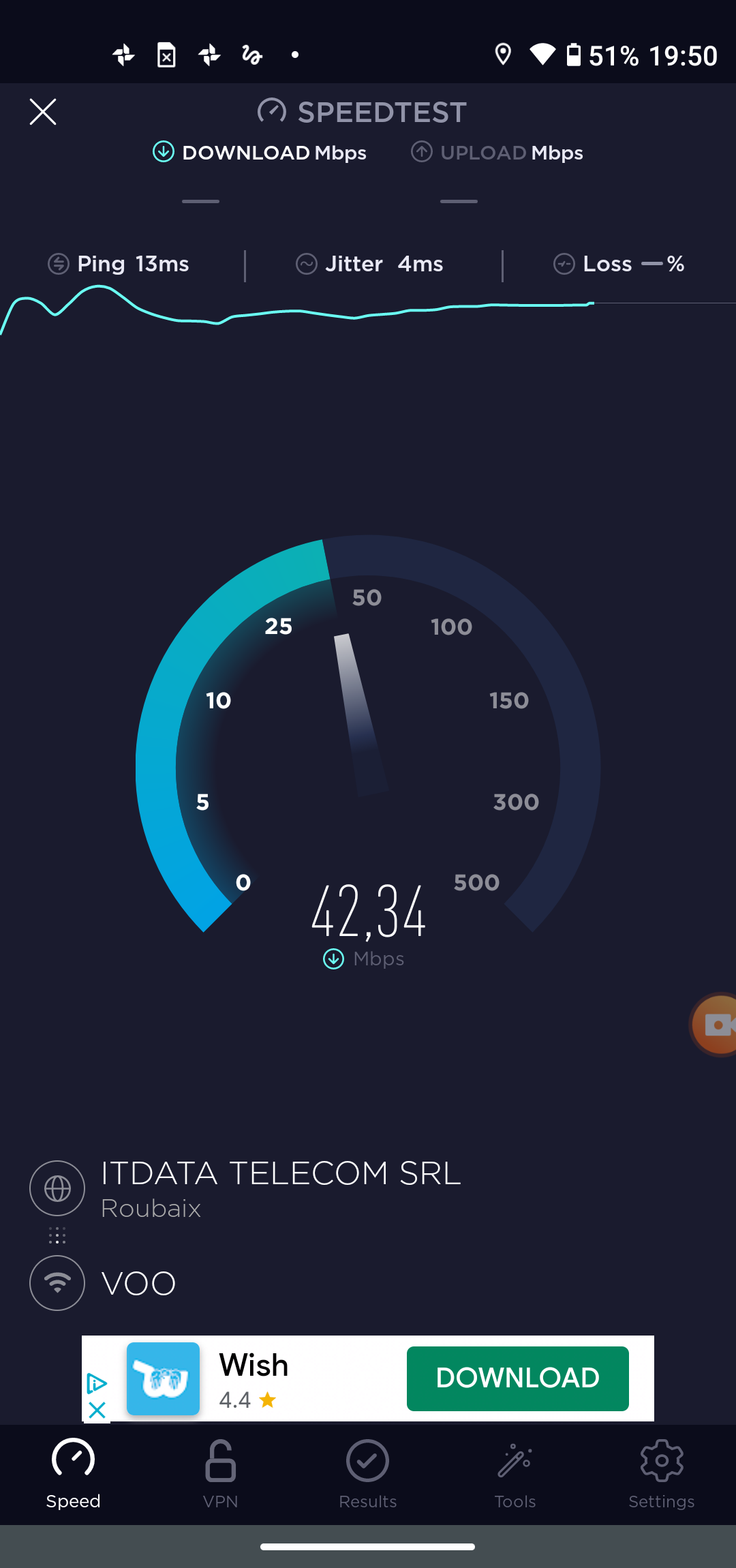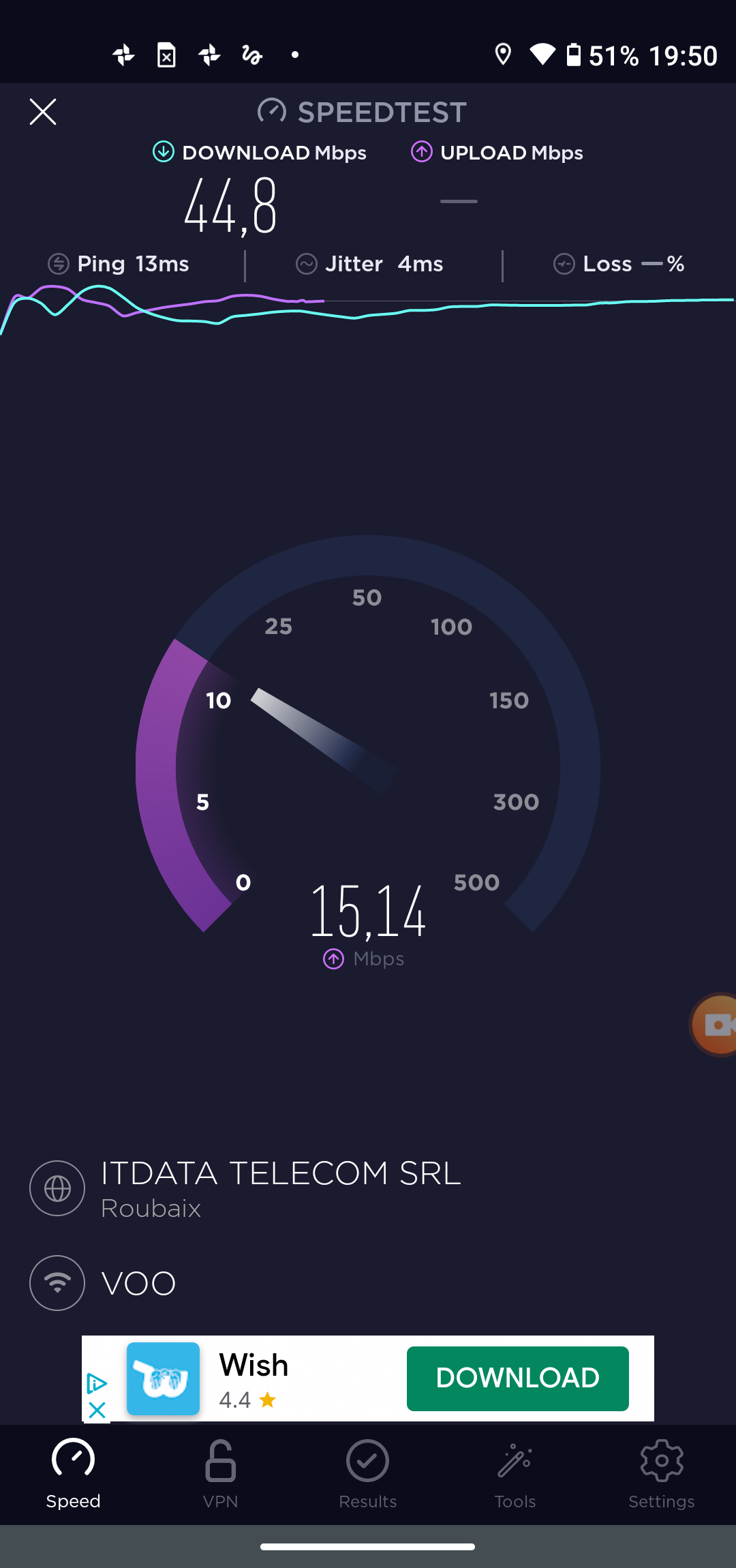 Pour tester la vitesse en Wifi, je me connecte à mon routeur en 2.4Ghz et 5Ghz (si disponible) et j'utilise l'application de Ookla pour mesurer la vitesse.Le Motorola G8 Power n'est pas compatible avec la fréquence 5Ghz, c'est assez rare de nos jours car la plupart des téléphones supportent cette fréquence. Le téléphone doit donc se contenter de la fréquence 2.4Ghz et cela affecte directement sa vitesse de téléchargement. J'ai obtenu un score de 47 Mbps, il y a deux ans j'aurais pu considérer qu'un tel score était acceptable mais aujourd'hui, ce genre de vitesse est très inférirure à ce que vous pouvez obtenir avec d'autres téléphones dans la même gamme de prix. Un Redmi Note 9s fait 4 fois mieux.