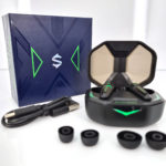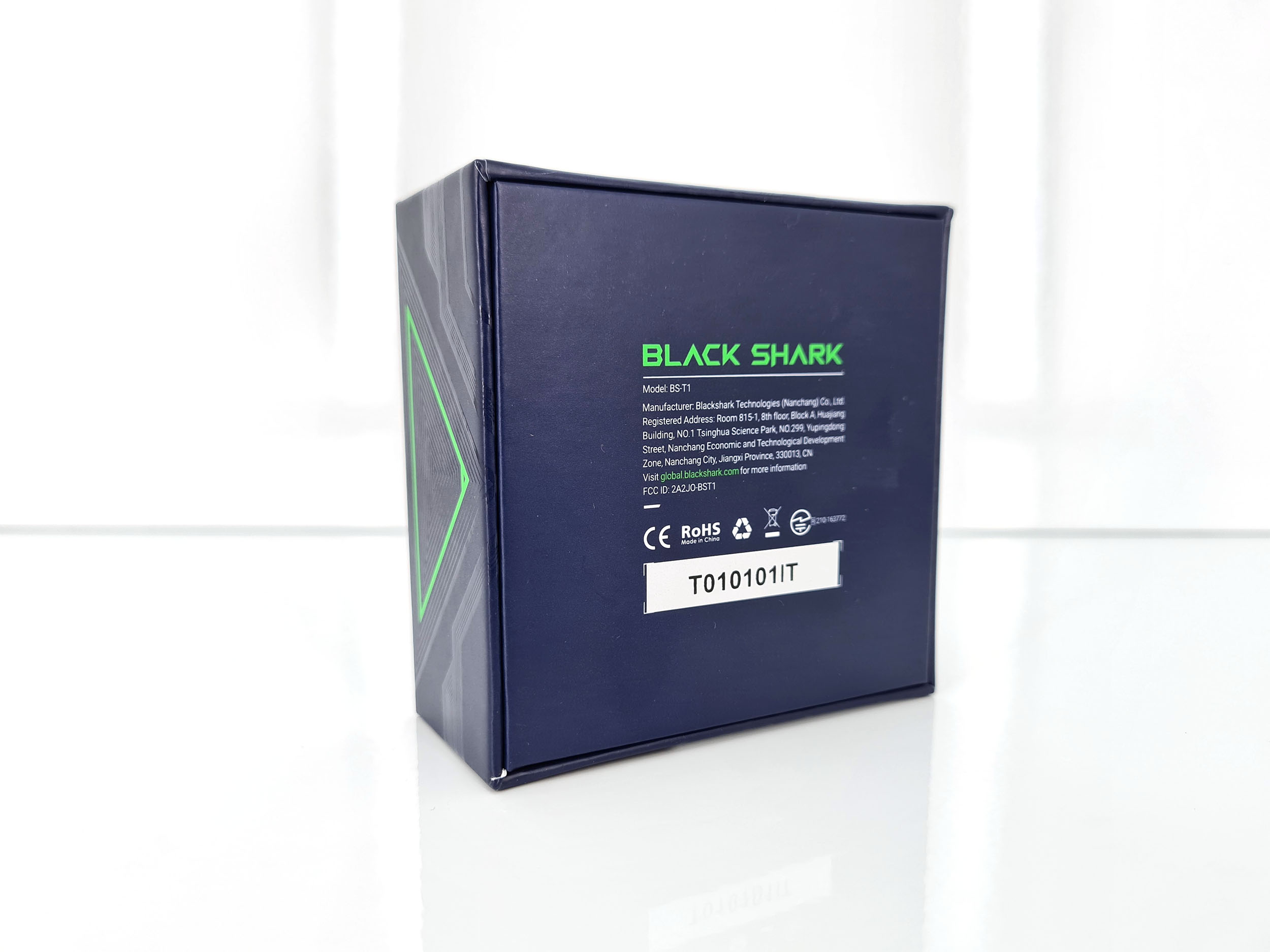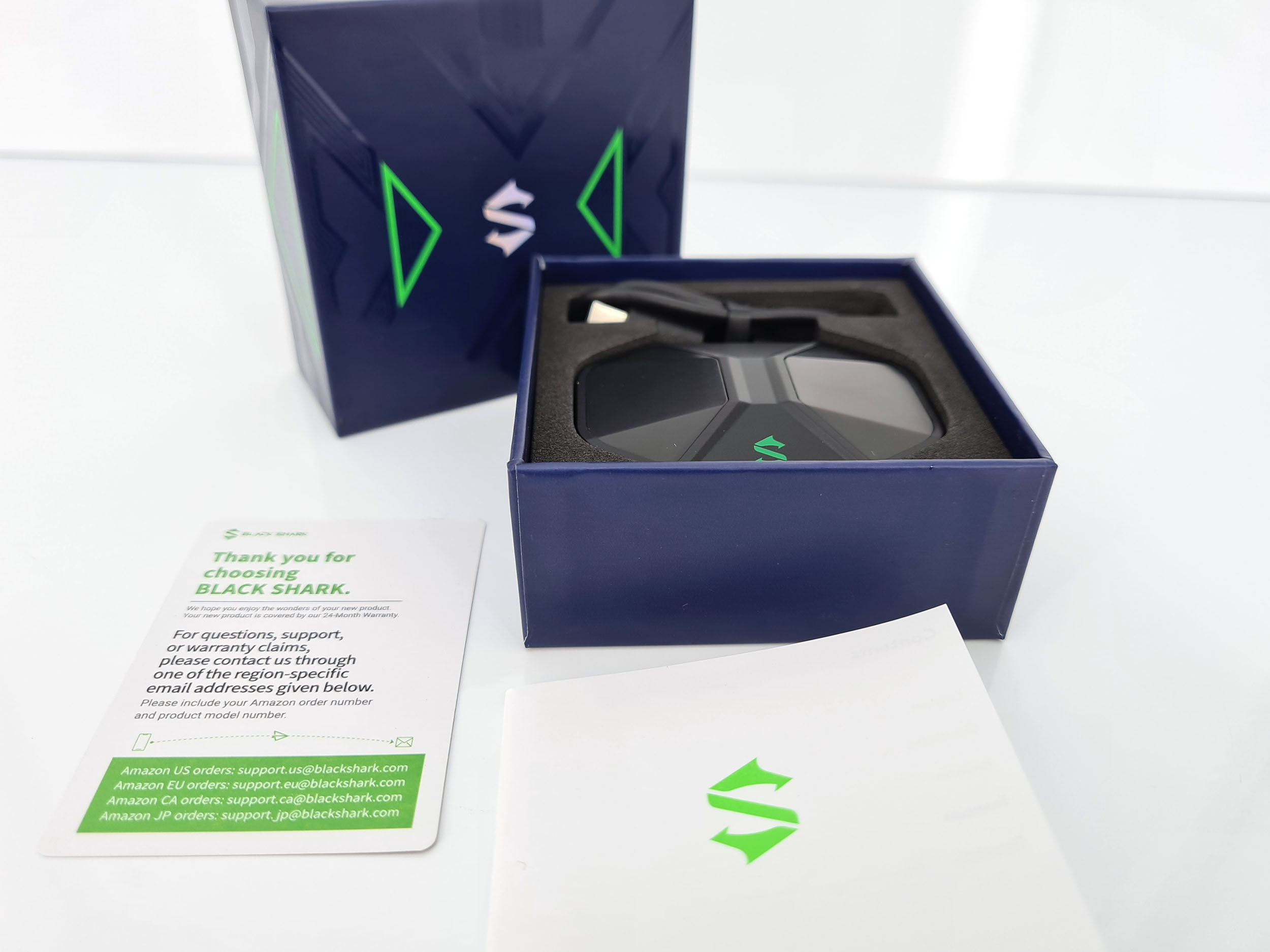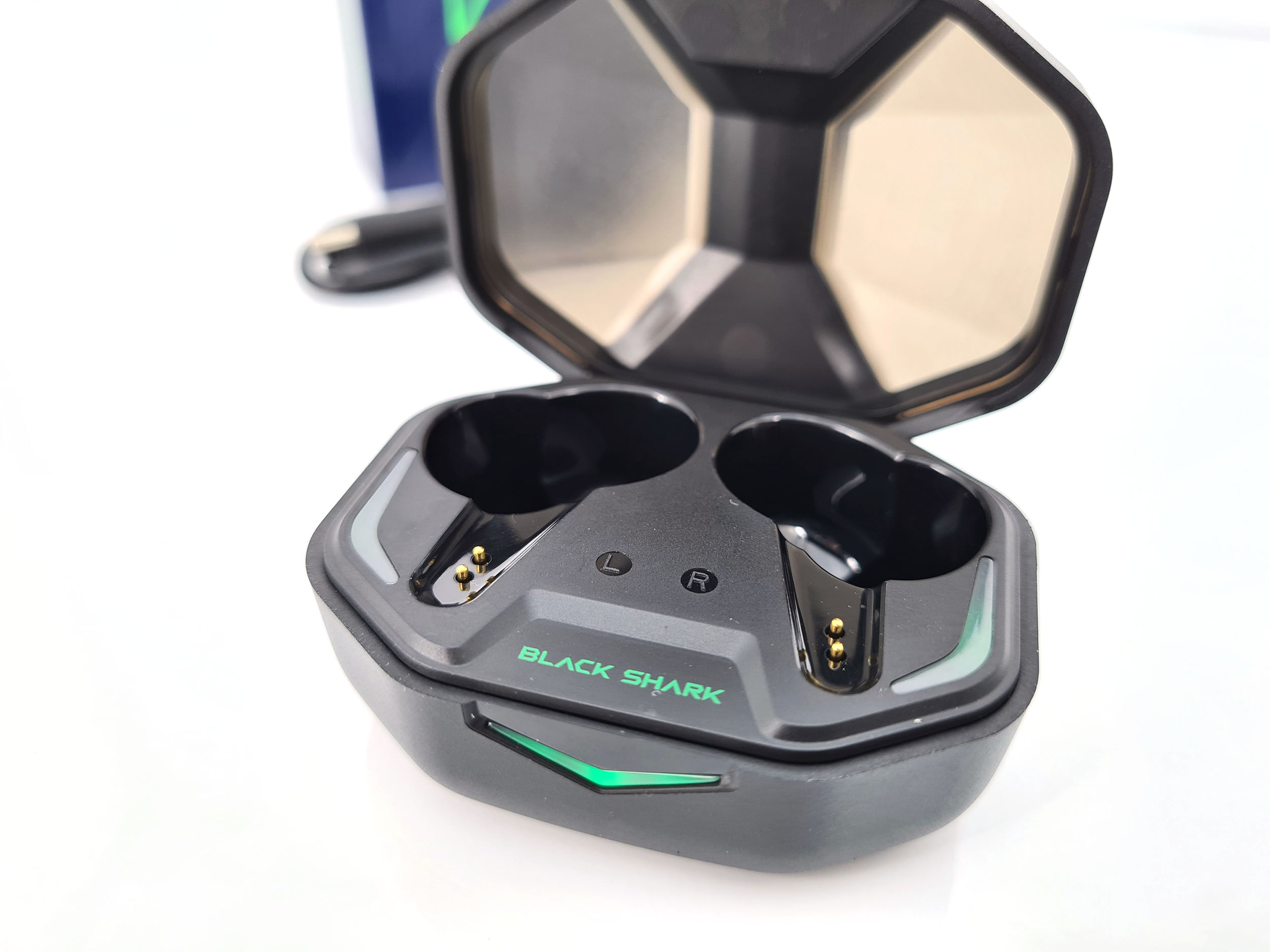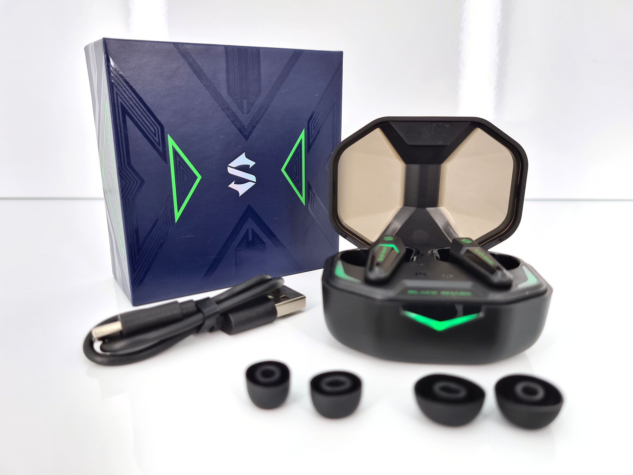 L'univers Black Shark est un univers sombre fait de noir, bleu foncé et vert. On retrouve cette identité sur tous leurs produits, c'est une marque qui a une certaine maturité dans son identité et je suppose que les fans se retrouvent donc plus facilement dans leur marque de gaming. La boite contient le boitier contenant les écouteurs et qui sert aussi à les recharger, la boite contient également un cable USB pour recharger le boitier et des coussinets de différentes tailles pour pouvoir adapter la position des écouteurs à vos oreilles.