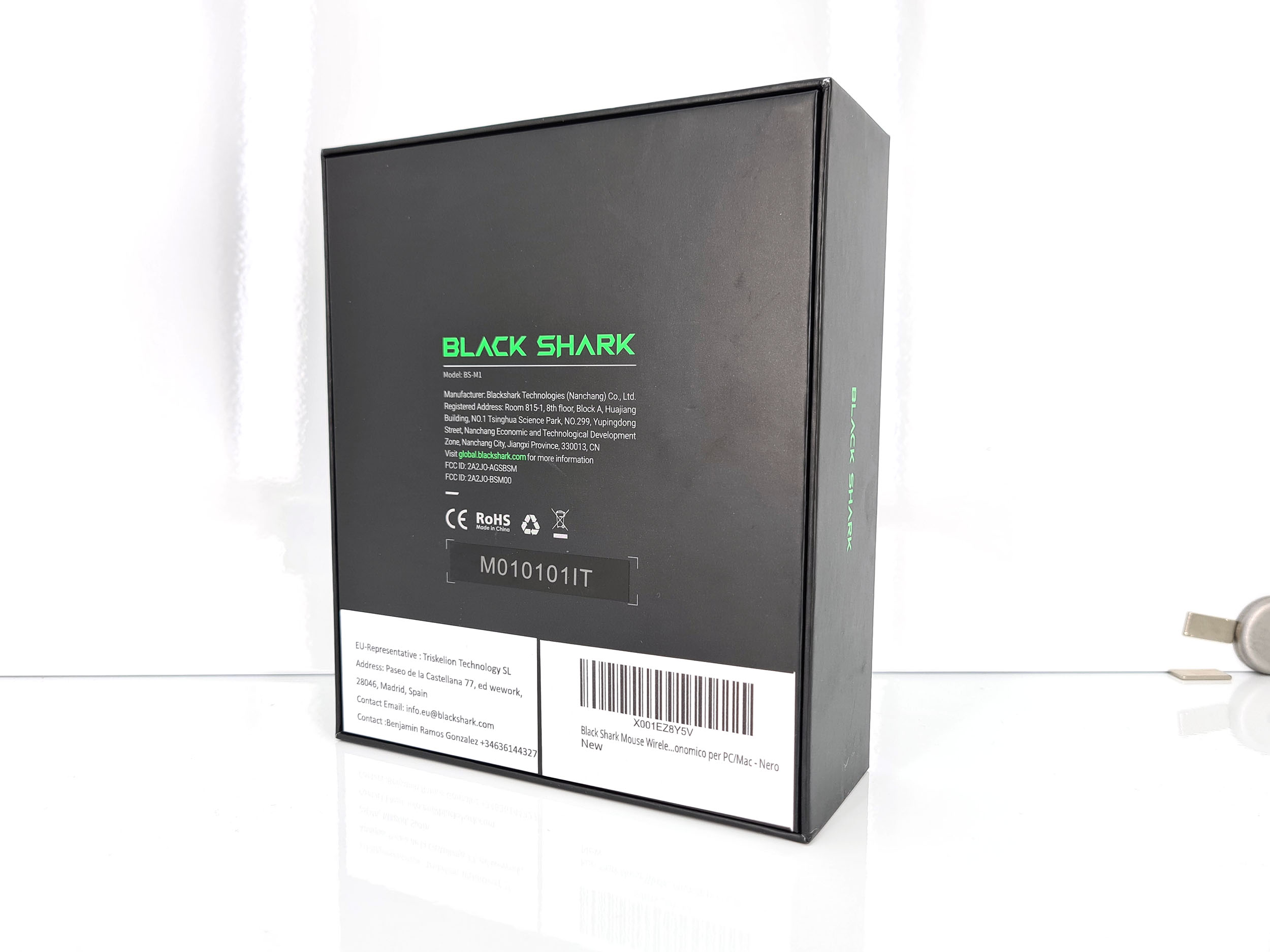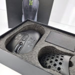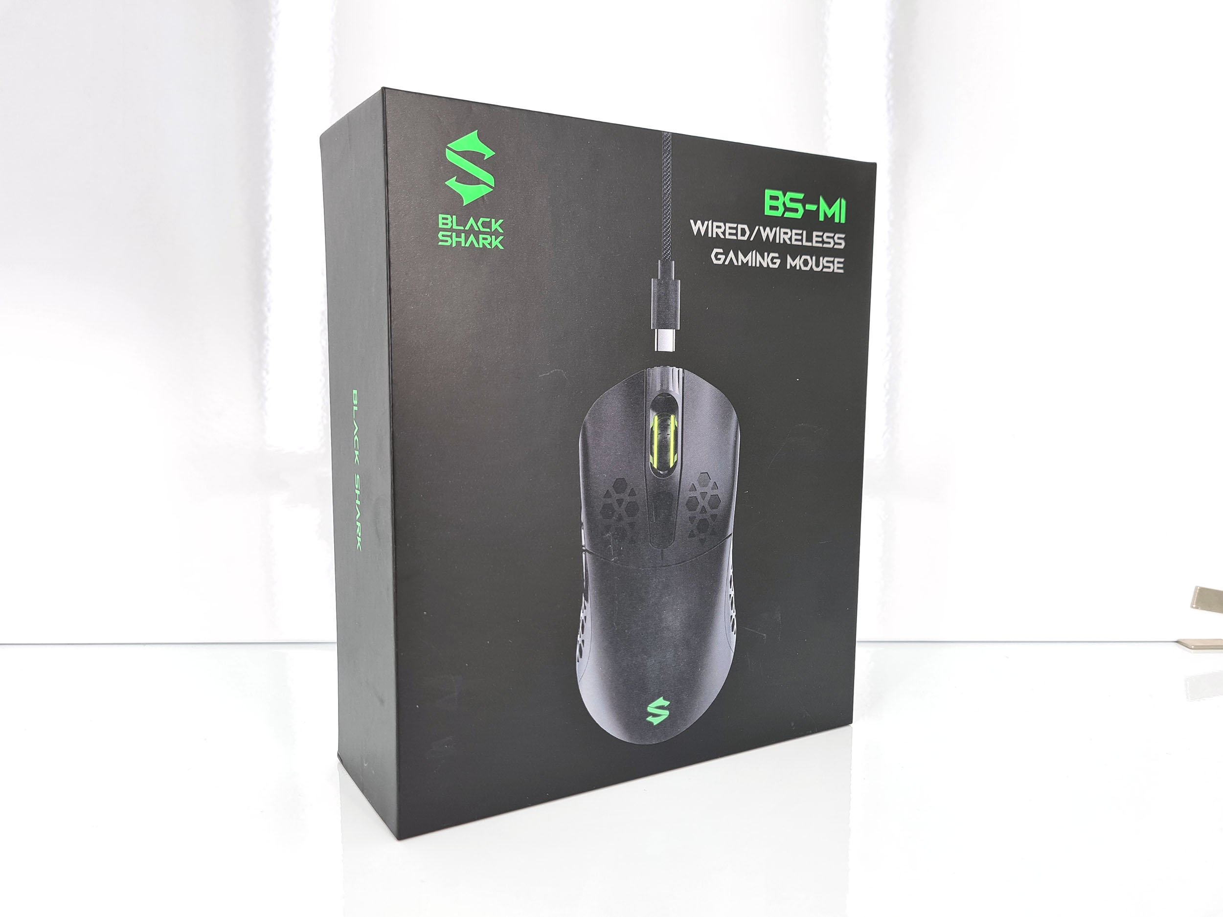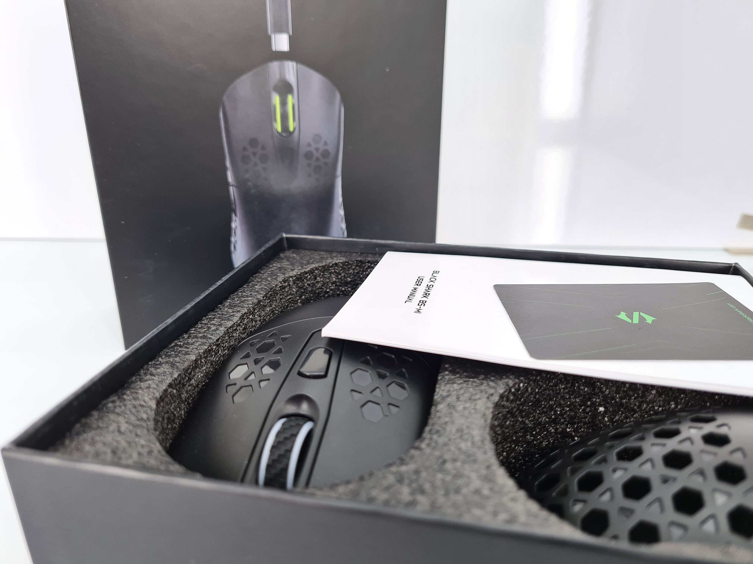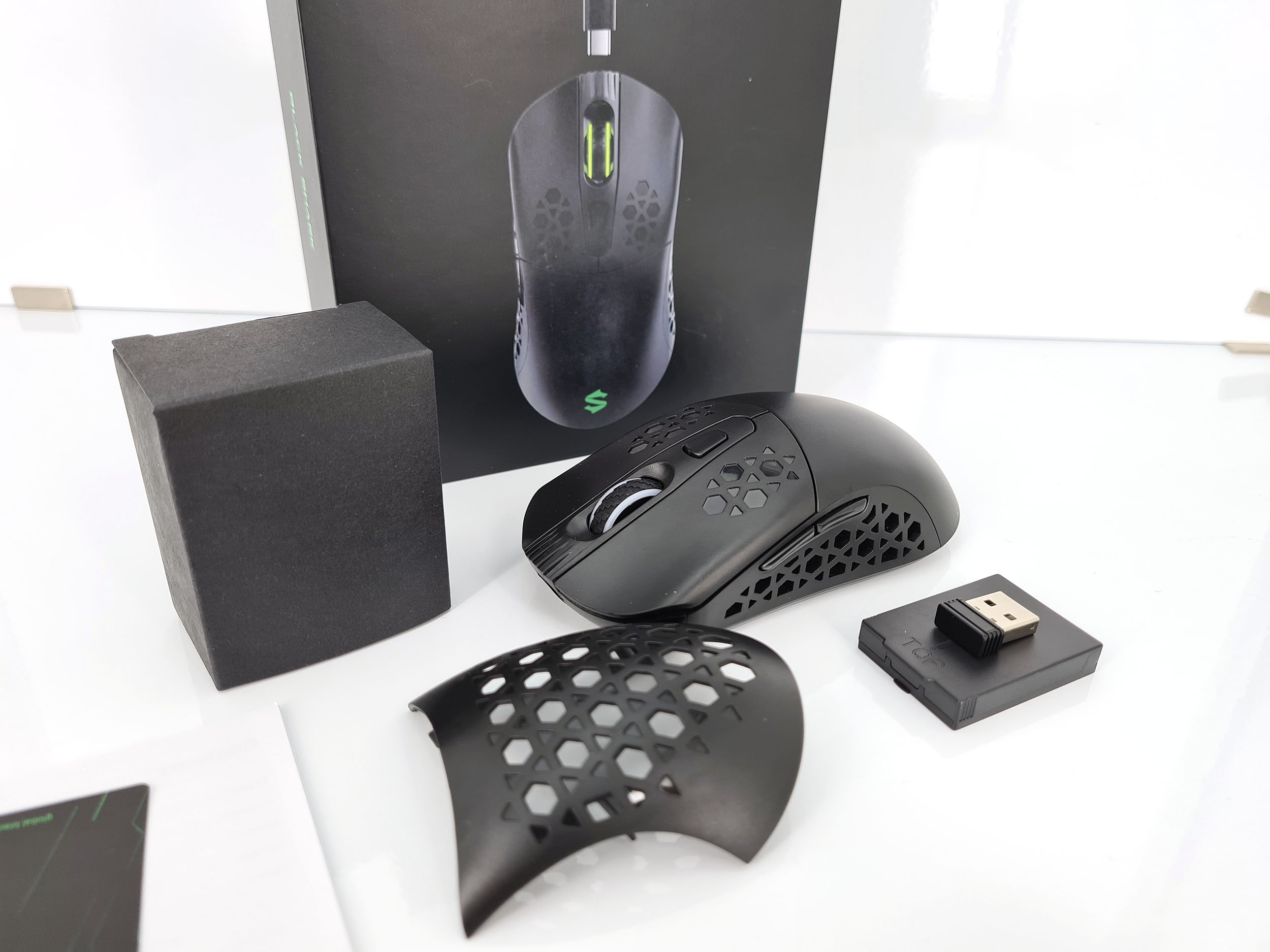 La boite de la Black Shark gaming mouse reprend les codes de la marque avec une prédominance de noir et de vert. La boite contient la souris placée dans un épais emballage de mousse noire, une batterie, une coque alvéolée, un connecteur sans fil, un cable USB en nylon et un manuel. L'emballage pourrait laisser penser qu'il s'agit une souris premium mais avec un prix aux alentours de 30 euros, c'est une souris d'entrée de gamme.