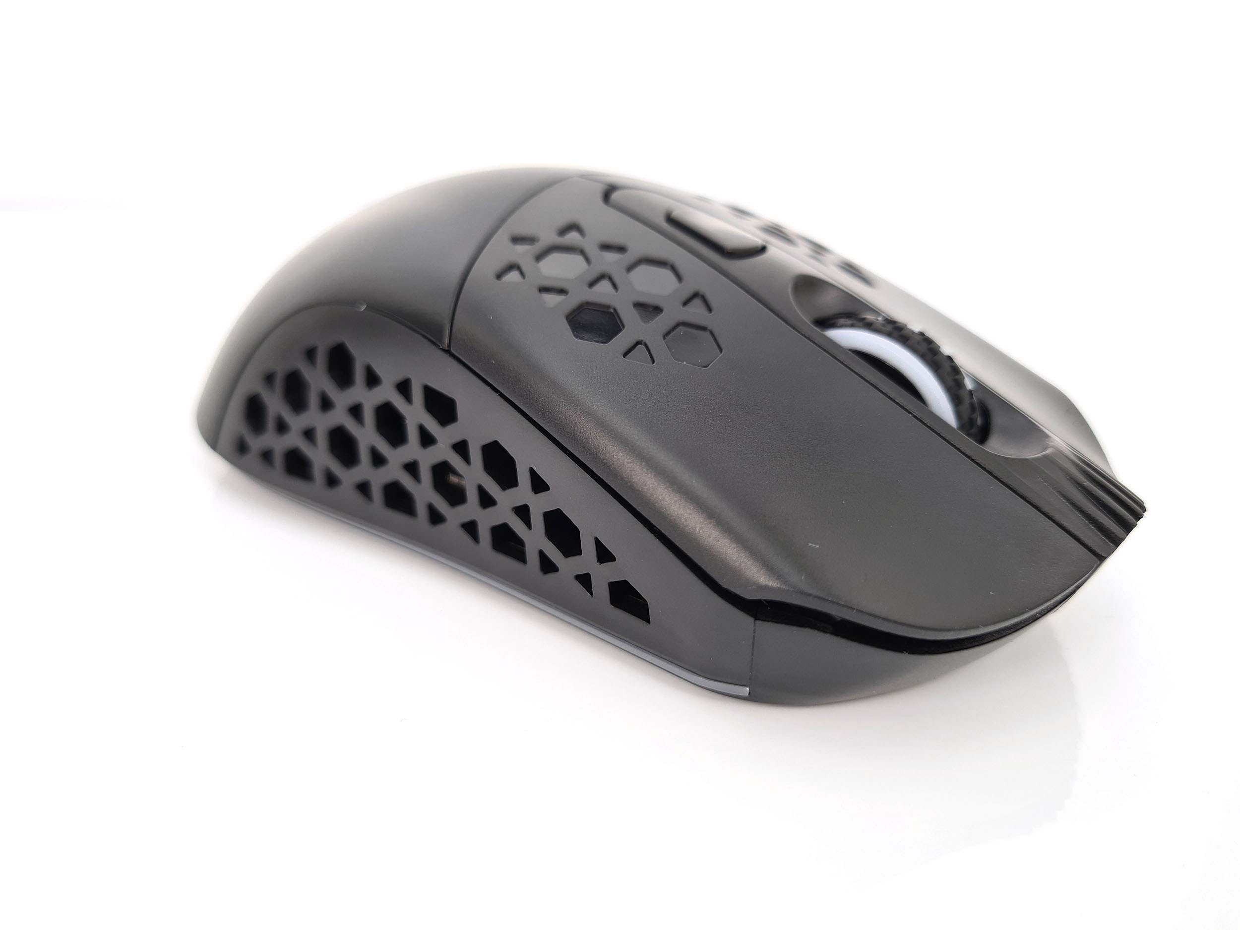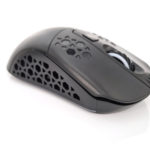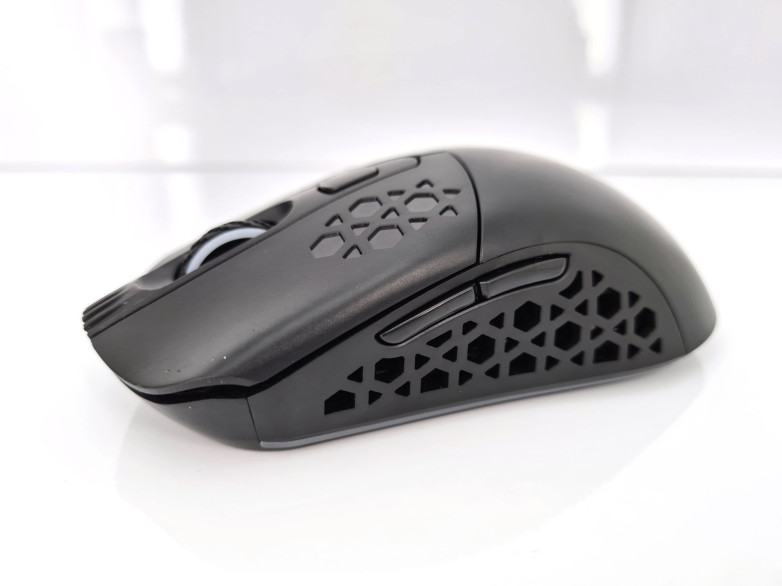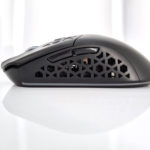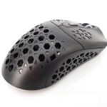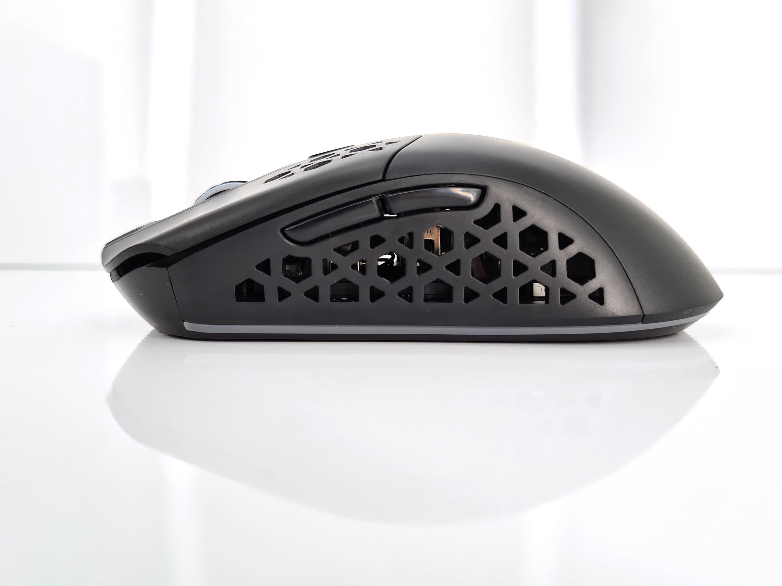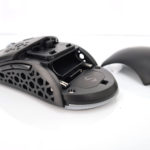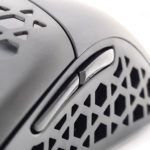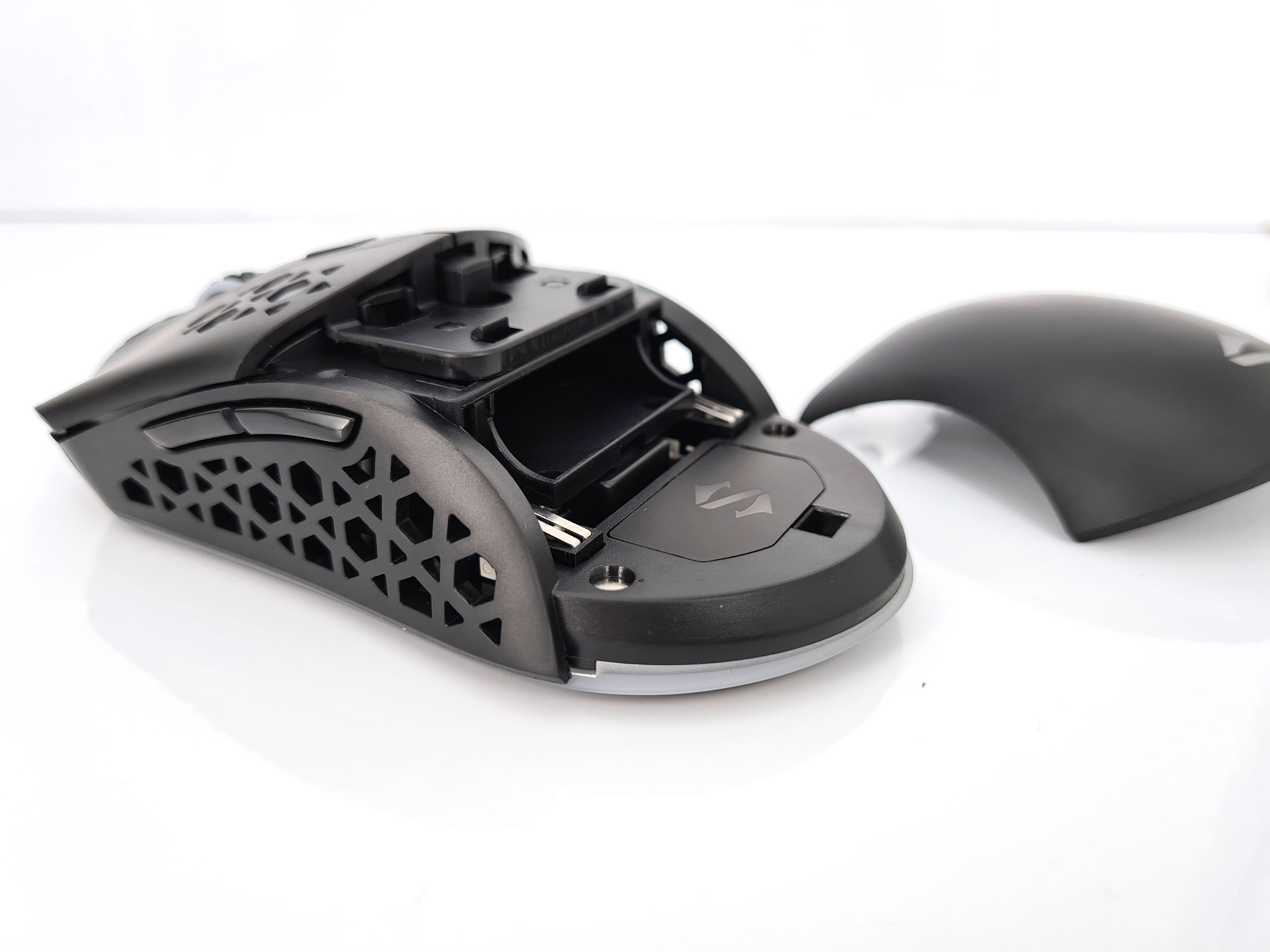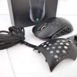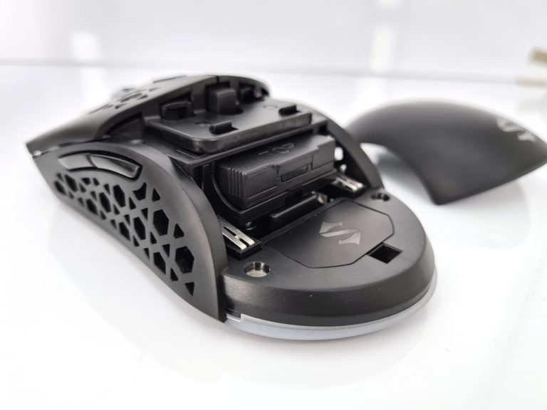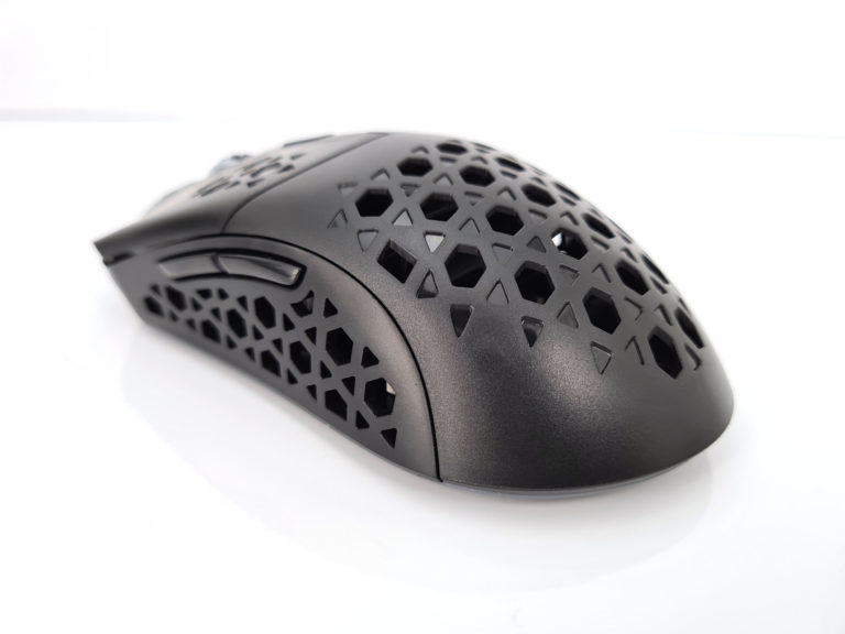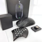 La forme et la taille de cette souris sont assez classiques, les souris de gamers sont souvent plus grandes et ont un design beaucoup plus anguleux. La souris est principalement composée de plastique noir mat avec une structure alvéolaire sur les côté et sur les boutons. Vous pouvez remplacer la surface lisse à l'arrière de la souris par une coque en structure alvéolée si vous préférez une souris avec un design différent. J'ai préféré laissé la coque de base car la structure alvéolée risque fort de laisser passer toutes sortes de dépots (poussière, peau,...) à l'intérieur de la souris.