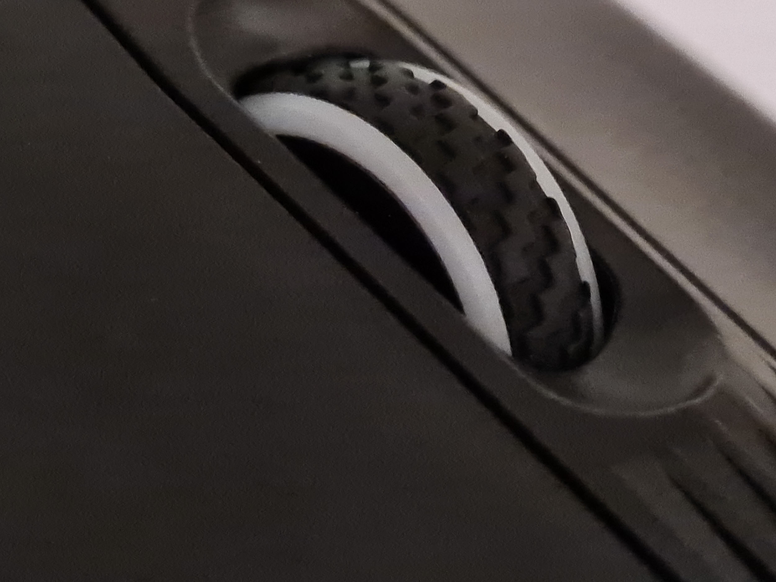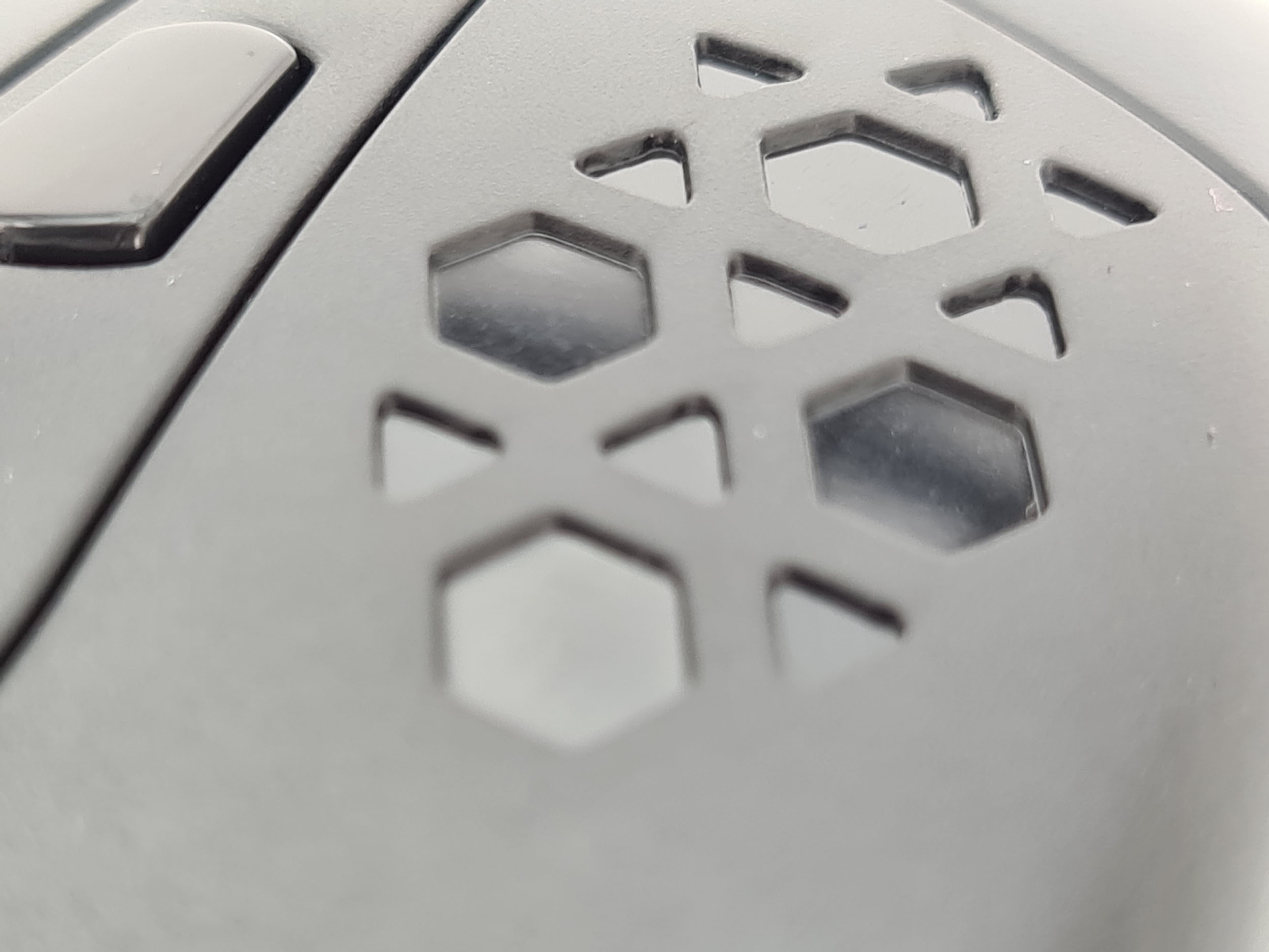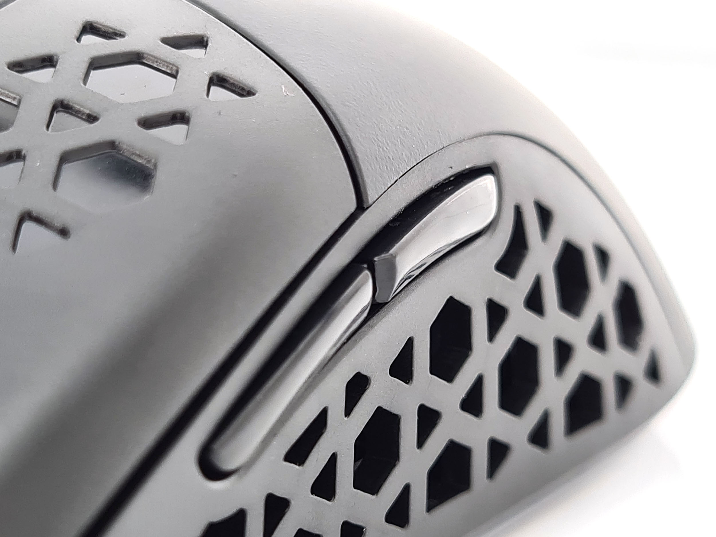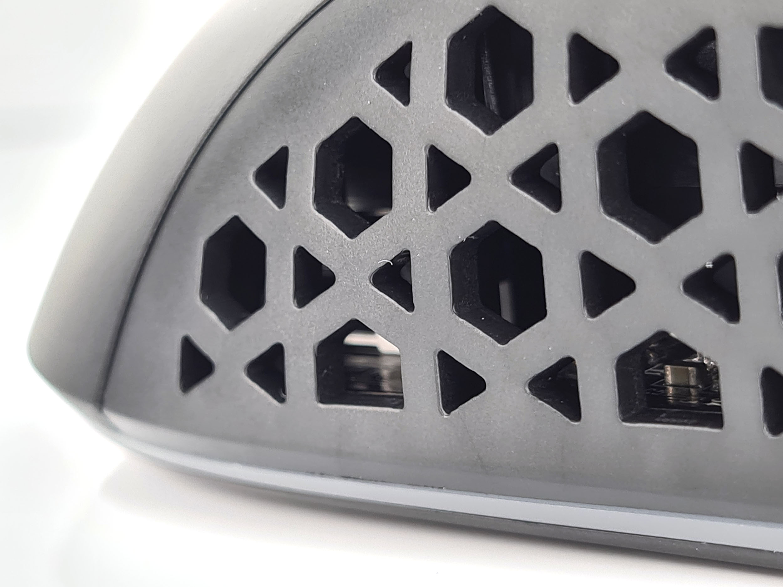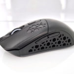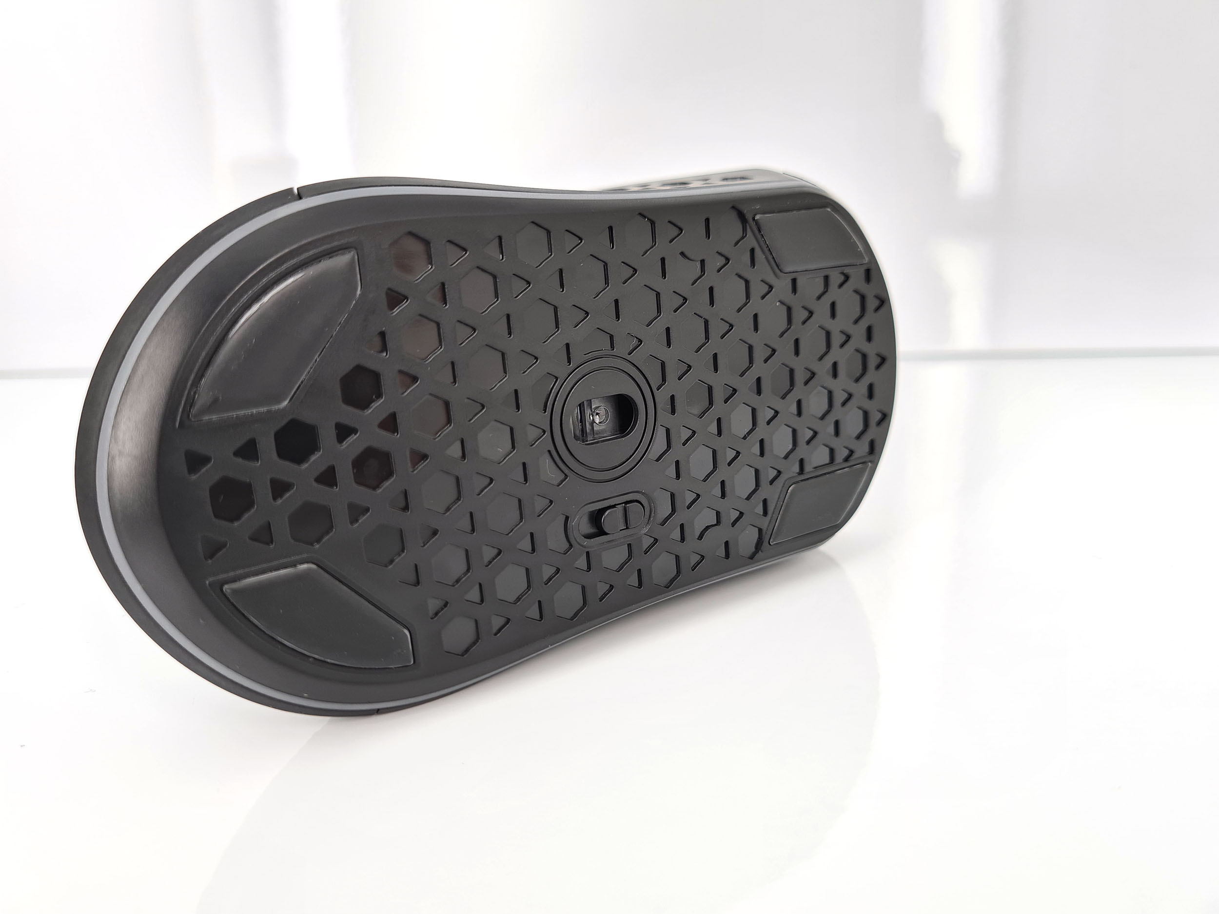 La forme et la taille de cette souris sont assez classiques, les souris de gamers sont souvent plus grandes et ont un design beaucoup plus anguleux. La souris est principalement composée de plastique noir mat avec une structure alvéolaire sur les côté et sur les boutons. Vous pouvez remplacer la surface lisse à l'arrière de la souris par une coque en structure alvéolée si vous préférez une souris avec un design différent. J'ai préféré laissé la coque de base car la structure alvéolée risque fort de laisser passer toutes sortes de dépots (poussière, peau,...) à l'intérieur de la souris.