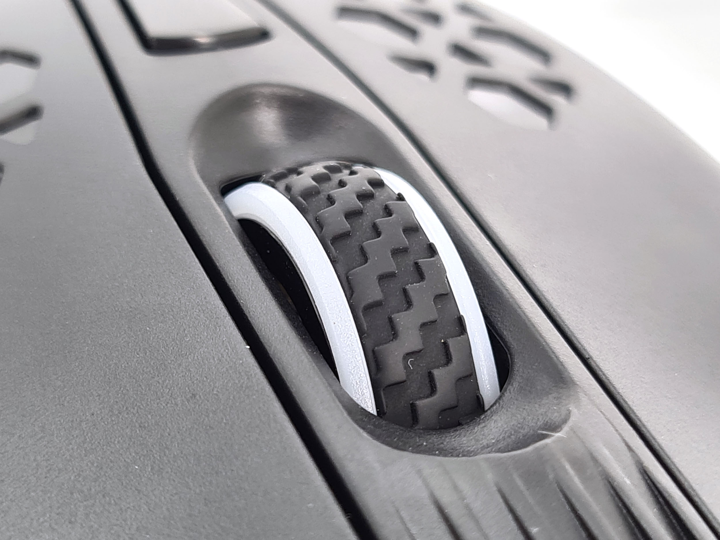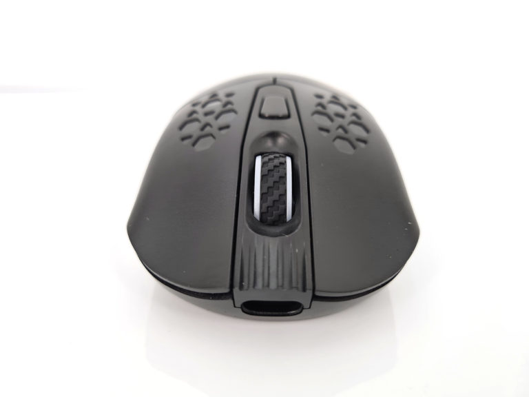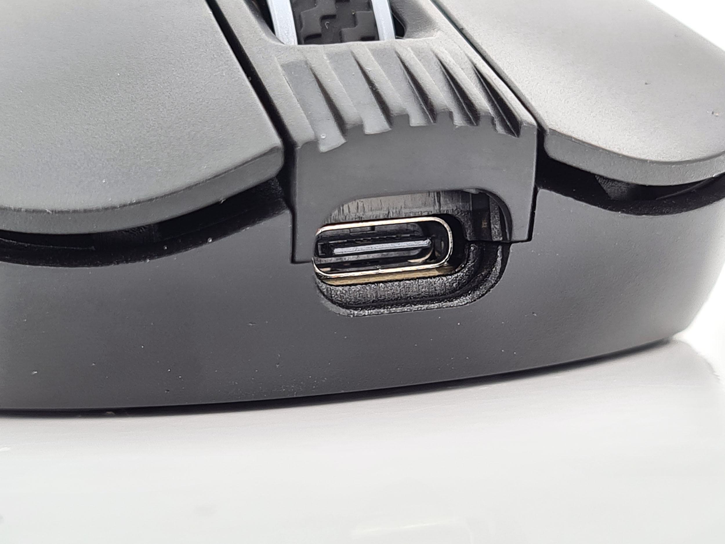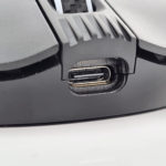 Sur la partie avant on retrouve les habituels boutons gauche/droite, une roulette au milieu et un bouton personnalisable derrière la roulette. Il y a également un port USB C à l'avant qui permet de recharger la souris.