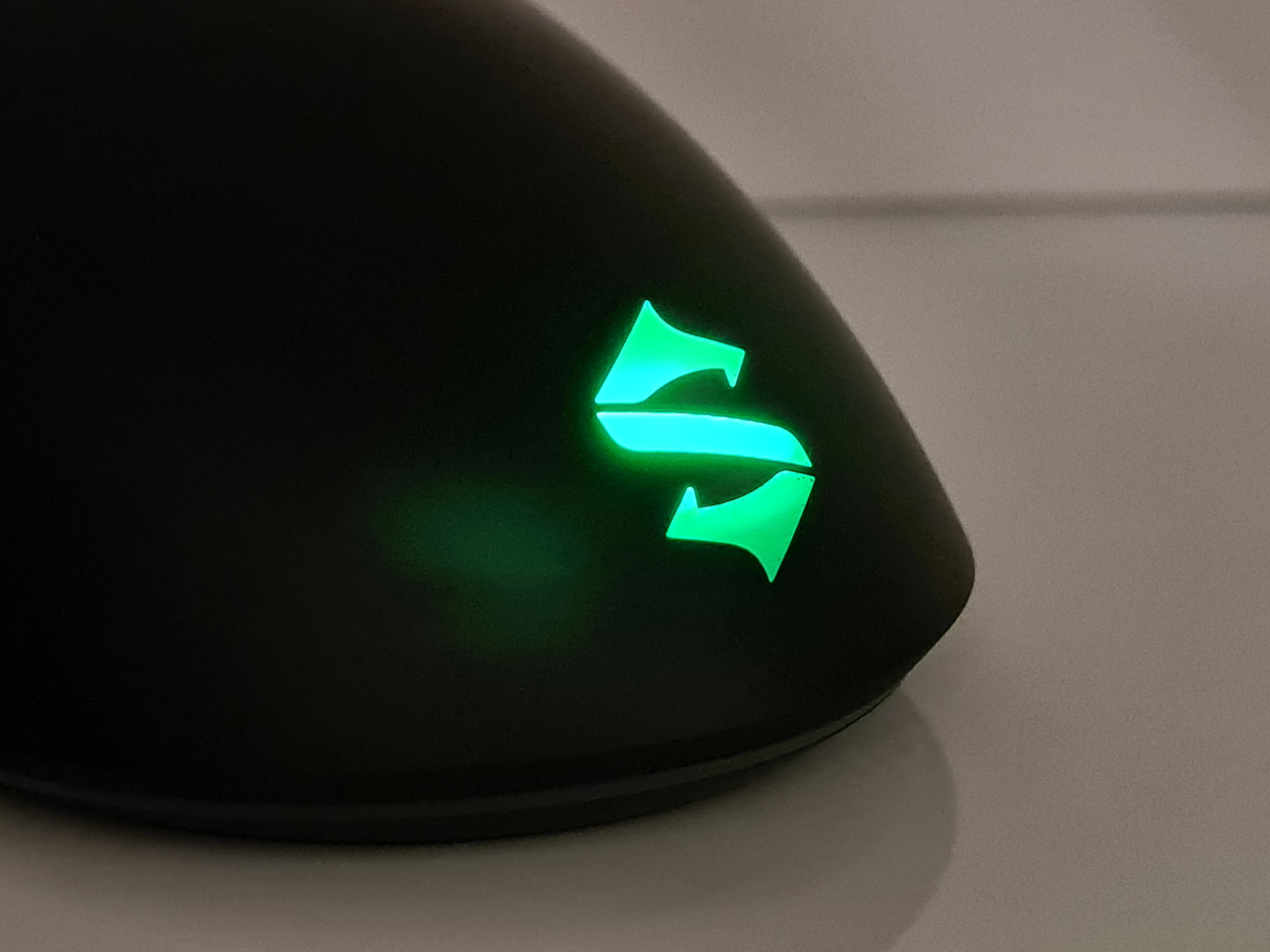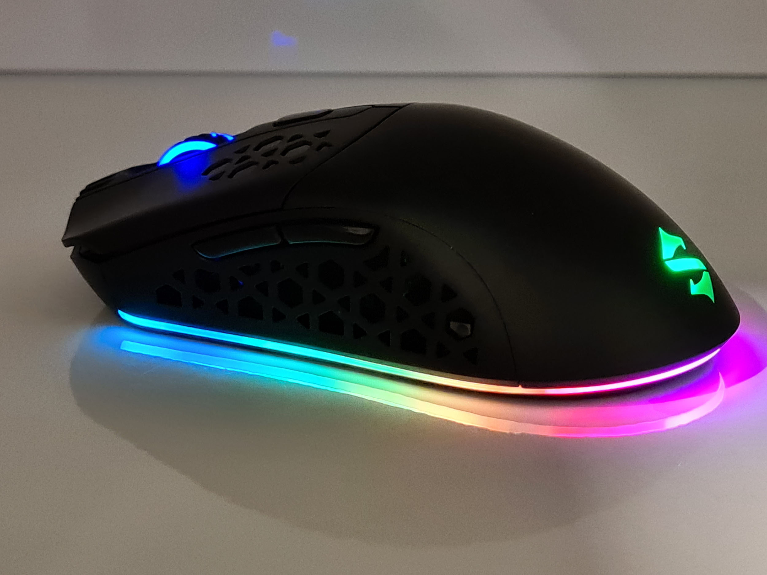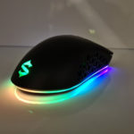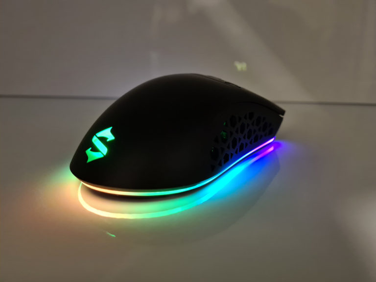 La souris est éclairée à plusieurs endroits. Il y a le logo Black Shark à l'arrière qui reste allumé tout le temps, même quand la souris est en veille. La molette à l'avant est également éclairée et le dessous de la souris a un éclairage périphérique qui permet de détourer la souris avec la couleur de votre choix. Par défaut, la souris émet une lumière verte pour le logo et la molette et pour le contour, la souris vous offre un joli dégradé de toutes les couleurs. Ces couleurs peuvent également être personnalisées avec le logiciel Black Shark.