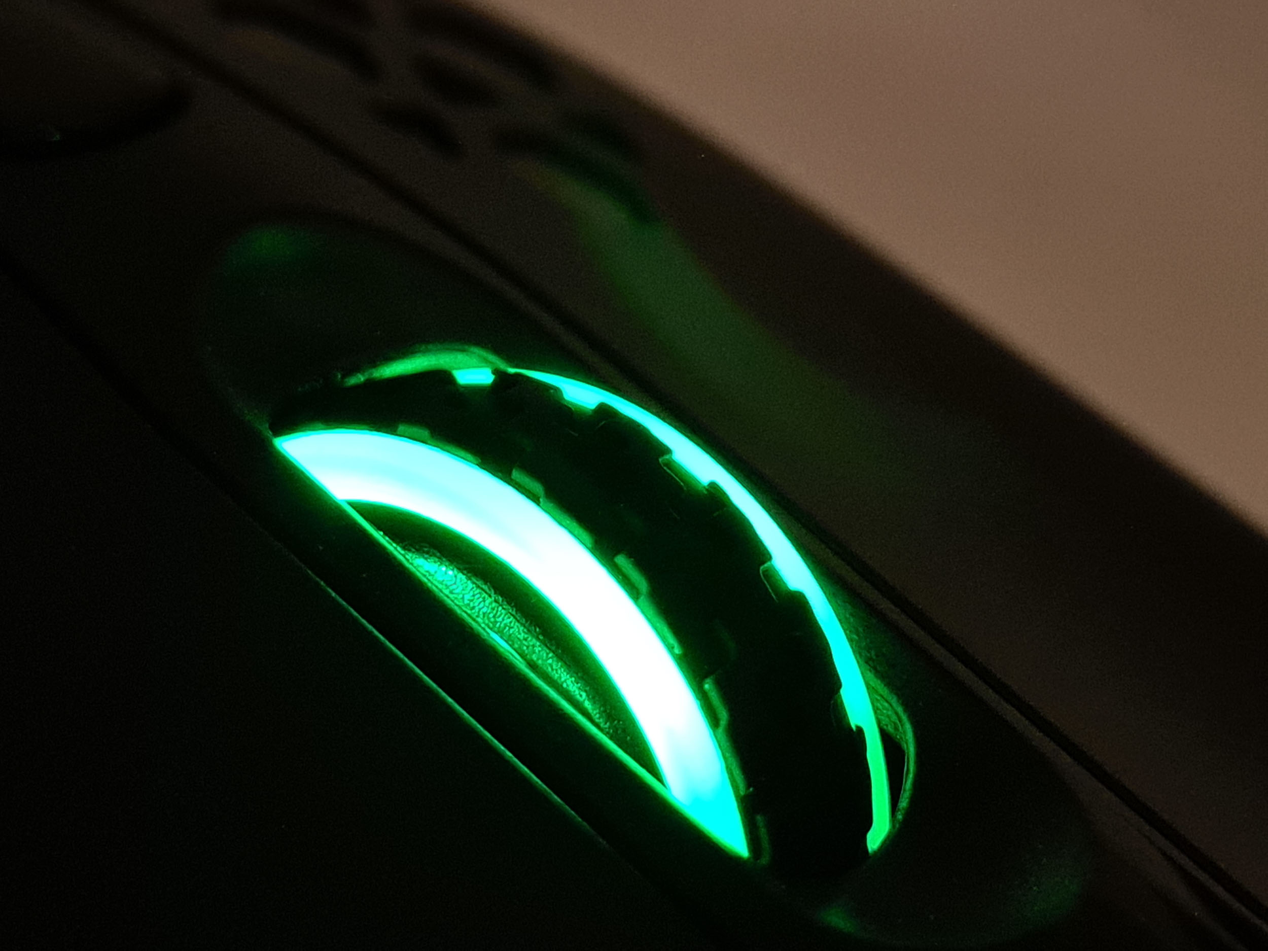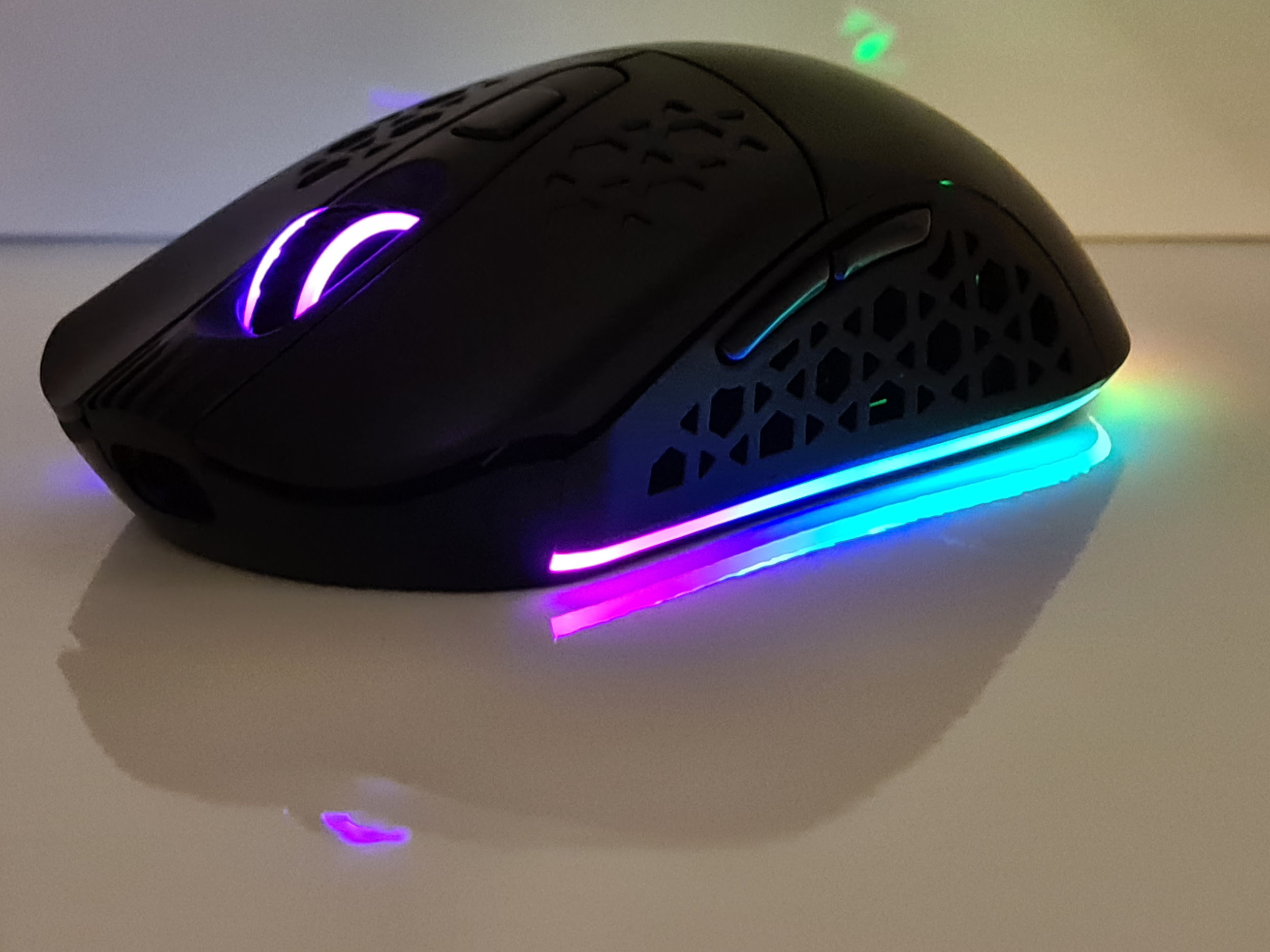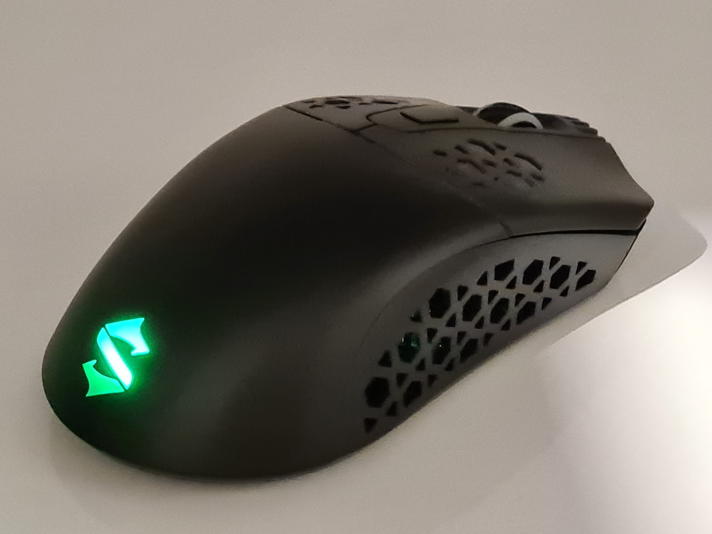La souris est éclairée à plusieurs endroits. Il y a le logo Black Shark à l'arrière qui reste allumé tout le temps, même quand la souris est en veille. La molette à l'avant est également éclairée et le dessous de la souris a un éclairage périphérique qui permet de détourer la souris avec la couleur de votre choix. Par défaut, la souris émet une lumière verte pour le logo et la molette et pour le contour, la souris vous offre un joli dégradé de toutes les couleurs. Ces couleurs peuvent également être personnalisées avec le logiciel Black Shark.
