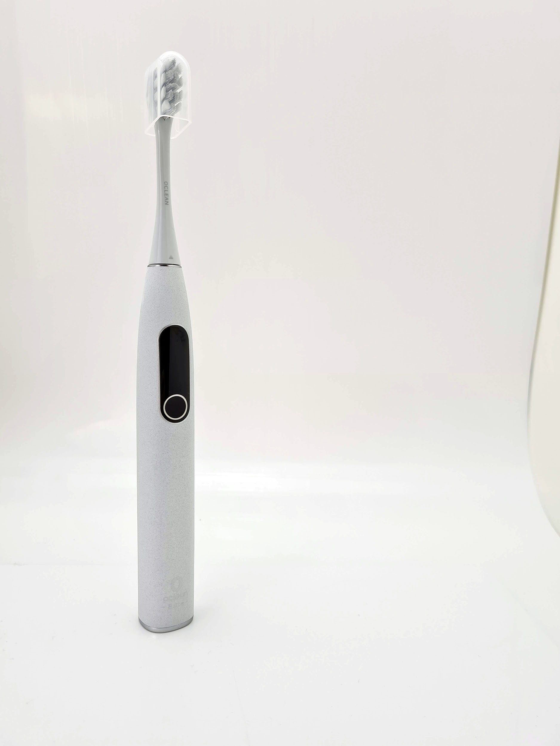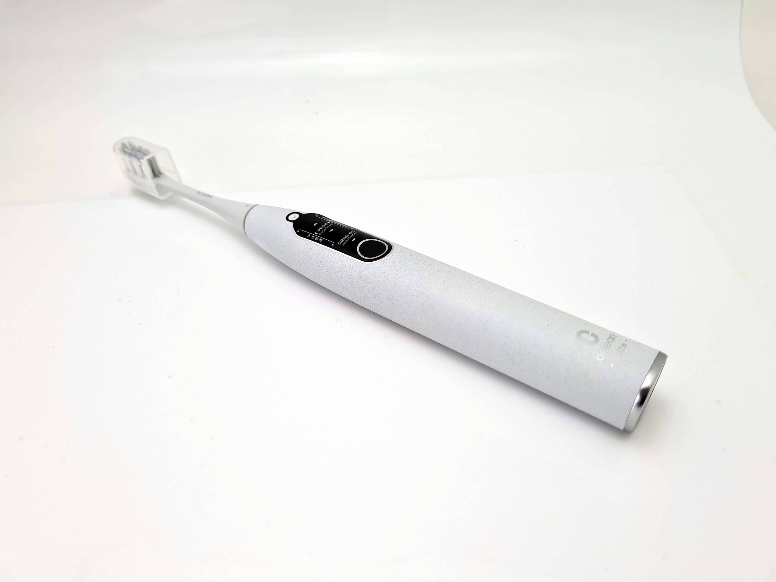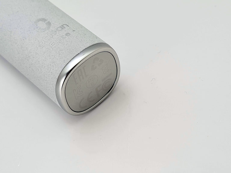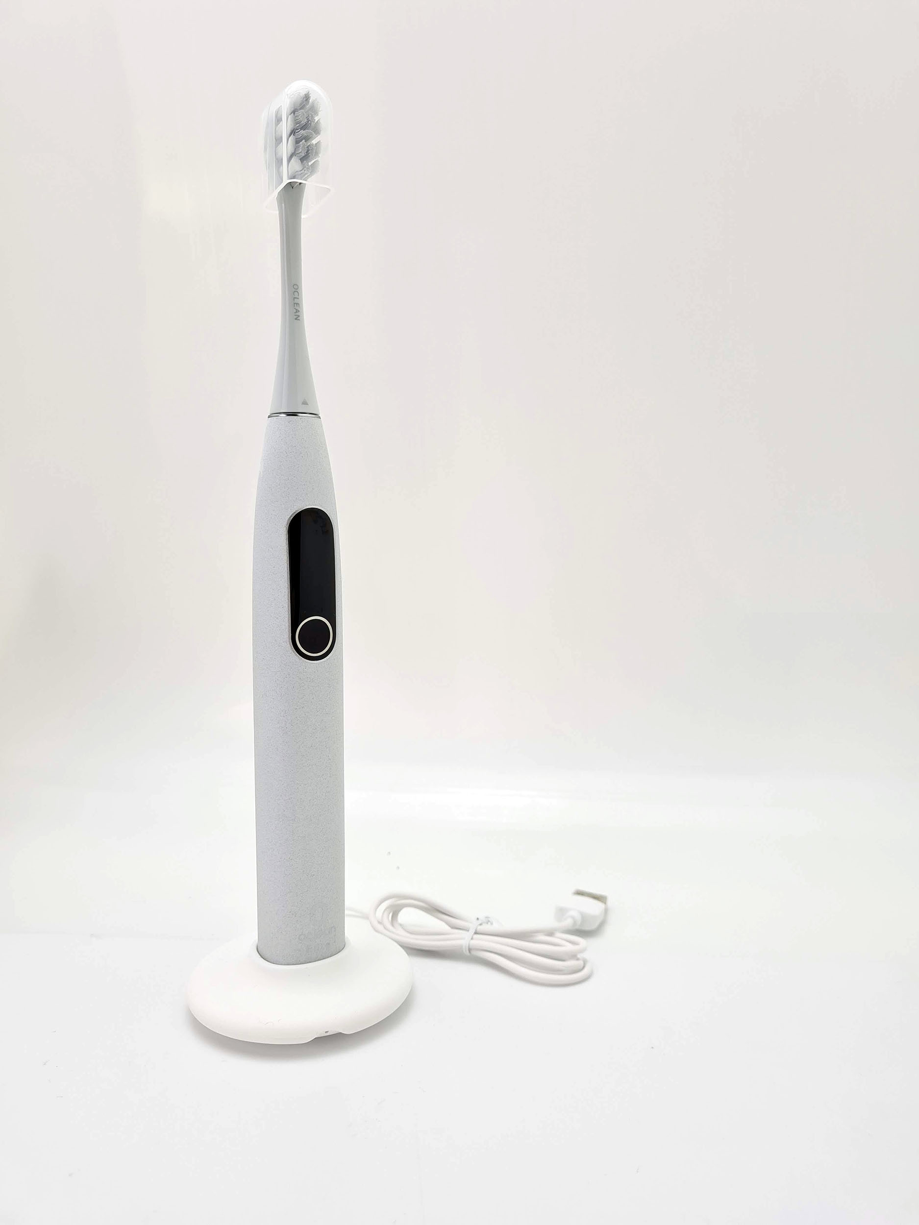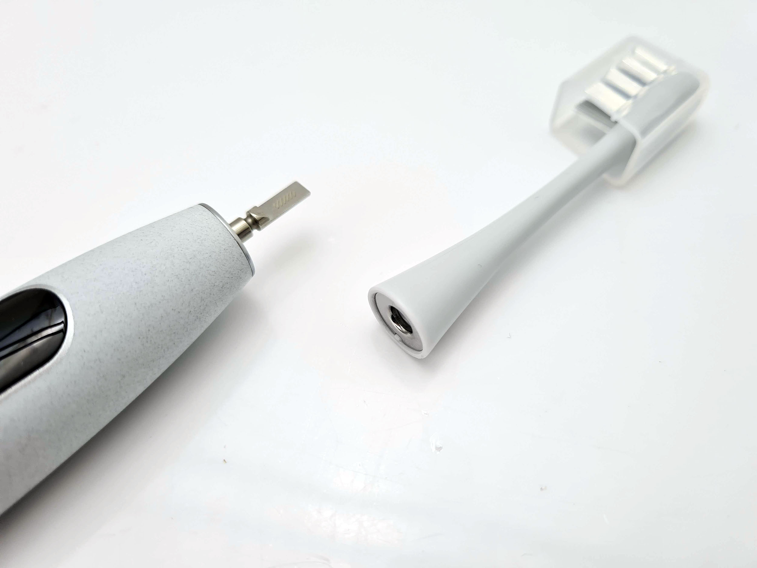 La brosse à dents électrique Oclean X Pro Elite est très grande, elle mesure 25 cm, il y a donc largement de la place pour qu'une main puisse la tenir et interagir avec l'écran tactile. Comme toutes les brosses à dents de ce type, la tête avec la brosse est détachable et peut être remplacée lorsqu'elle est usée. Vous pouvez acheter de nouvelles têtes pour 13€ sur le site d'Oclean (13€ pour 2).