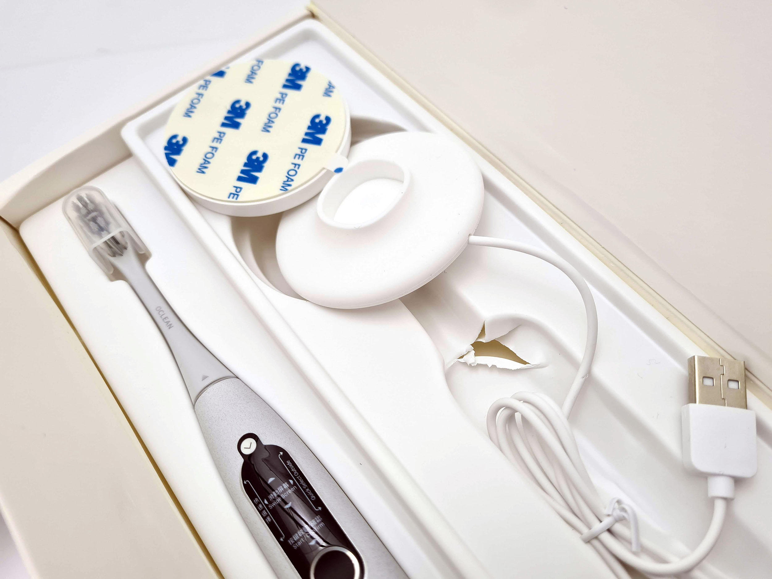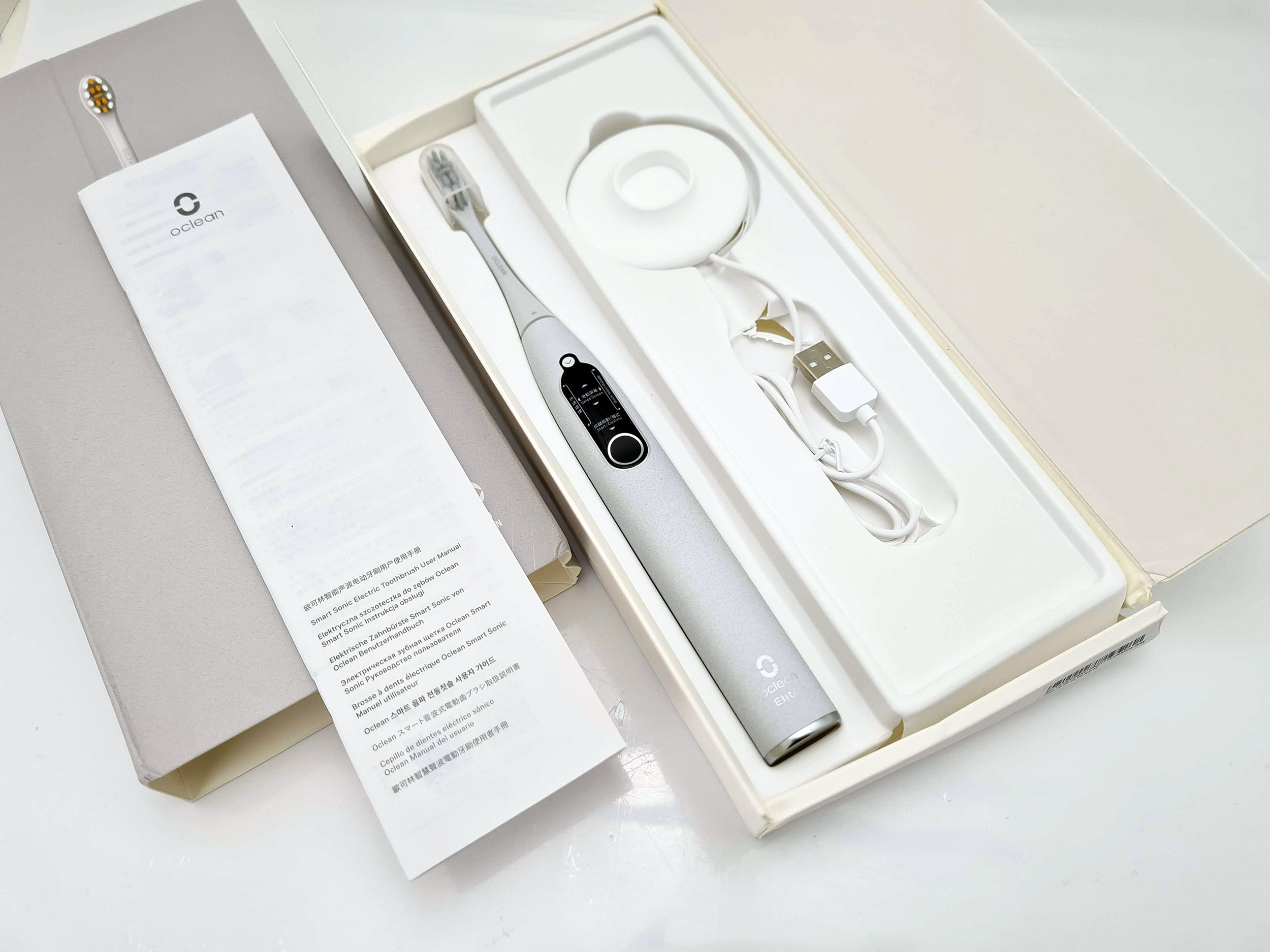 La boite de la Oclean X Pro Elite est imposante, je ne m'attendais pas à recevoir une boite aussi grande mais cela n'est pas étonnant car la Oclean X Pro Elite est vraiment grande. La boite contient la brosse avec sa brosse détachable, un manuel, un support pour charger la brosse avec son cable USB et un support mural. Il n'y a pas de chargeur, il faut donc brancher le cable USB sur un chargeur mural.
