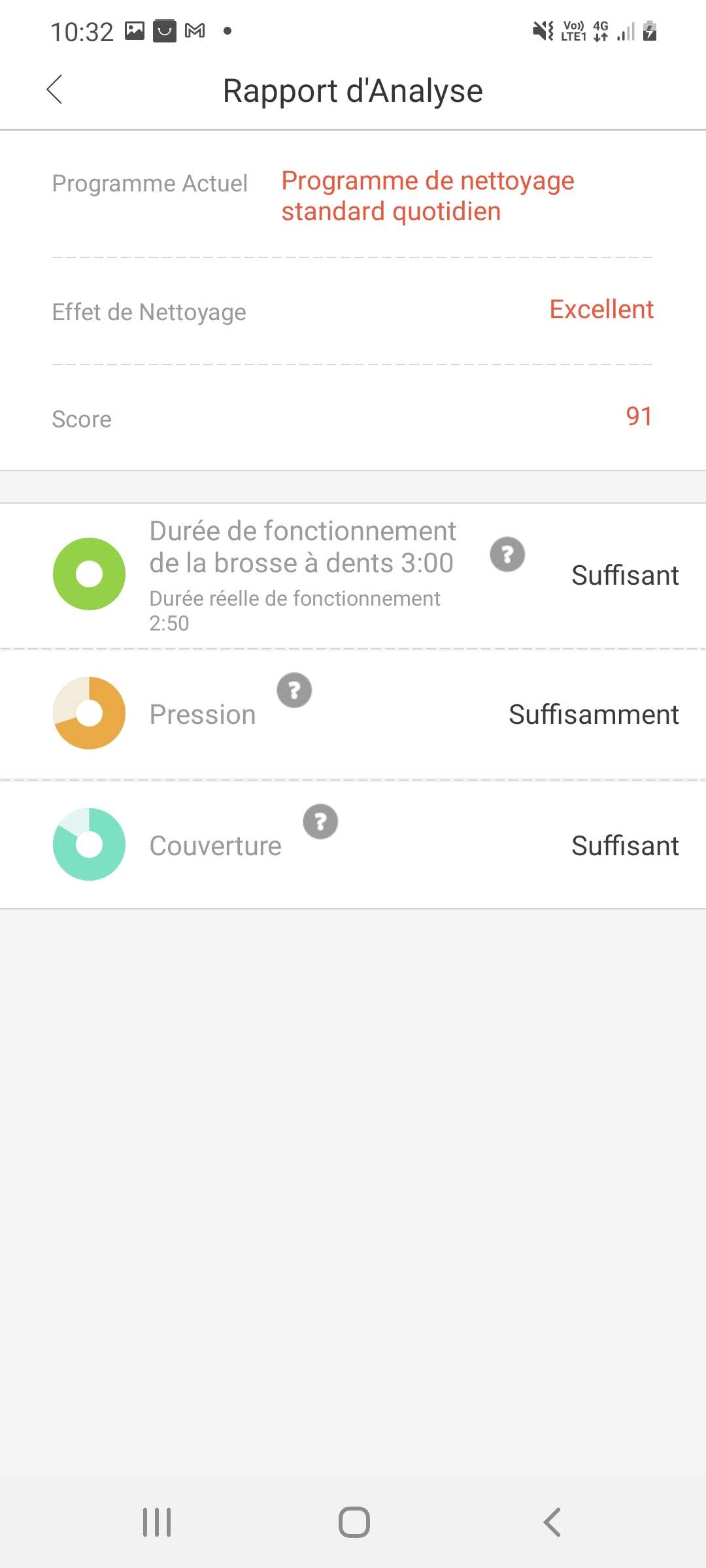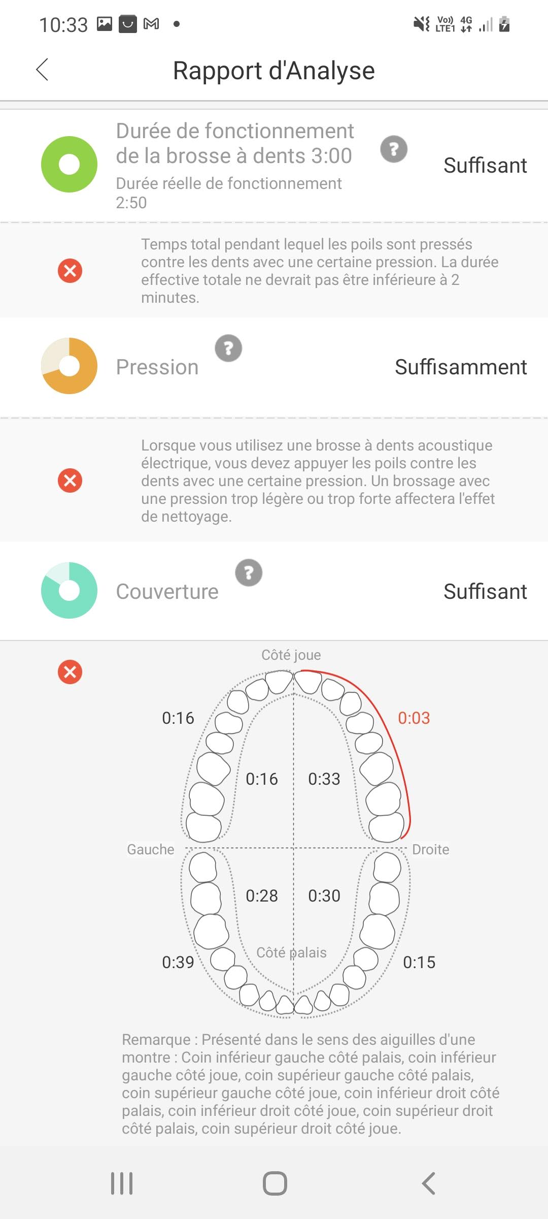 J'ai testé plusieurs modes de brossage et j'ai suivi les recommandations de la brosse qui donne un score à la fin de chaque brossage et je suis parvenu à augmenter ce score, il y a donc une logique qui fonctionne dans le suivi avec l'application. Il est possible d'identifier le temps passé sur chaque zone de la bouche, je trouve que l'idée est vraiment excellente mais il y a encore un peu de travail. La brosse ne détecte pas bien la différence entre le brossage à l'intérieur et à l'extérieur des dents mais globalement le temps passé sur les différentes zones semble correcte.