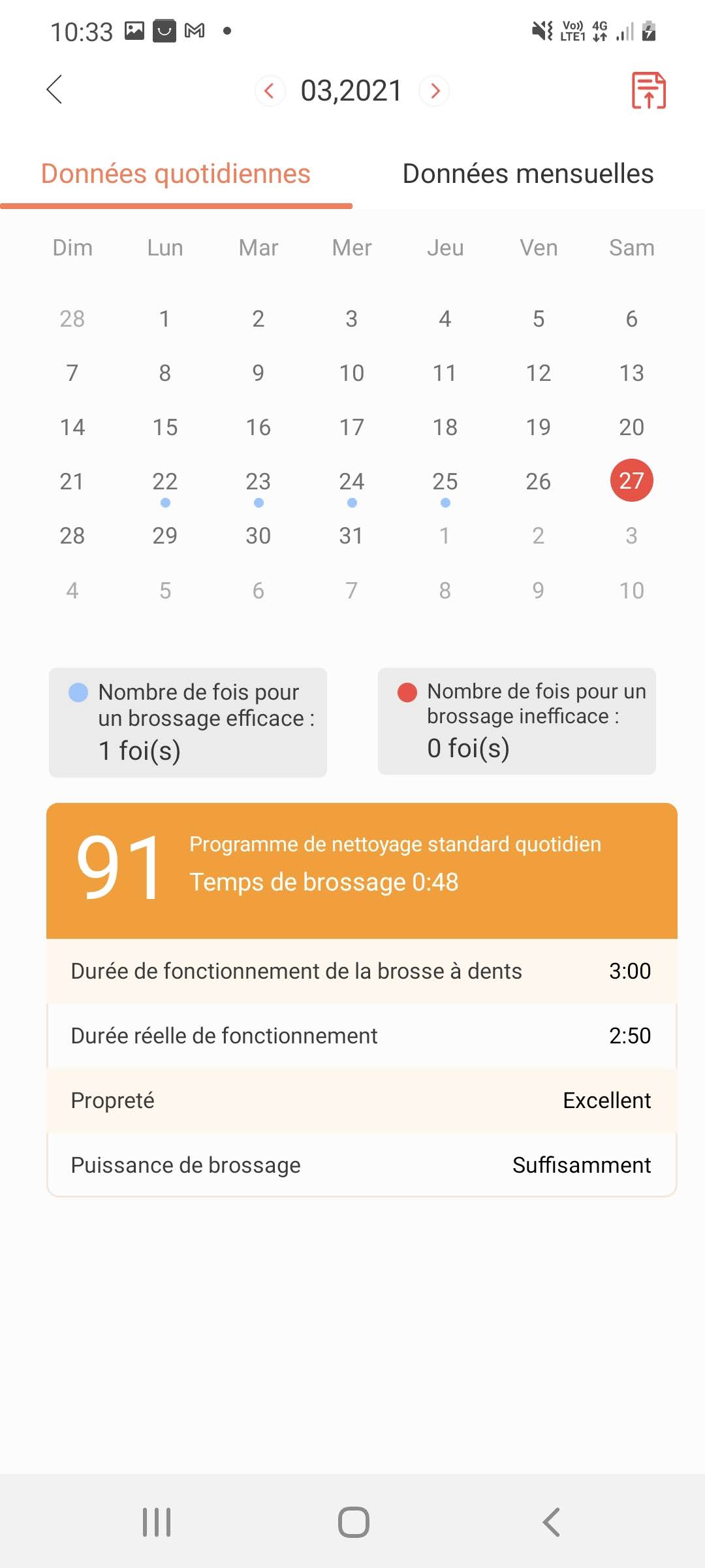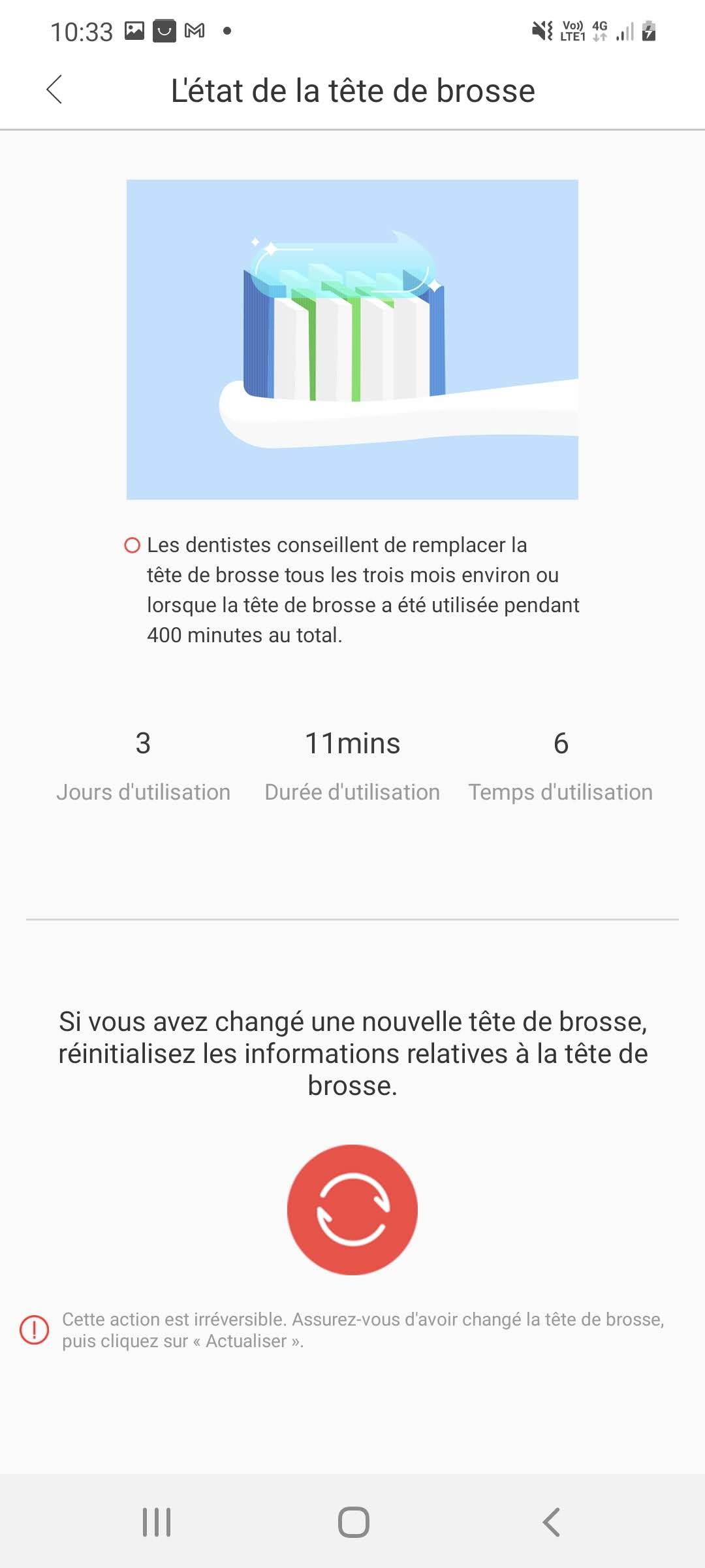 Après quelques jours d'utilisation, je peux désormais en dire plus sur le fonctionnement de l'application Oclean et l'interaction avec la brosse à dents. Il faut synchroniser sa brosse tous les jours pour pouvoir visualiser les résultats sur l'application, ce système fonctionne un peu comme les applications sportives où on synchronise ses données d'exercice avec son téléphone. L'application capture le temps de brossage ainsi que de nombreux autres paramètres comme l'intensité, la pression sur la brosse, l'orientation de la brosse, le temps passé sur chaque zone de la bouche, ... etc.