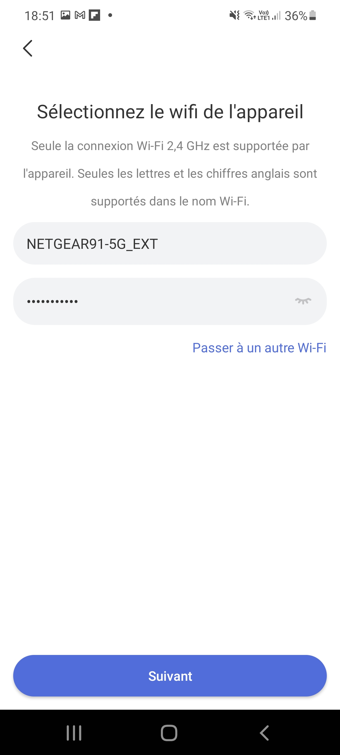 3. Connexion au réseau wifi: je vous conseille de choisir une bande de fréquence de 2.4Ghz car j'ai eu plus de difficultés à connecter la caméra en 5Ghz et de toute façon, je ne suis pas sûr que la caméra ait besoin de la bande passante de la fréquence 5Ghz. Le 2.4Ghz a un plus grande portée, vous pouvez donc éloigner un peu plus la caméra du routeur wifi.