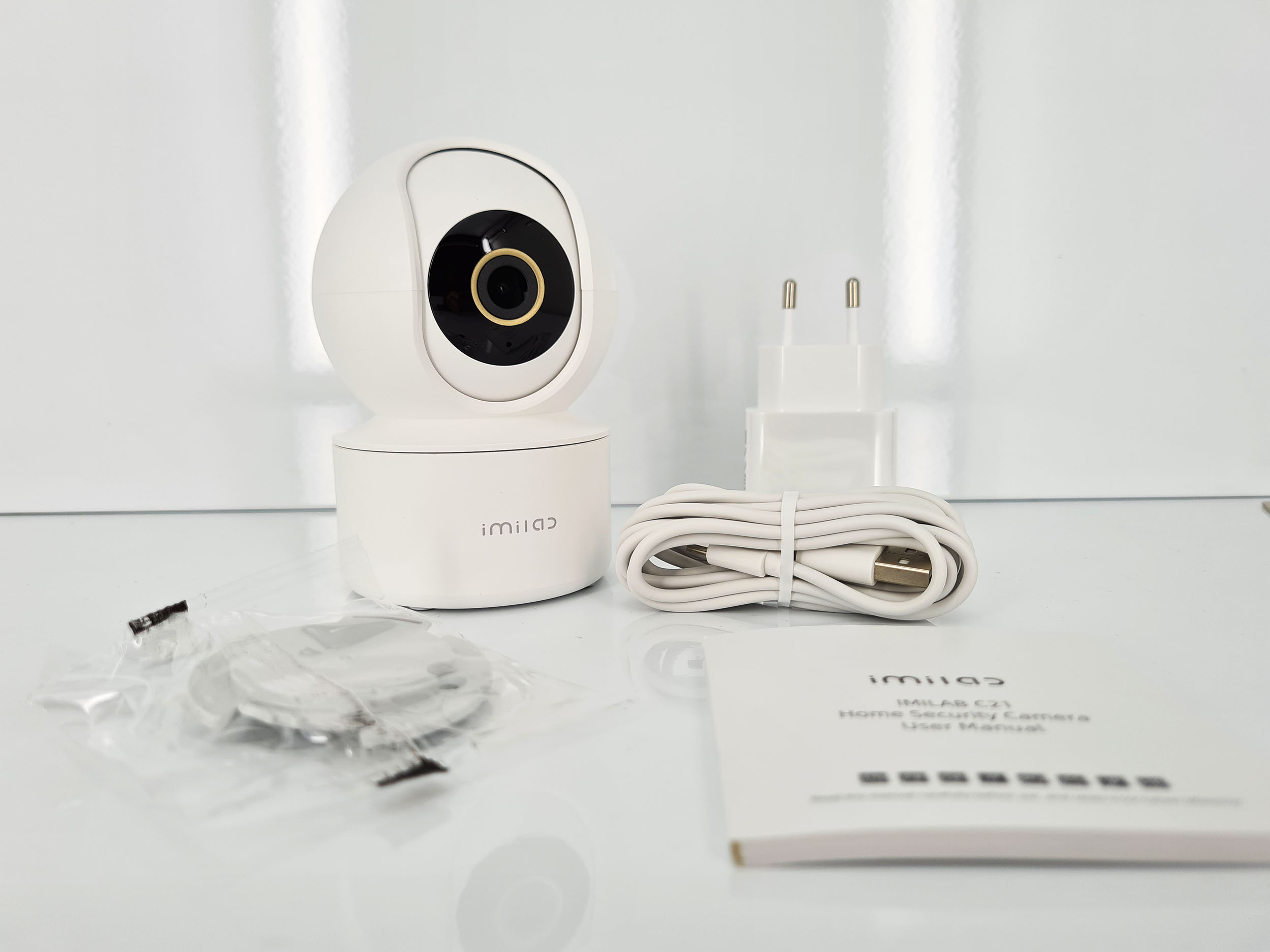 La boite de la Imilab C21 contient la caméra, un chargeur mural, un cable USB, un support mural et un manuel. La boite est donc très compacte et l'installation de cette caméra est accessible à tous, il suffit de la poser quelque part et de la brancher sur une prise murale. Le cable USB est plus long que la version précédente, il mesure presque 2 mètres, la caméra pourra donc être placée à une distance plus importante de la prise murale.