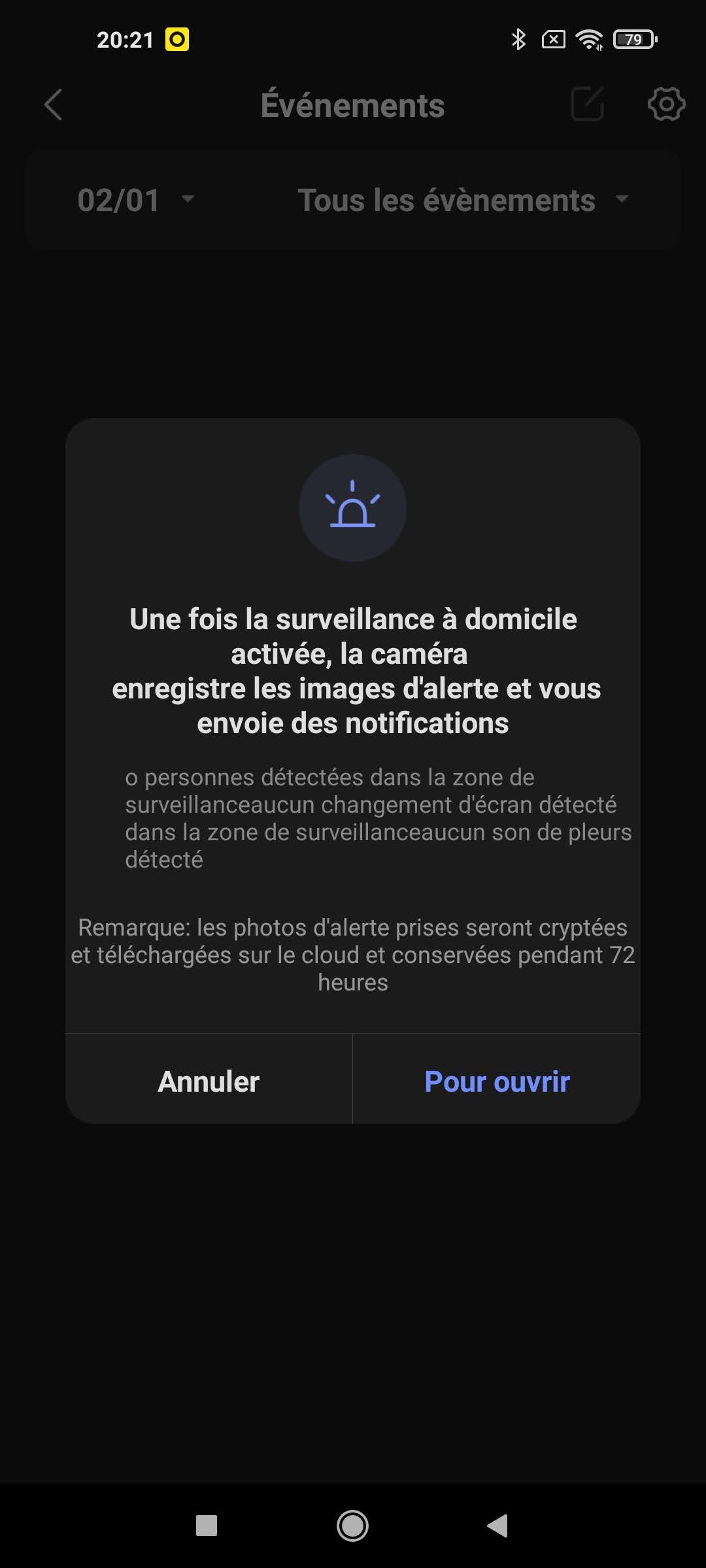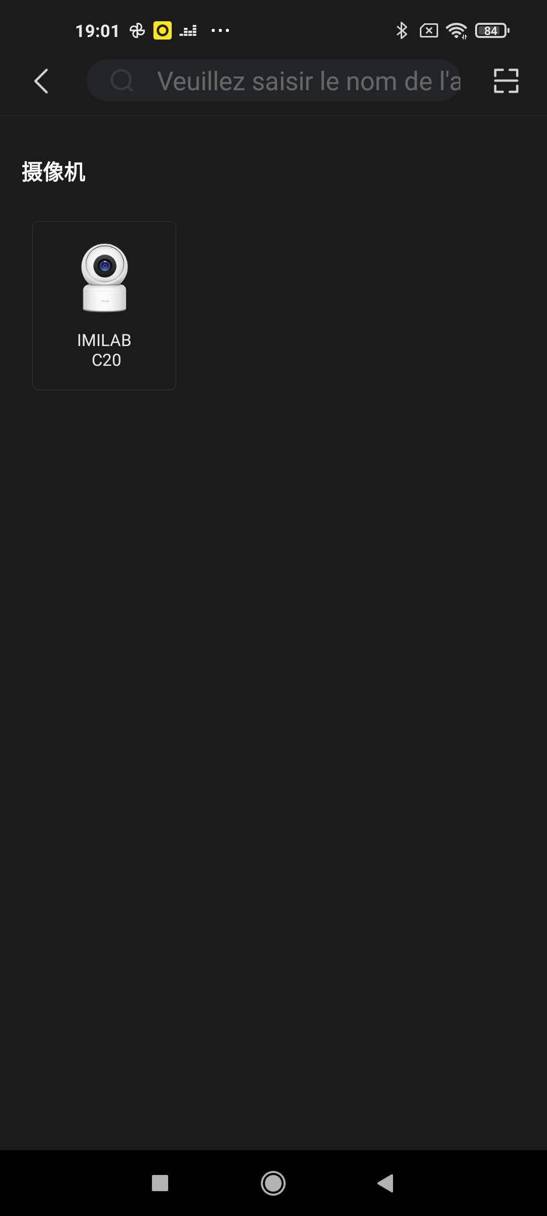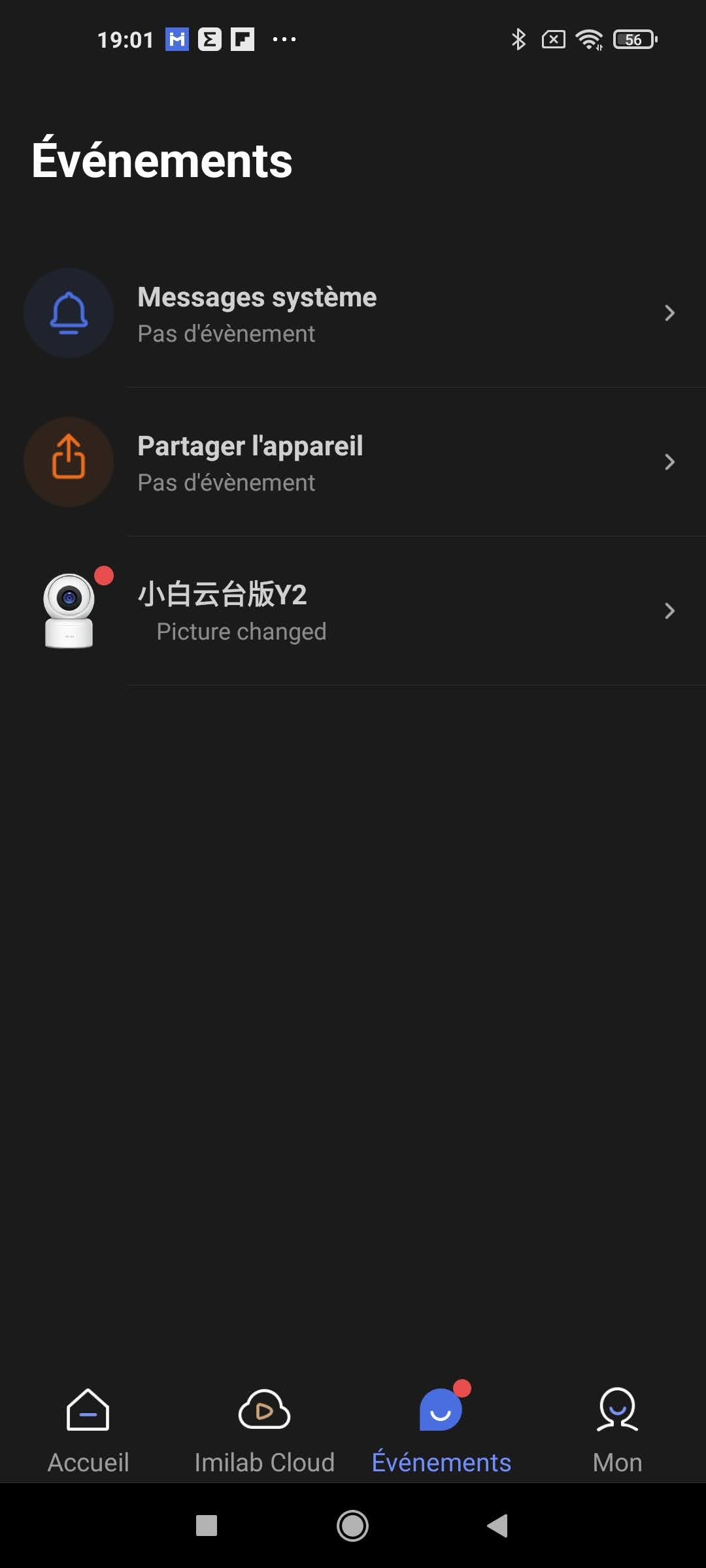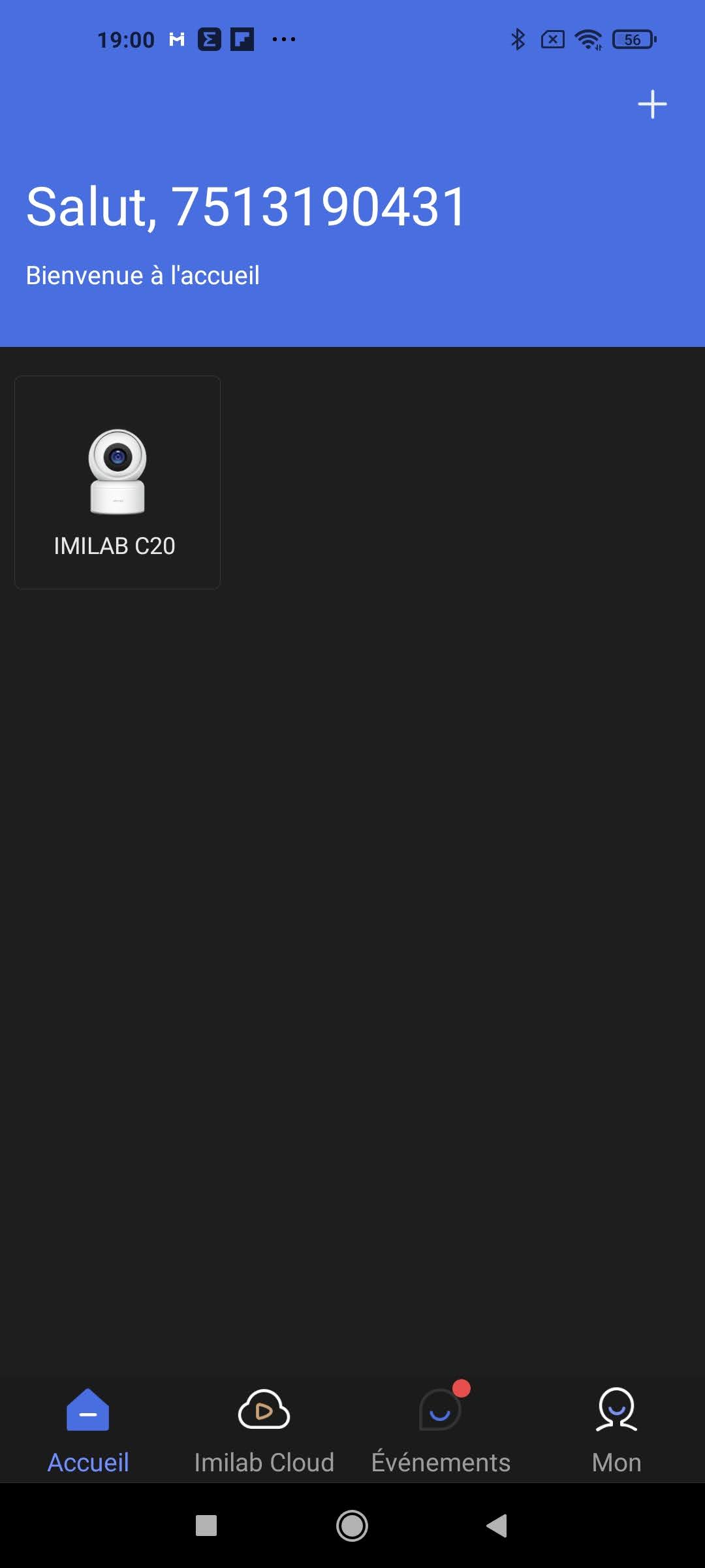 L'application Imilab Home permet de connecter plusieurs types d'objets connectés, il ne faut donc pas installer une application pour chaque produit. L'écran principal liste tous les objets connectés à l'application, dans mon cas il n'y a qu'une caméra. L'écran principal permet de se connecter à la caméra, acheter une offre cloud pour le stockage des vidéos, consultez les événements générés par la caméra et configurer la caméra. Les événements sont aussi remontés au niveau des notifications de votre téléphone.