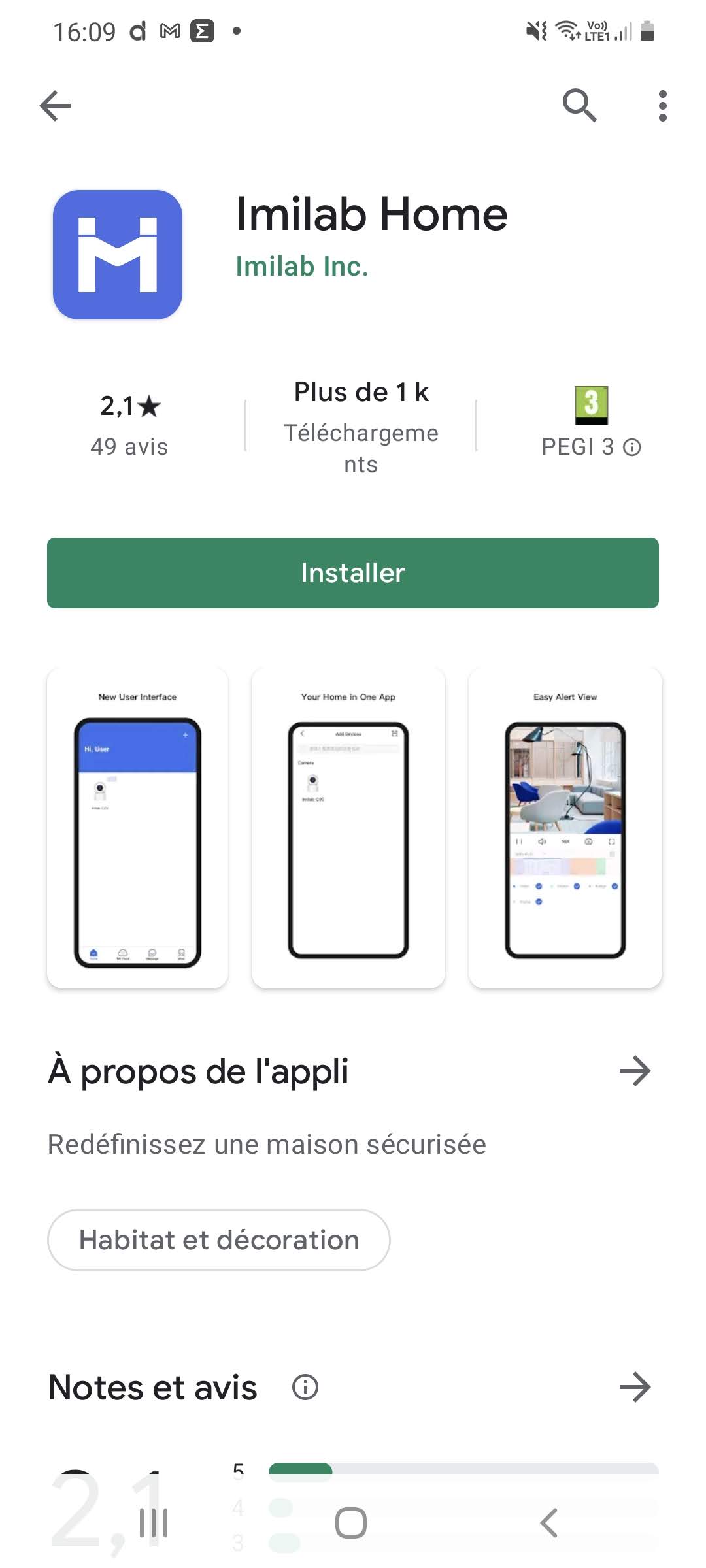Pour pouvoir utiliser la caméra, vous avez besoin d'une application, il faut donc télécharger l'application Imilab Home. C'est une application gratuit mais avec des services payants et les avis sur le Play Store ne sont pas très positifs. La première connexion avec la caméra est plutôt laborieuse et je suspecte qu'une des raisons de ce problème est liée à la localisation du service d'enregistrement qui se situe en Chine.