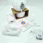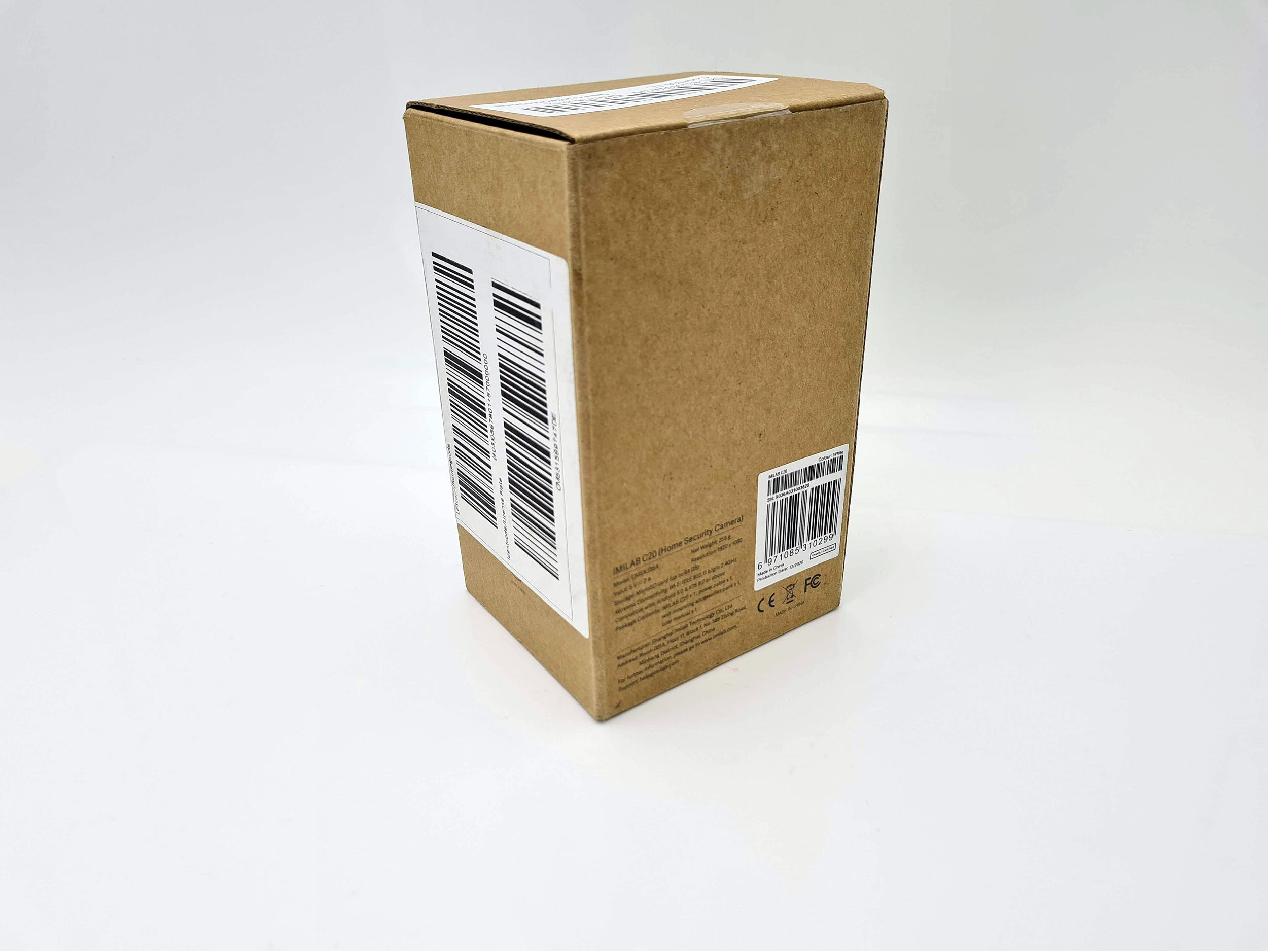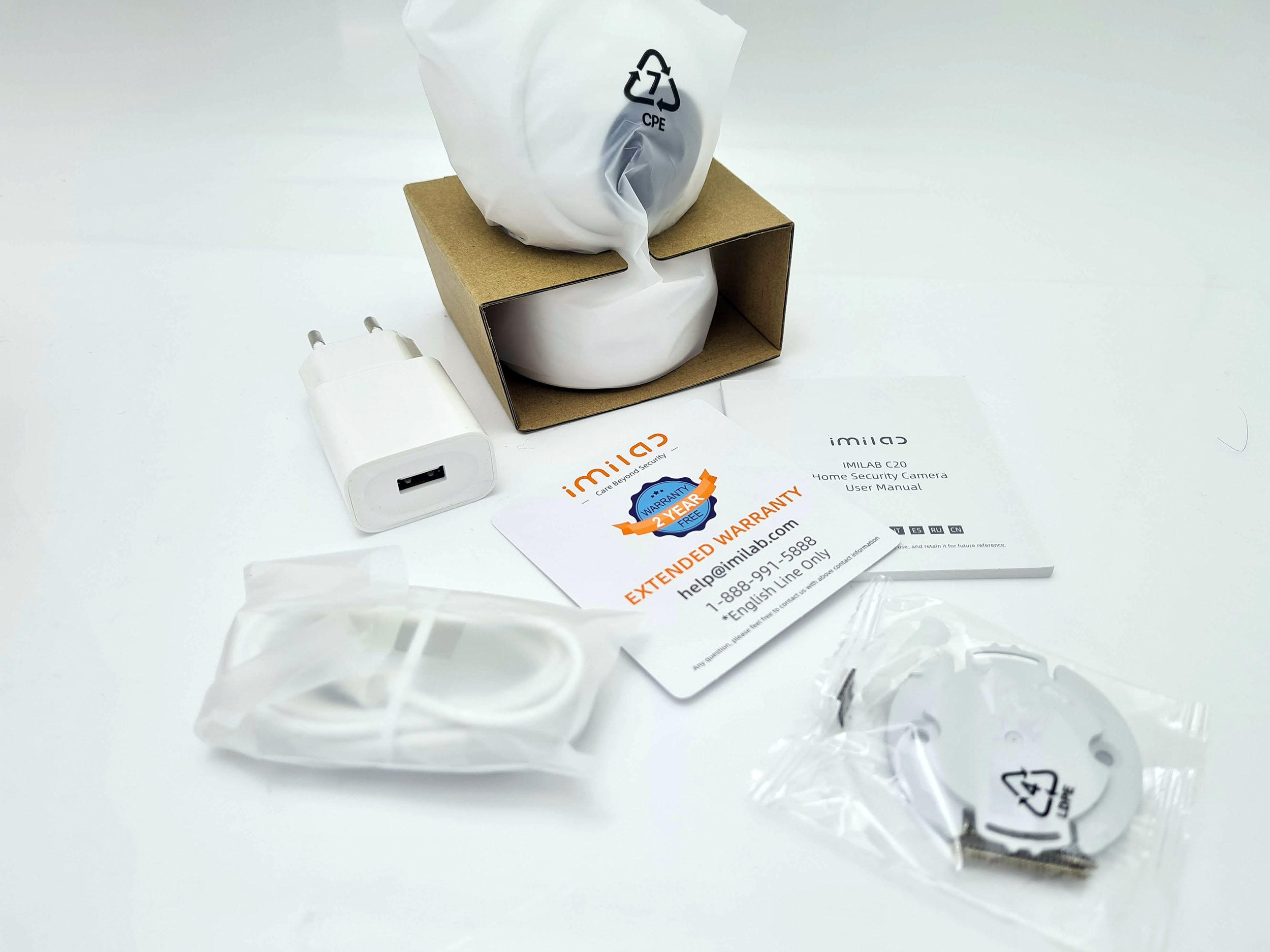 La caméra Imilab est livré dans une boite presque complètement anonyme. Je me demandais bien de quoi il s'agissait lorsque je l'ai reçue, c'est un choix assez étonnant pour un produit qui semble pourtant avoir fait l'objet de recherche sur le design de l'objet. La boite contient la caméra, un chargeur, un cable, un manuel et un socle d'attache pour fixer la caméra.