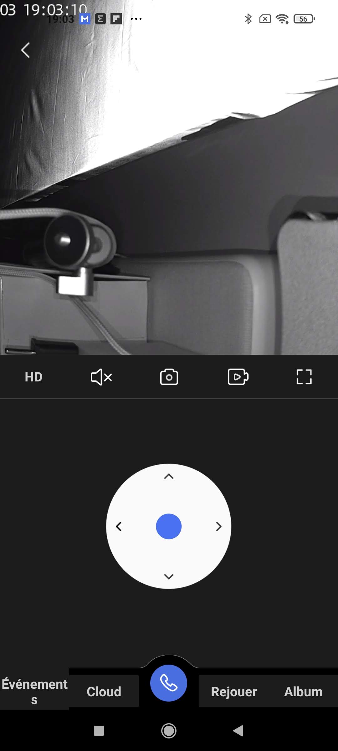 A partir de l'écran principal, vous pouvez piloter la caméra à partir d'un bouton de controle central qui permet de pivoter la caméra de gauche à droite et de haut en bas. Les mouvements sont séquentiels, vous pouvez donc bouger la caméra étape par étape, si vous laissez votre doigt trop longtemps elle va continuer à tourner jusqu'à ce que ce ne soit plus possible. Il y a un retard à l’exécution entre les commandes et leur exécution. Sur le même écran vous pouvez passer en mode HD ou SD, activer ou désactiver le son, démarrer un enregistrement ou passer en plein écran. Vous pouvez aussi enclencher le micro pour parler à travers la caméra. J'ai un bon signal wifi et la caméra était dans la même pièce que mon routeur (à environ 2m), j'ai malgré tout eu quelques pertes de signal.