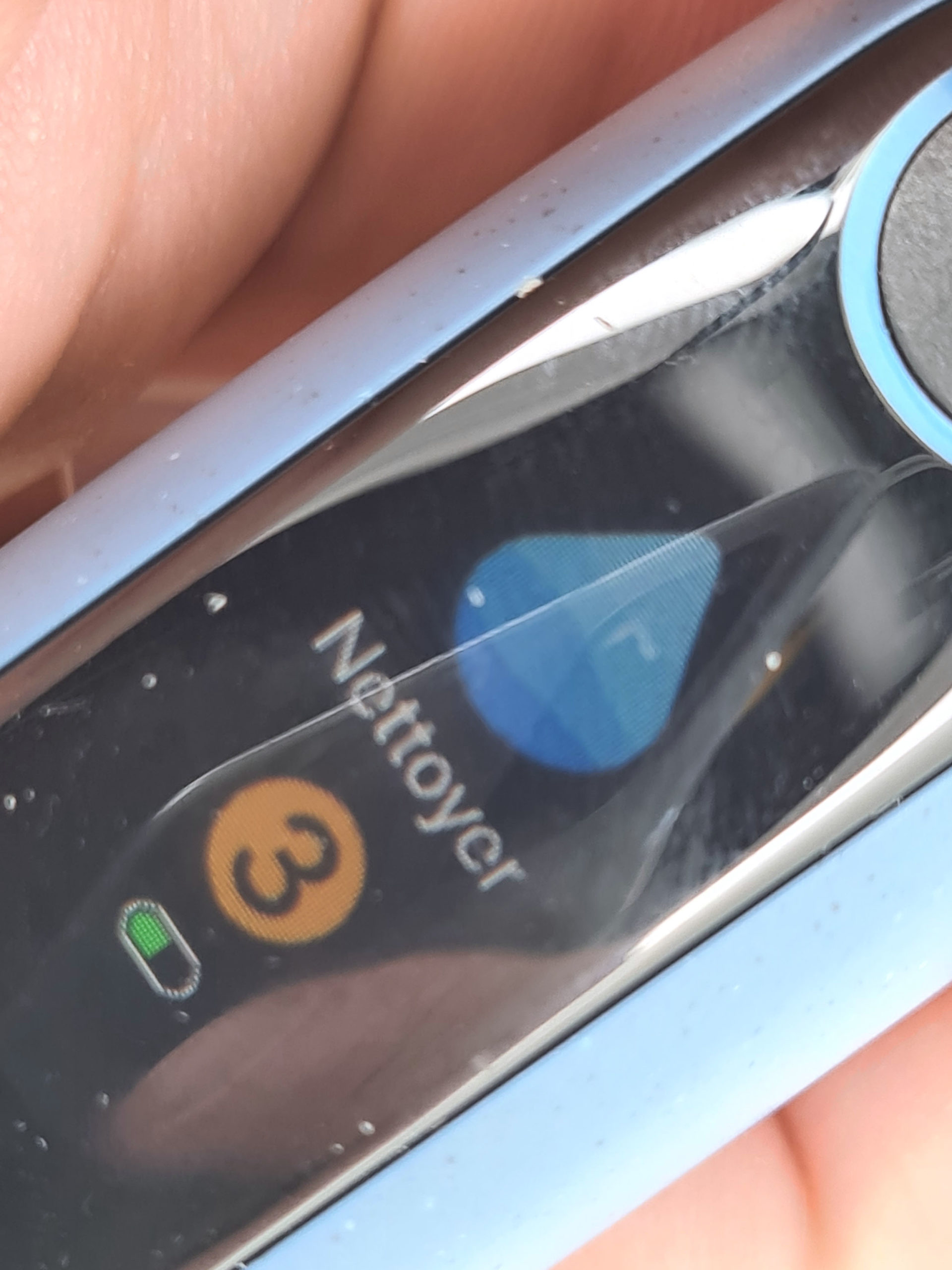 L'écran est composé de trois boutons, un bouton d'allumage et déclenchement du nettoyage, un bouton du sélection du type de nettoyage et un bouton pour l'intensité. Je reviens sur ces points plus loin dans cette article.