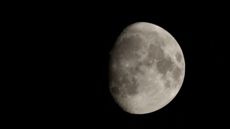 La Lune est une cible simple à observer en raison de sa luminosité. J’ai pris cette photo malgré des conditions nuageuses. Le télescope pourrait sans doute produire de meilleurs résultats par ciel dégagé. En augmentant la netteté et en ajustant la saturation, il est possible d’améliorer l’image :