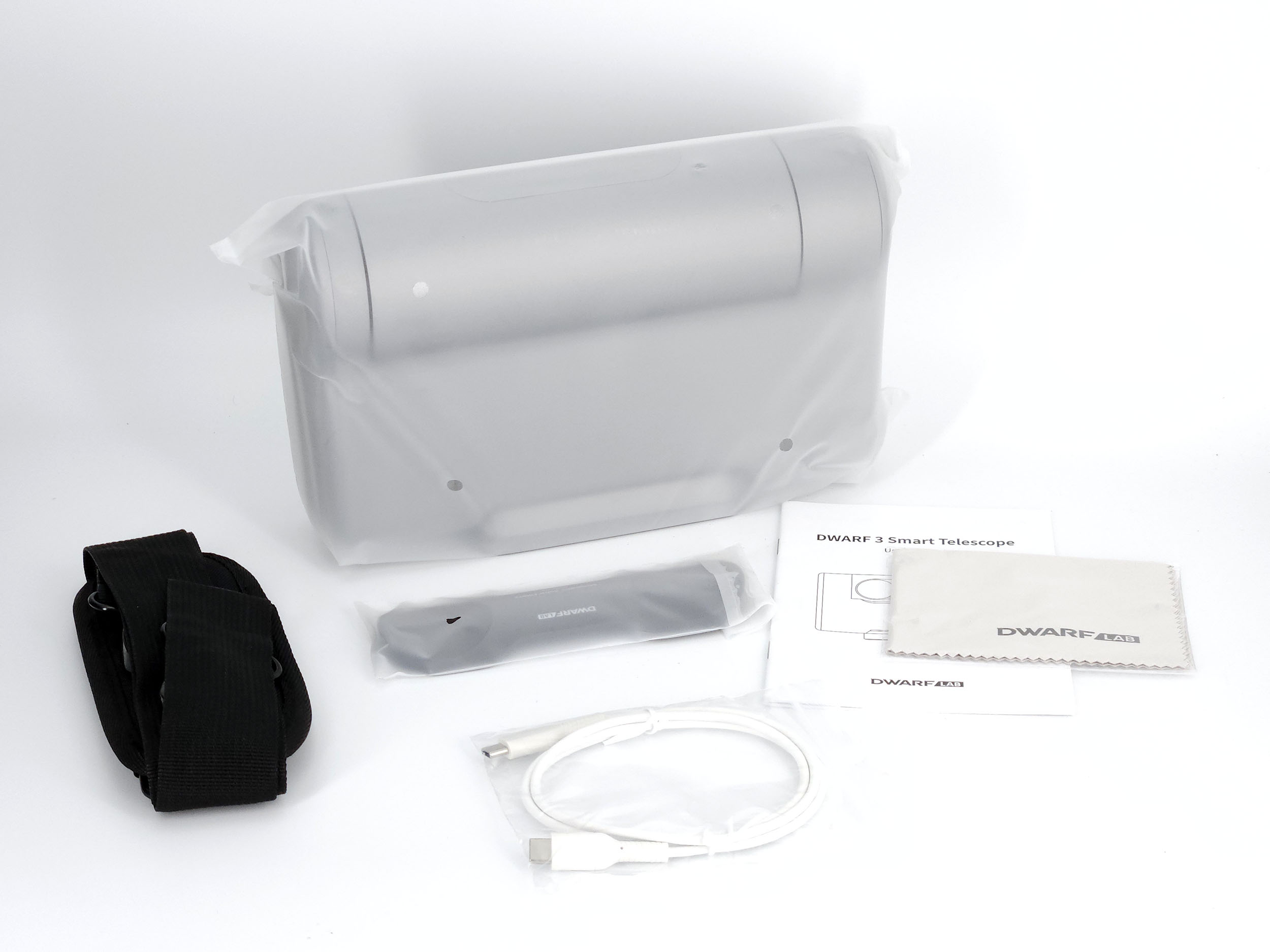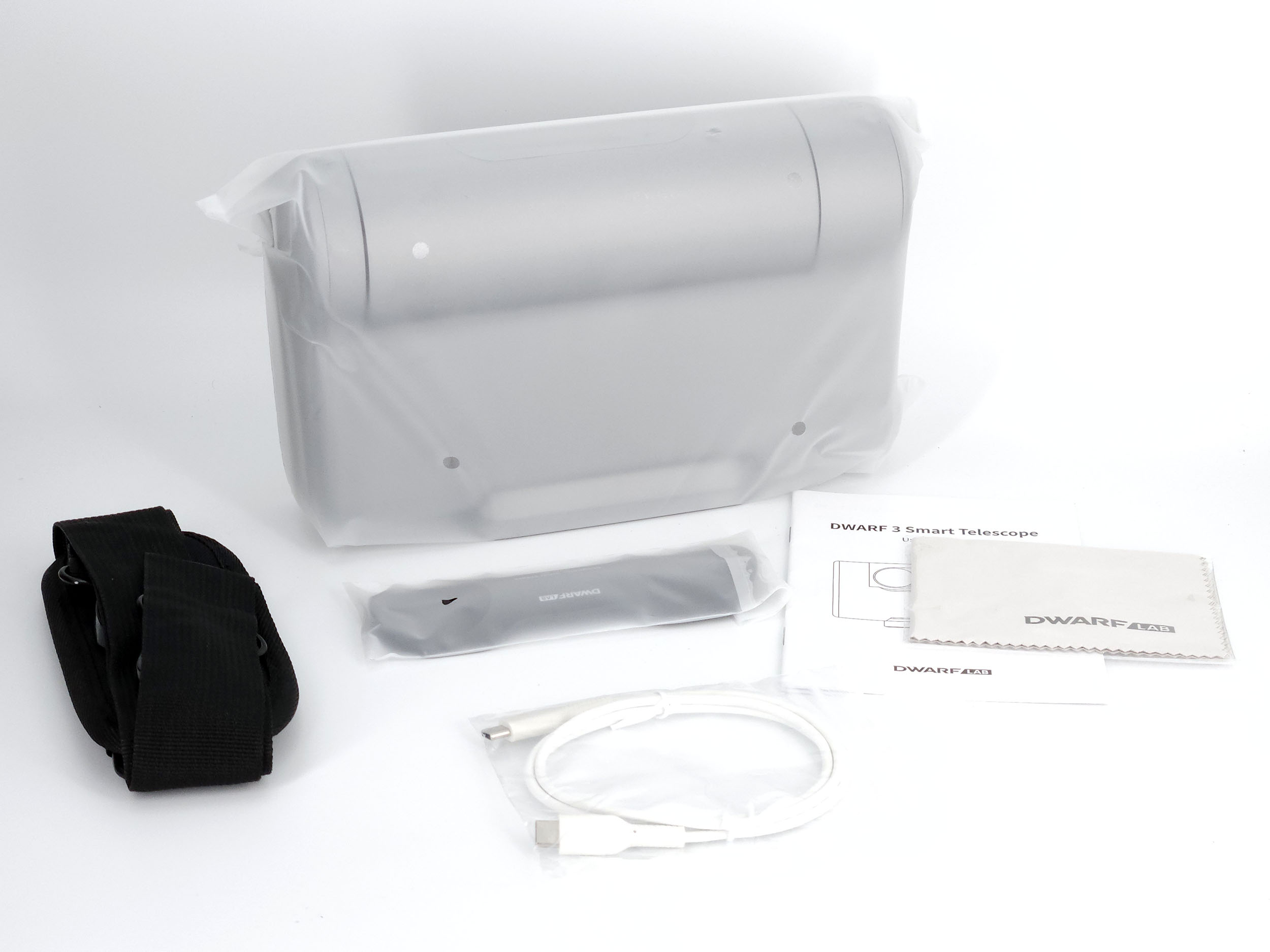 L’emballage comprend le télescope protégé par un film plastique, une boîte contenant un filtre solaire magnétique, un câble USB pour le transfert de données et la recharge, un manuel, un chiffon de nettoyage, ainsi qu’une lanière pour la sacoche.