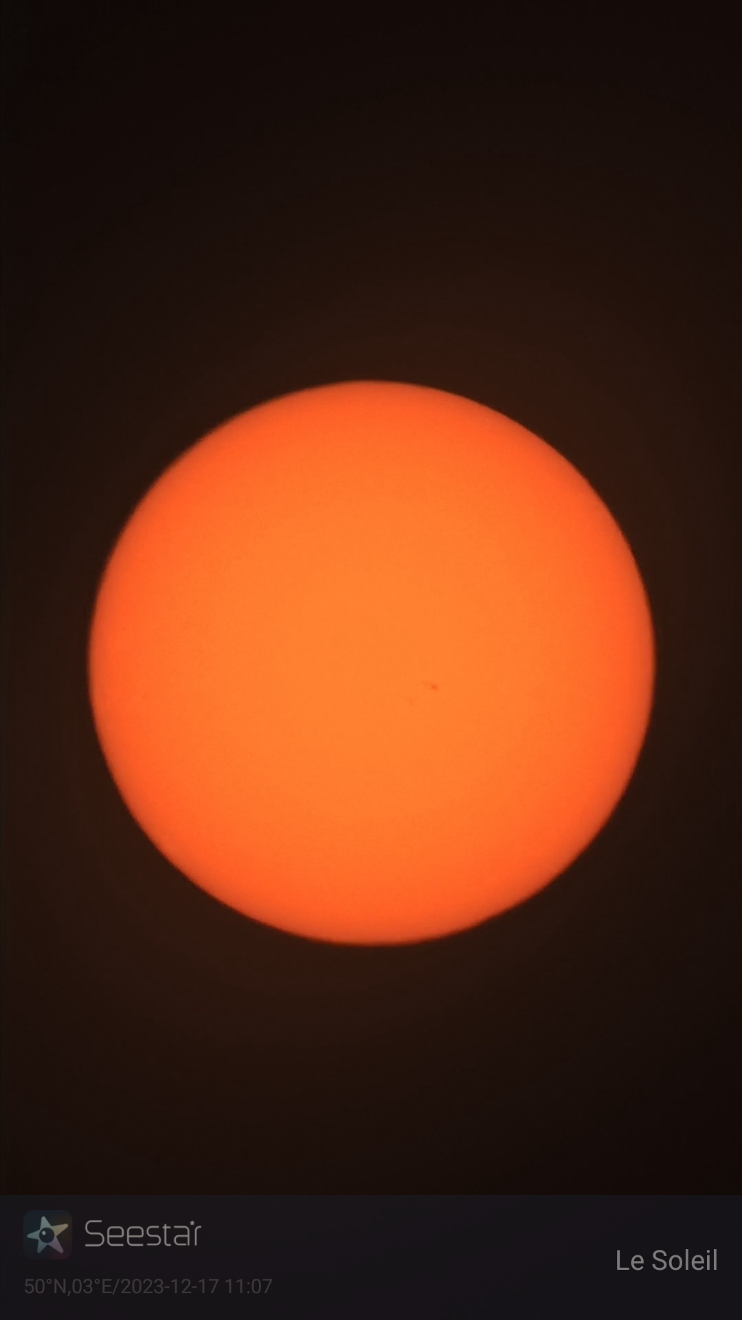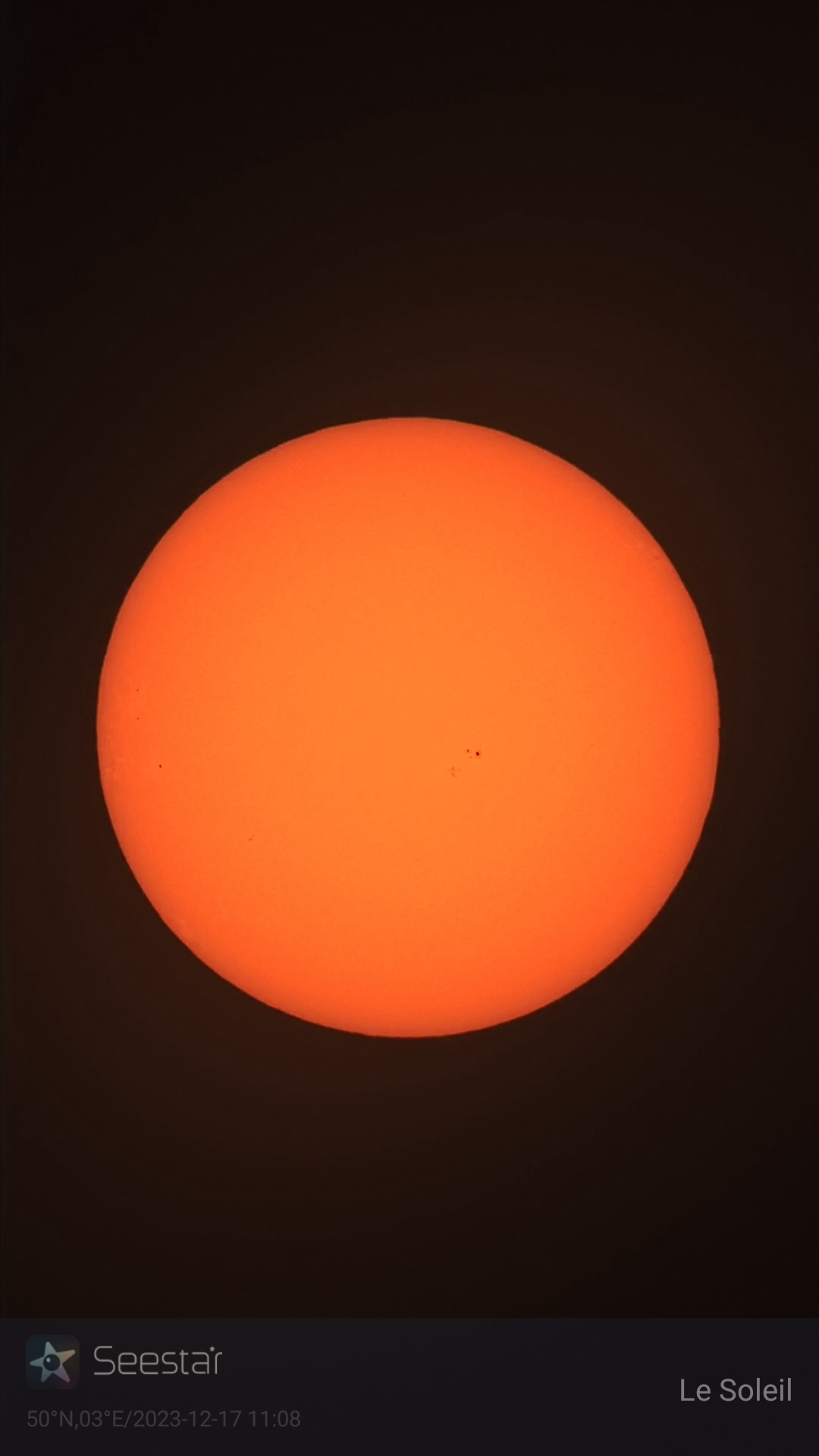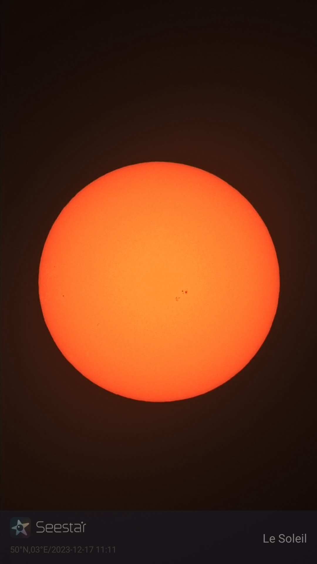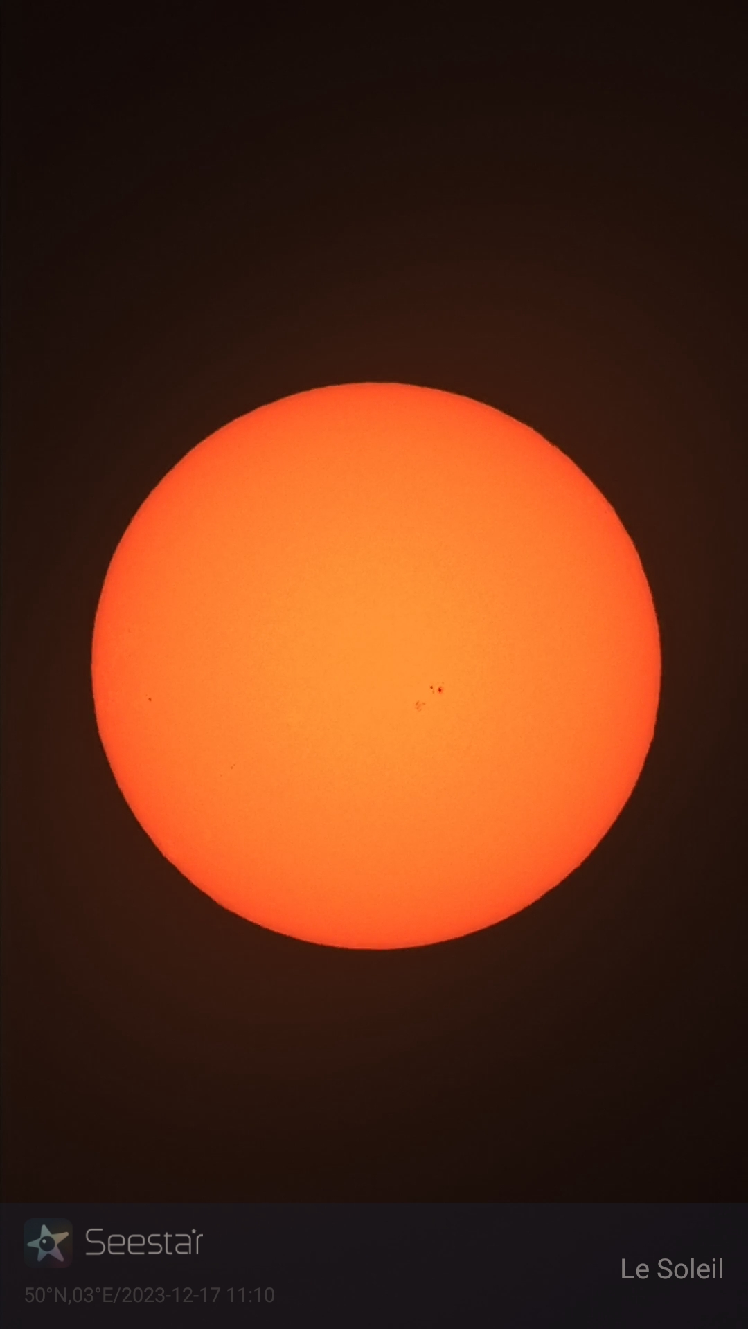 Voici quelques photos prises au même moment et sans modification dans les paramètres. J'ai pris ces photos mi-décembre vers 10h du matin, le soleil est donc assez bas et cette position ne favorise pas la prise de photos de bonne qualité à cause de la pollution atmosphérique. Malgré des conditions défavorables, je trouve que le Seestar S50 se débrouille vraiment bien. Je dois encore tester la possibilité de capturer le soleil en format brut (RAW) pour voir si je peux aller chercher des détails qui ne sont pas directement visible sur la photo en JPG.