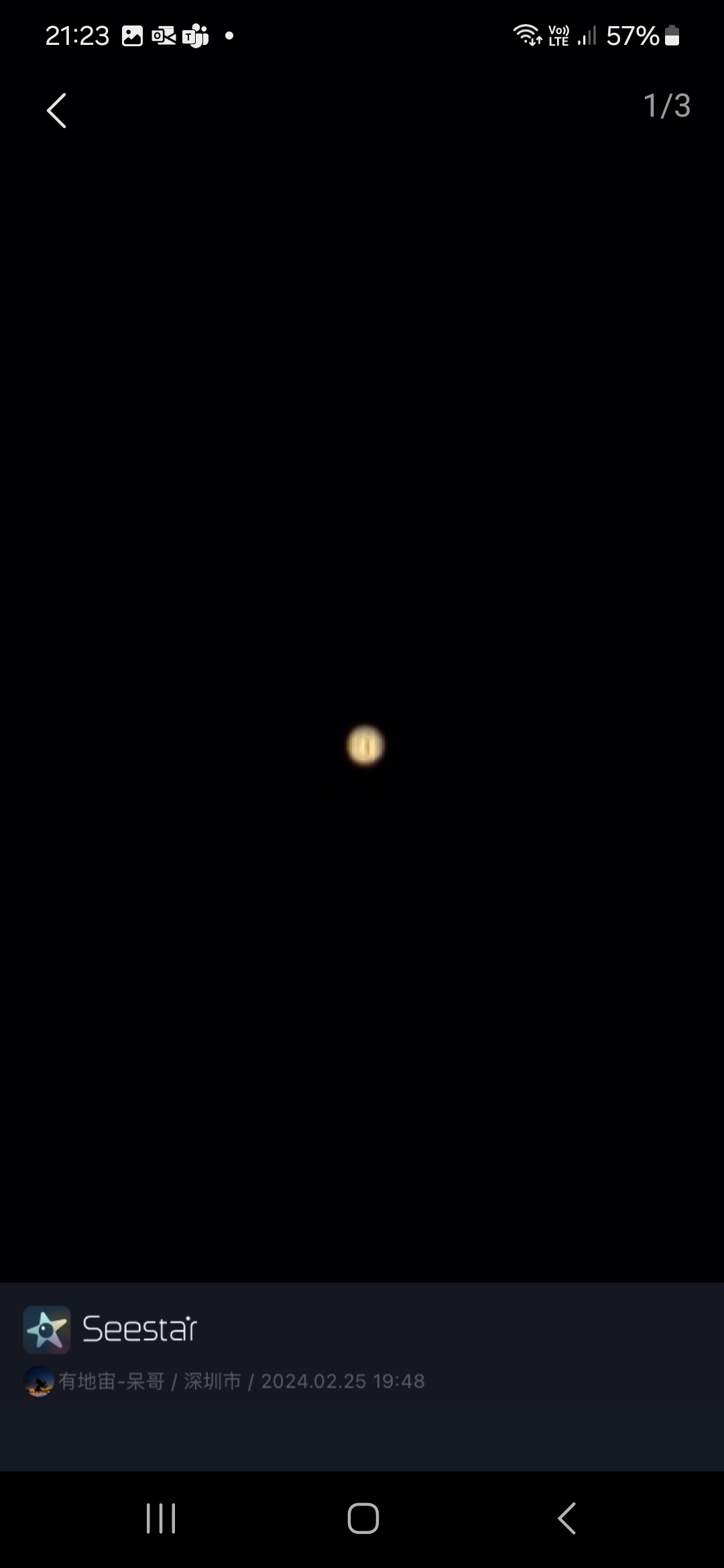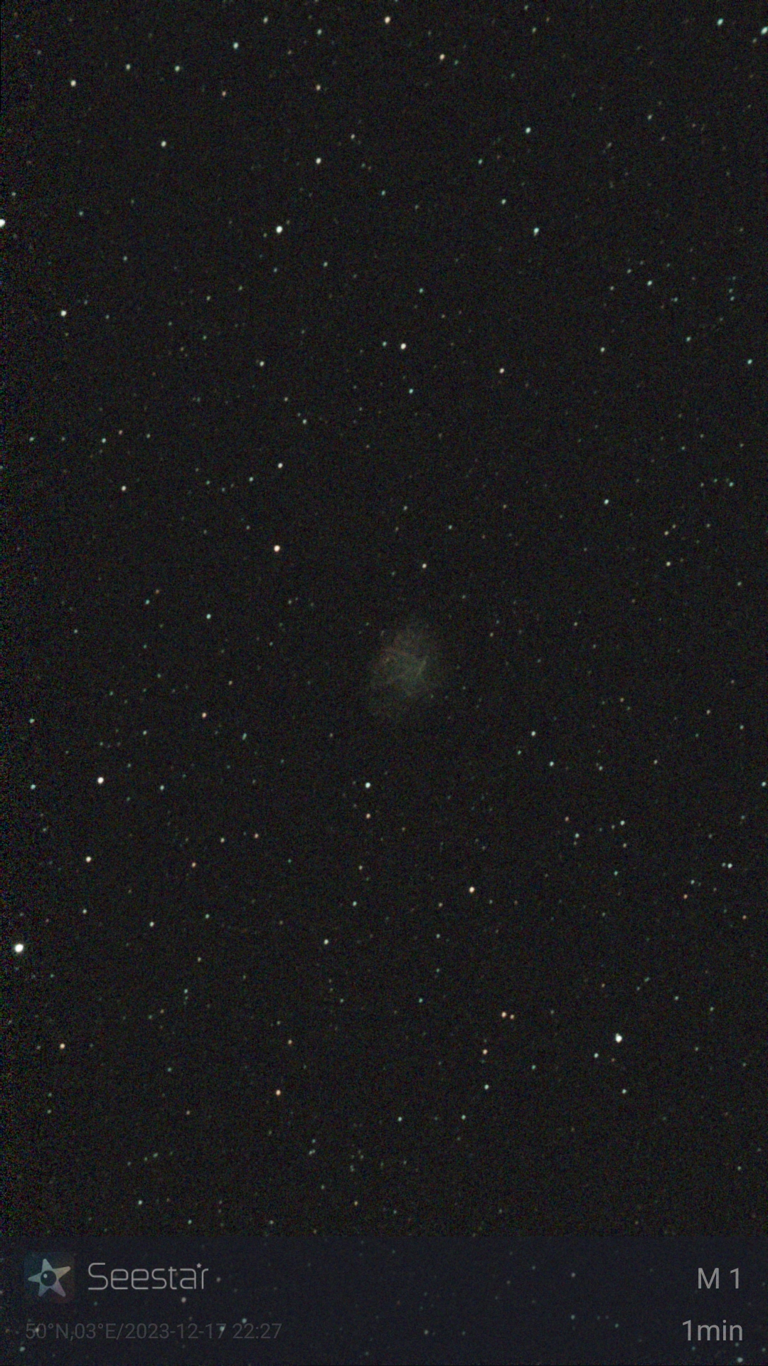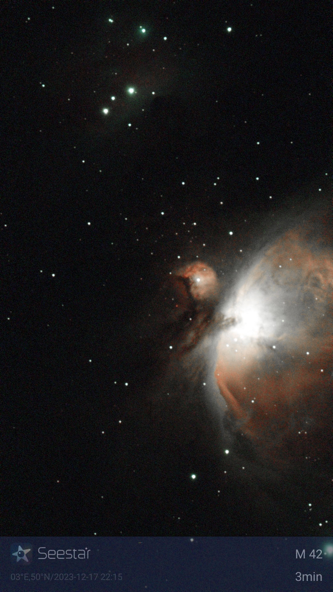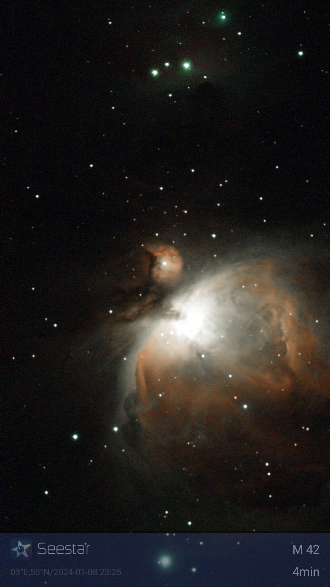 Pour démarrer cette première observation, j'ai orienté le télescope vers M42 car elle était très bien orientée par rapport à mon jardin, je voyais les 3 étoiles assez clairement à l'oeil nu. En moins d'une minute, le télescope se positionne au bon endroit et commence le suivi. M42 est très rapidement apparu sur mon écran et j'ai vraiment été impressionné par la netteté de l'image dès les premières secondes. J'avais déjà observé M42 à travers un télescope normal et ensuite avec le Dwarf II, je n'étais pas arrivé à un tel résultat aussi rapidement.