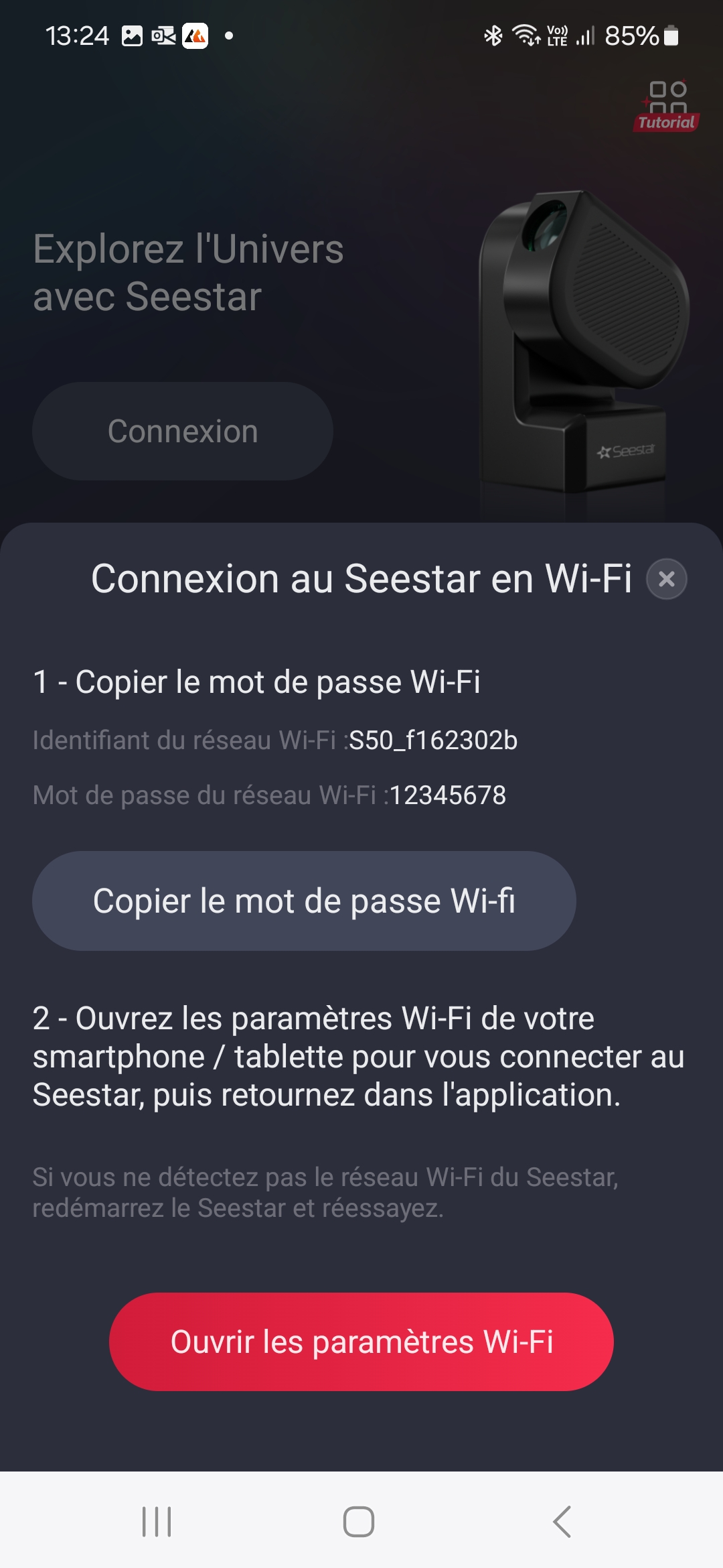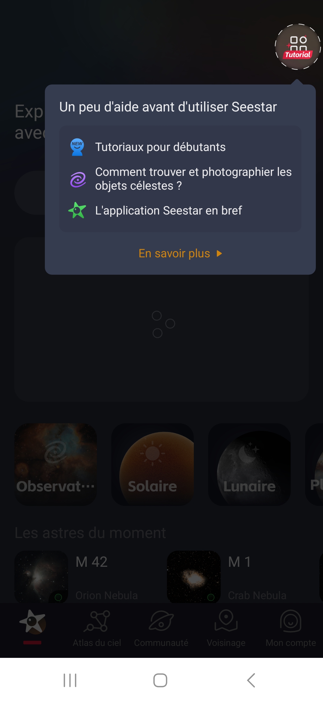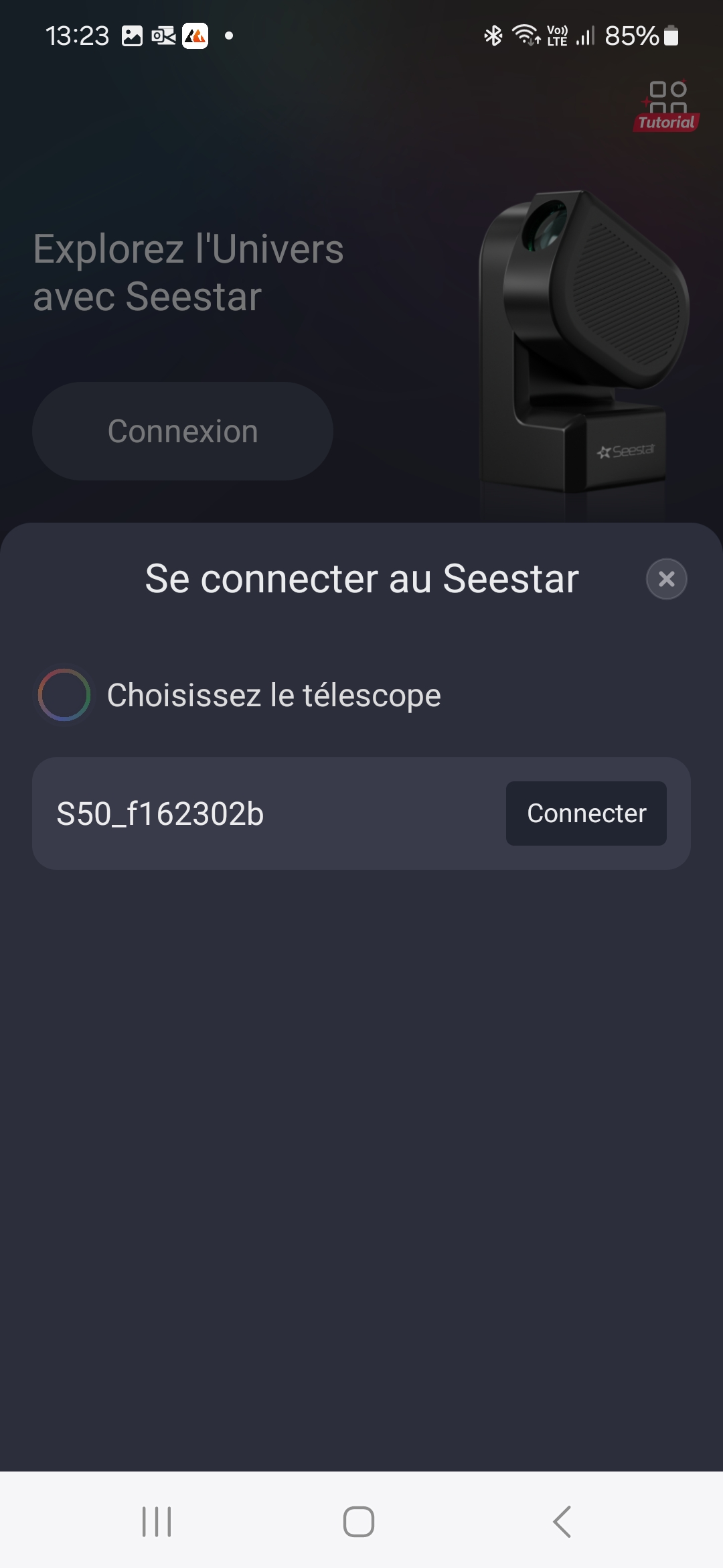 Pour pouvoir utiliser le télescope Seestar S50 vous devez télécharger l'application Seestar sur le Play Store / AppStore. Cette application est totalement gratuite et vous permettra de contrôler le télescope sans prise de tête. Au premier démarrage, vous allez devoir associer l'application avec le télescope par une liaison wifi entre le télescope et votre téléphone. C'est assez commun pour ce genre d'appareil, j'avais la même chose avec le Dwarf II et c'est pareil avec les robots aspirateurs que j'ai testés. Le seul problème avec ce genre de connexion c'est que pendant que votre téléphone est connecté au télescope en wifi, vous n'avez forcément plus accès au wifi de votre maison.