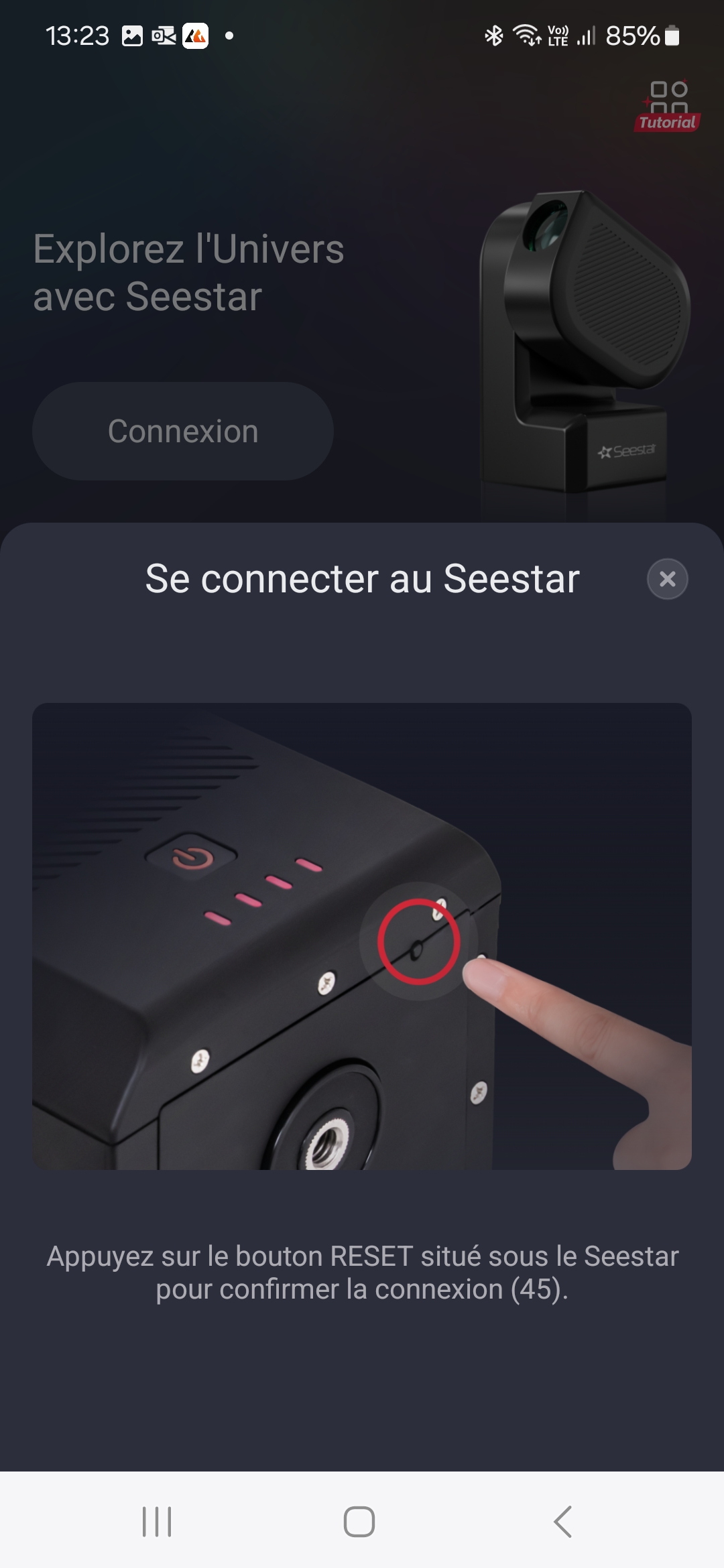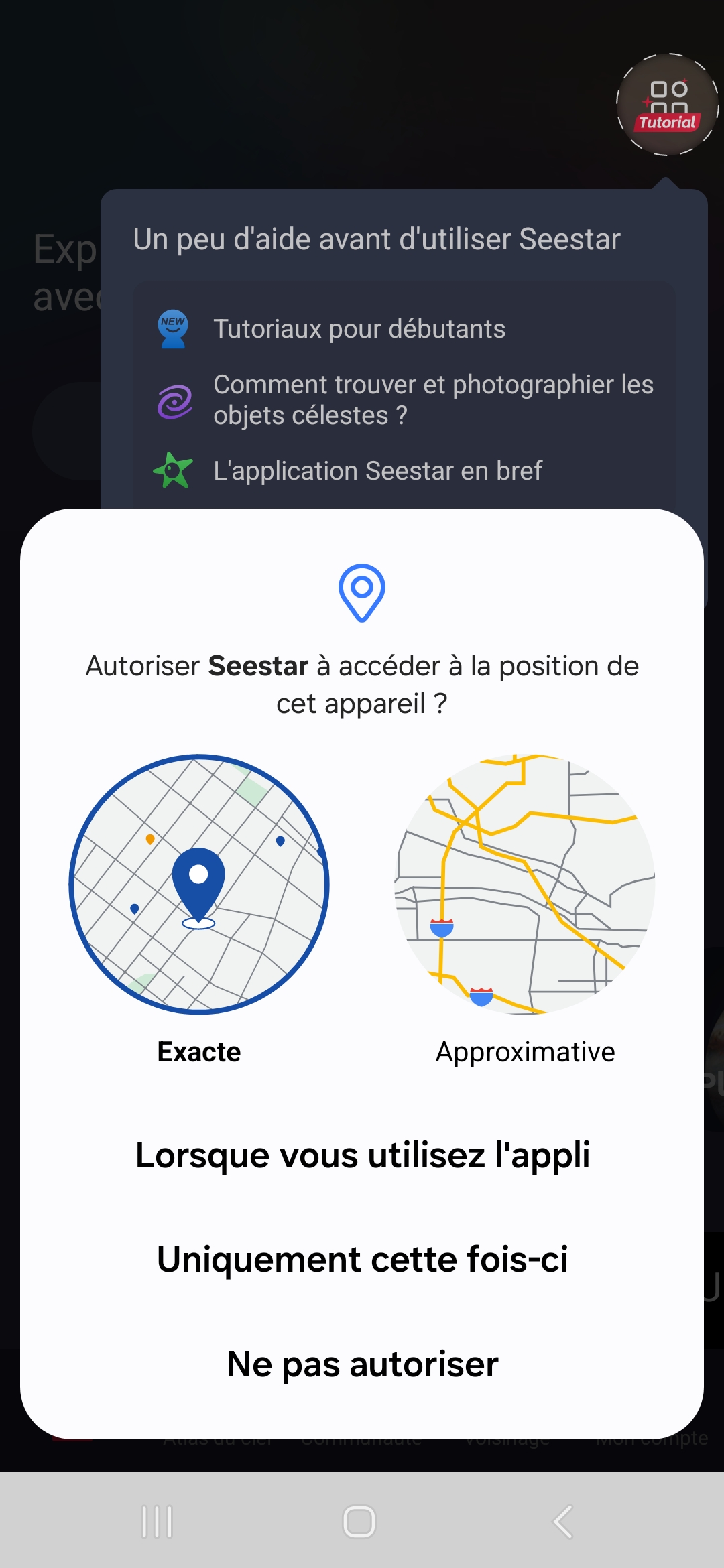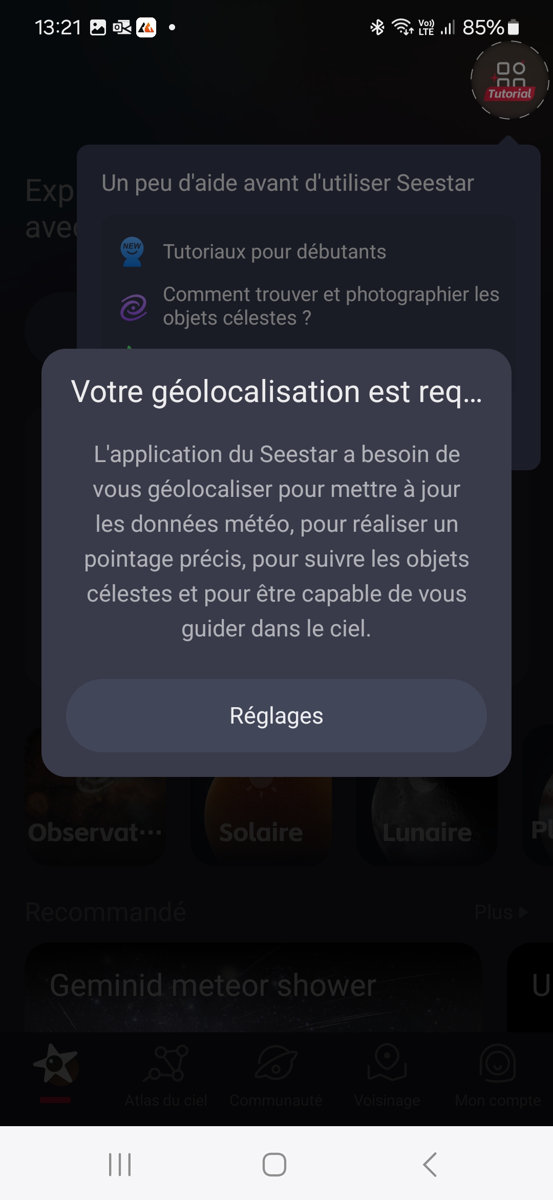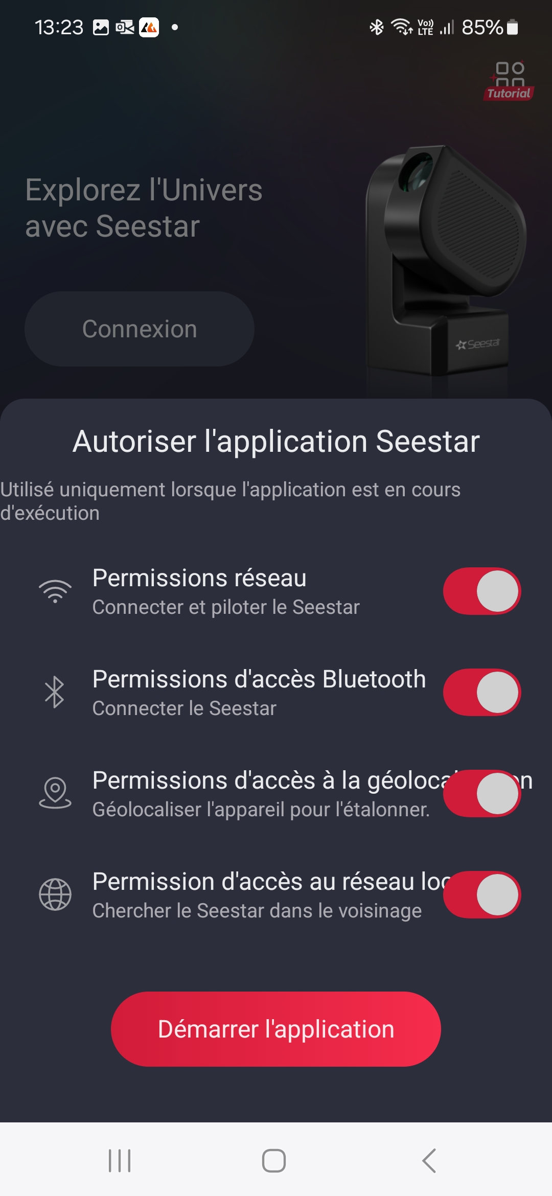 Pour pouvoir utiliser le télescope Seestar S50 vous devez télécharger l'application Seestar sur le Play Store / AppStore. Cette application est totalement gratuite et vous permettra de contrôler le télescope sans prise de tête. Au premier démarrage, vous allez devoir associer l'application avec le télescope par une liaison wifi entre le télescope et votre téléphone. C'est assez commun pour ce genre d'appareil, j'avais la même chose avec le Dwarf II et c'est pareil avec les robots aspirateurs que j'ai testés. Le seul problème avec ce genre de connexion c'est que pendant que votre téléphone est connecté au télescope en wifi, vous n'avez forcément plus accès au wifi de votre maison.