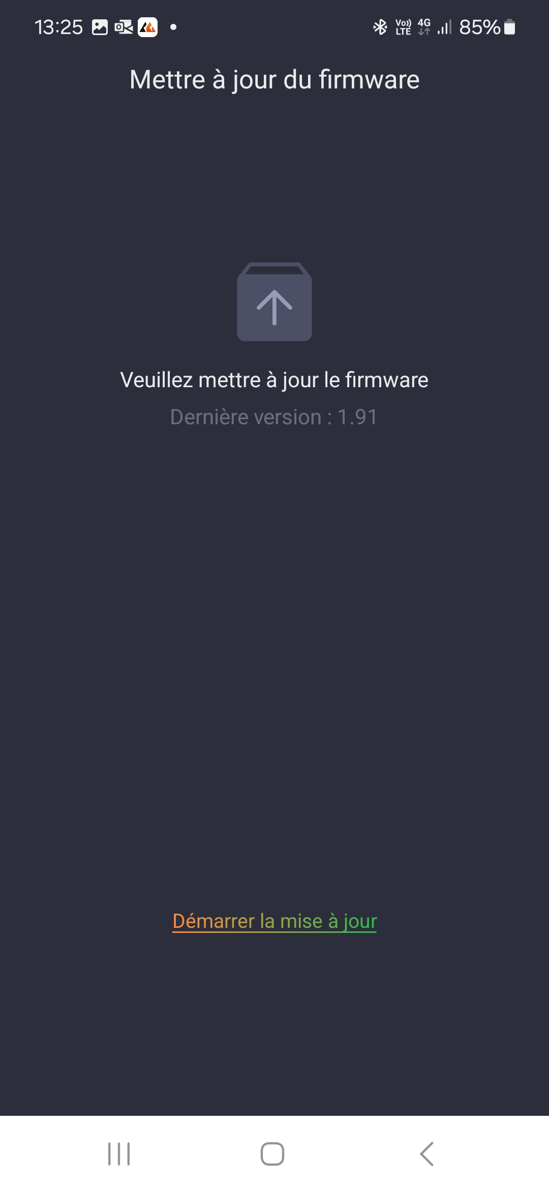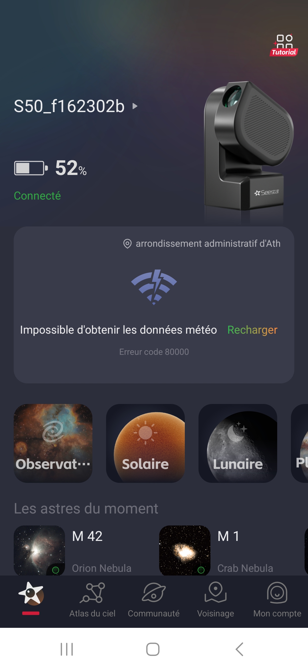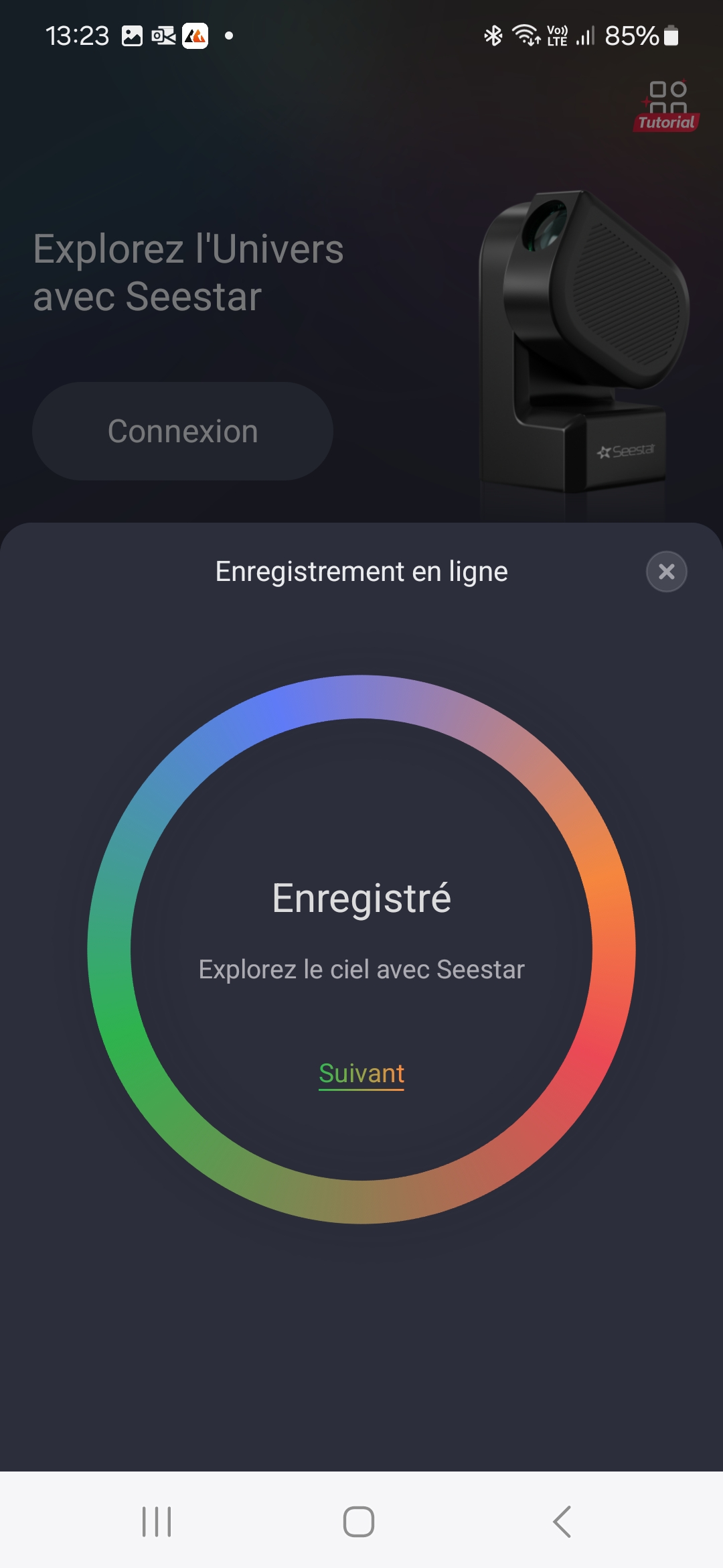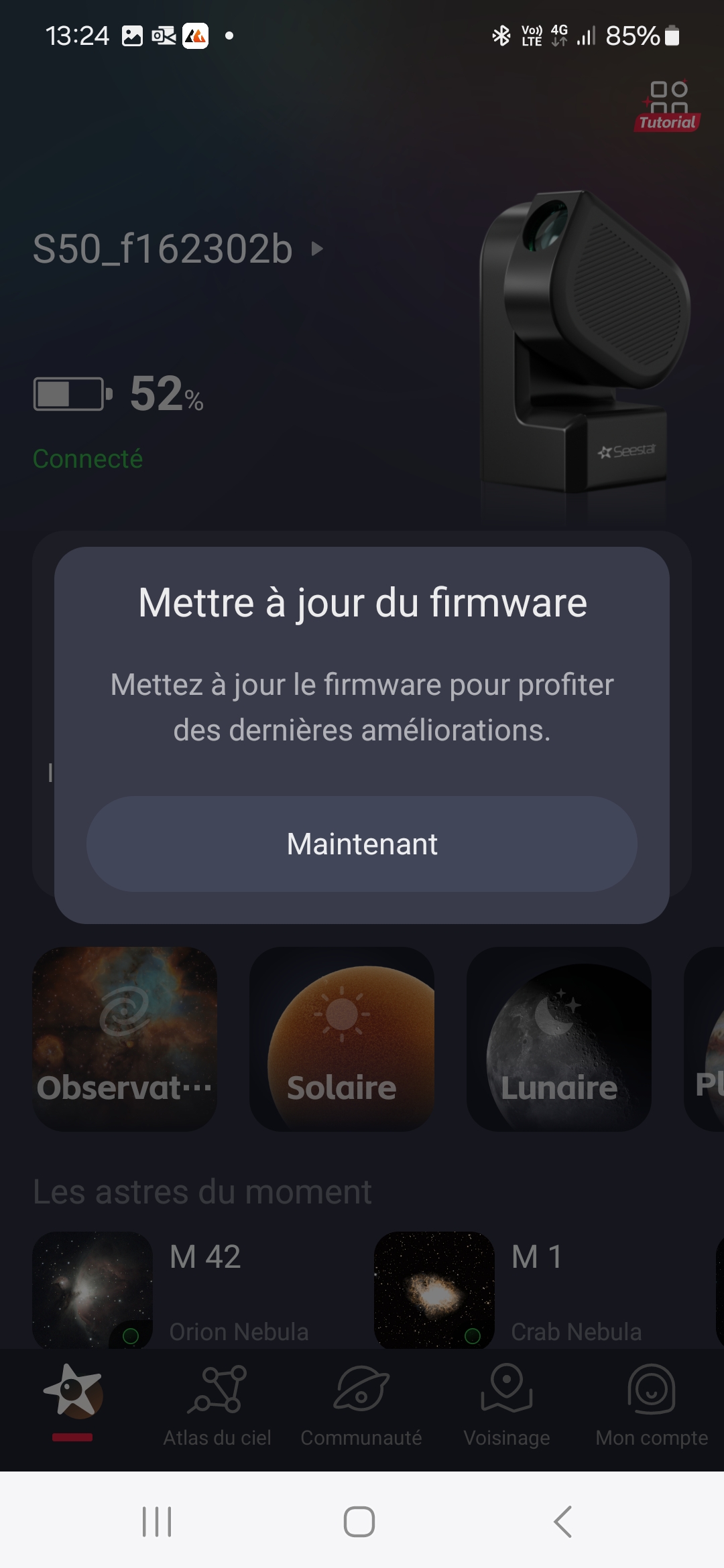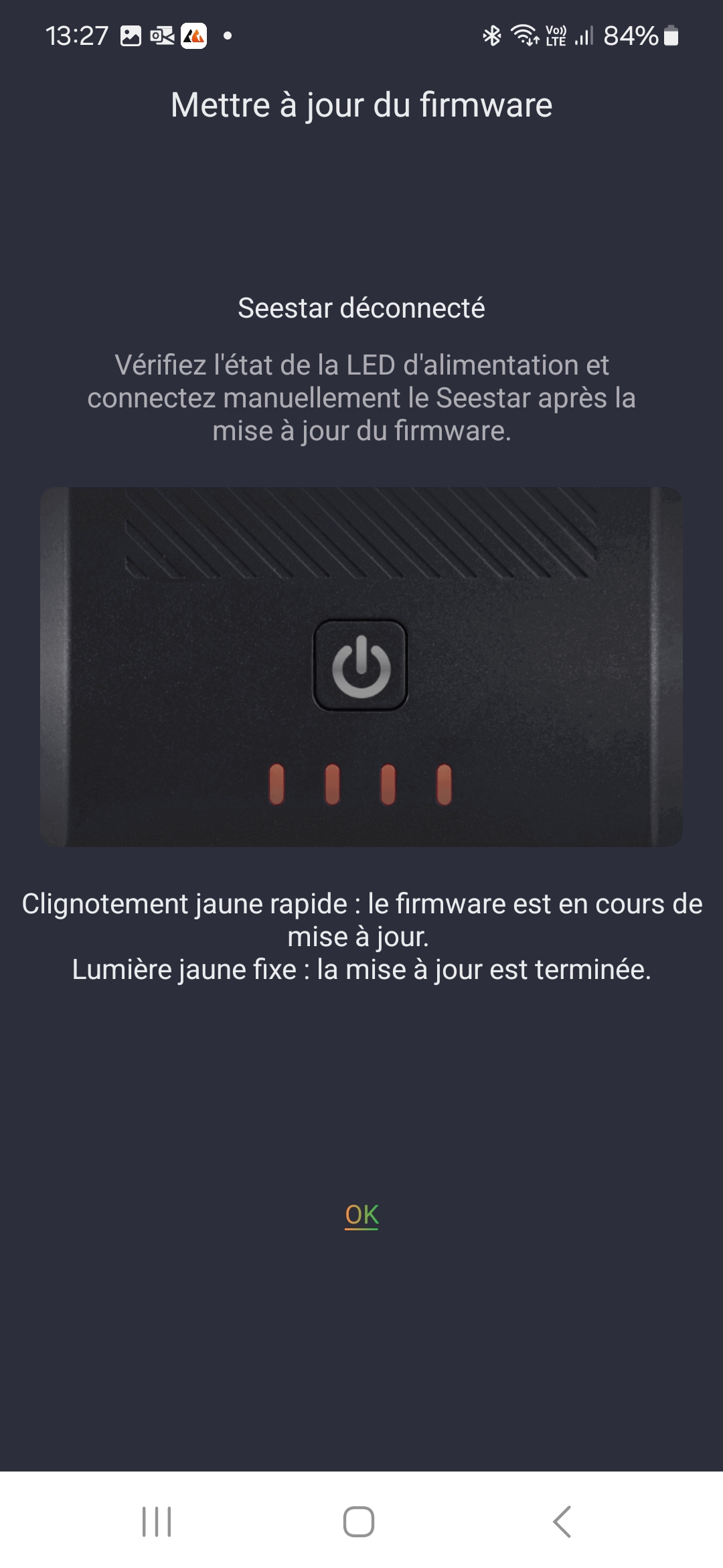 Après la première connexion, l'application va télécharger une mise à jour du logiciel du télescope et l'installer. Ceci aura aussi pour effet de configurer le télescope par rapport à votre localisation, j'ai été surpris de constater par exemple que la voix du télescope avait été changée en français.