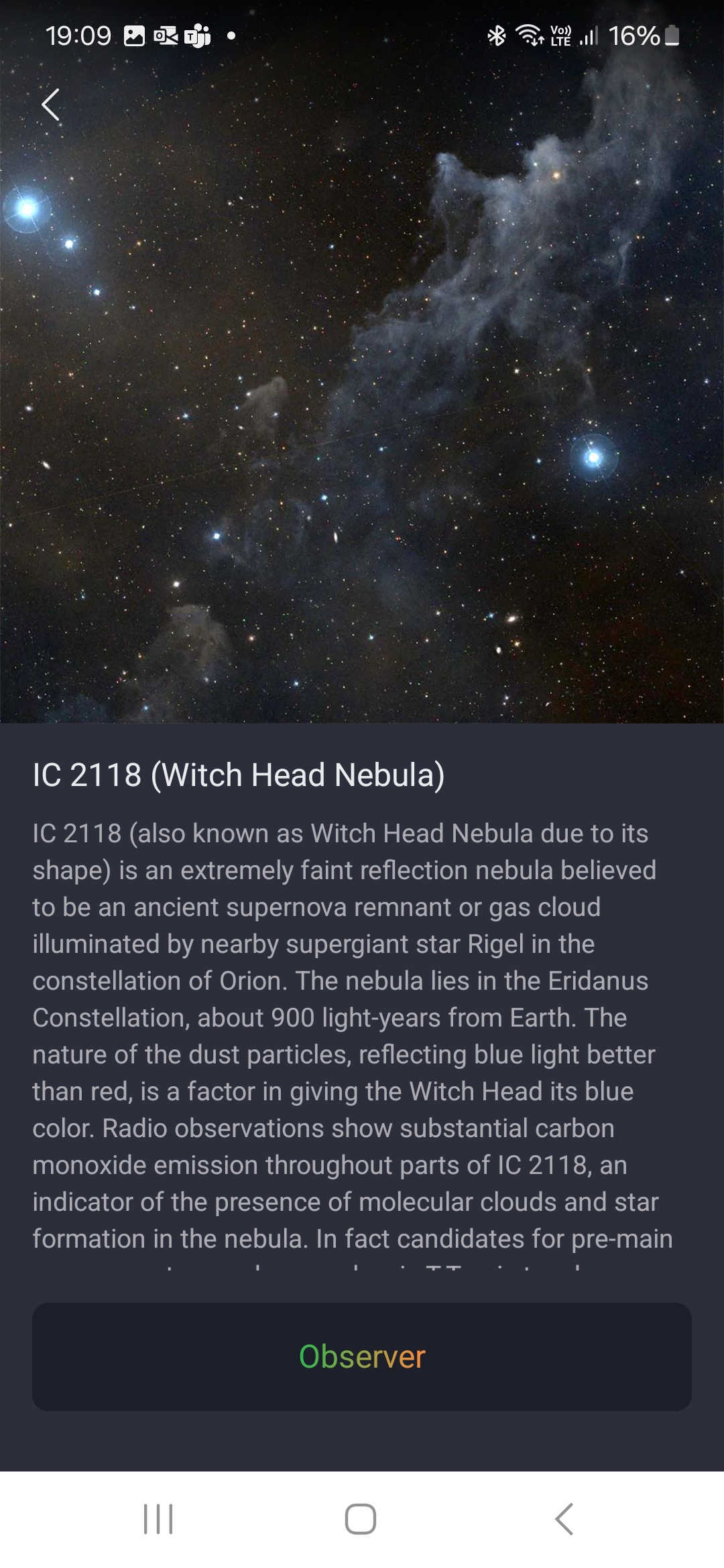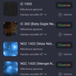 Le catalogue d'objets à observer est énorme, il y a sans doute bien plus d'objets que ce que vous pourrez réellement observer. Il me faudra des mois et des mois avant de pouvoir explorer tous les objets qui m'intéressent. Pour chaque objet, il y a une image, une description (uniquement en anglais), la possibilité de diriger le télescope vers l'objet et démarrer le suivi. Vous faites votre choix dans le menu et le télescope fait le reste!