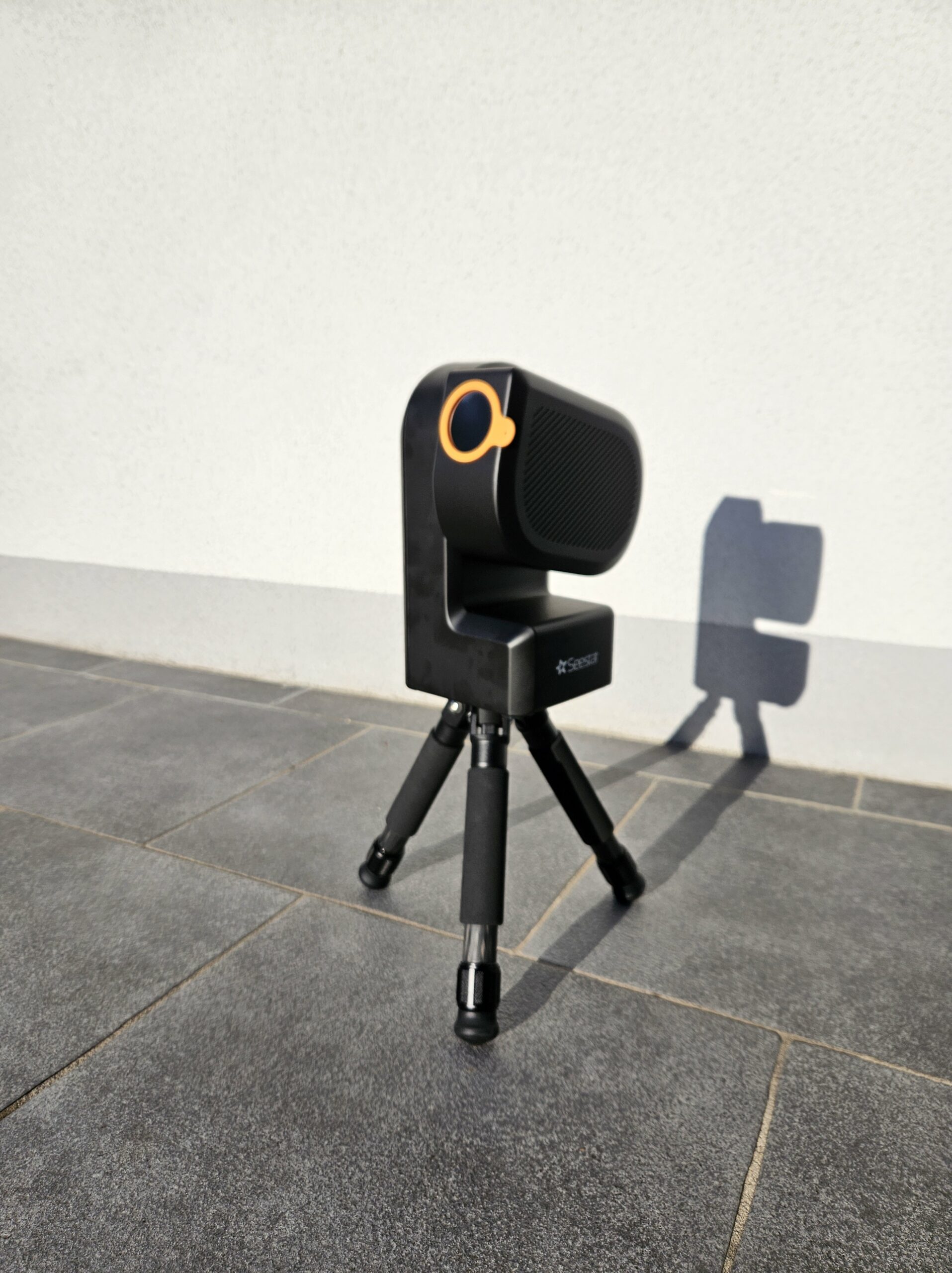 La mise en place du télescope est ultra simple, il suffit de le poser sur une surface plate. Pensez à regarder le niveau du trépied avant de fixer le télescope car une fois placé, vous ne verrez plus la bulle du trépied. Pour l'observation du soleil, vous devez absolument placer le filtre pour ne pas griller l'appareil. Dans l'application vous choisissez le soleil et le Seestar S50 va se diriger tout seul vers le soleil, faire la mise au point et enclencher le suivi automatique. Pour cette première tentative il m'a fallu plus ou moins une minute pour que le télescope se positionne au bon endroit et fasse la mise au point.