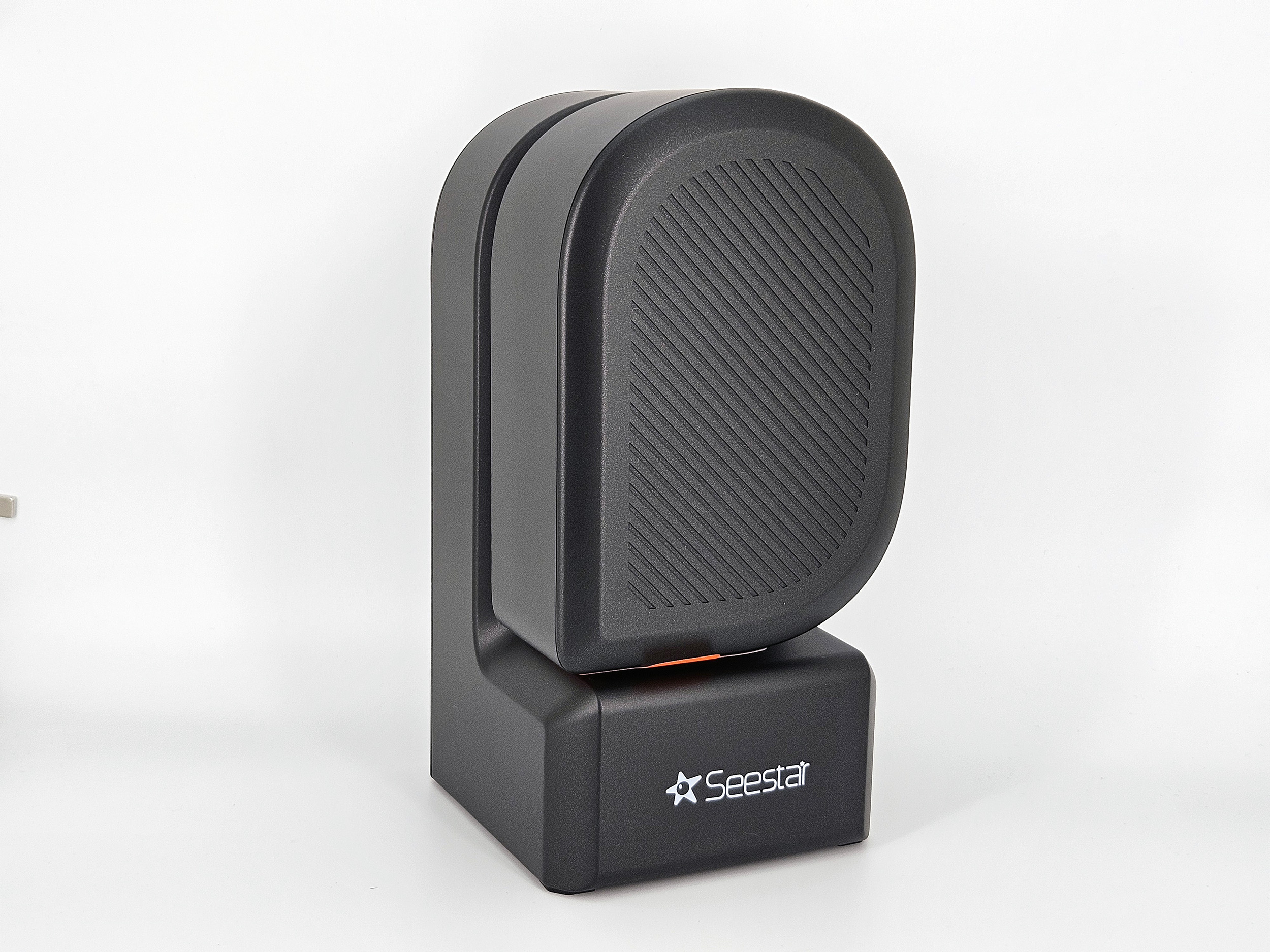 Le télescope Seestar S50 est assez grand, il mesure 24 cm sur 14 cm et 12 cm. Il est malgré tout assez léger pour être soulevé d'une main, il pèse 2.3kg. Son format me fait penser un peu au télescope de chez Vaonis et je pense que c'est sans doute le format le plus efficace pour ce genre de produit. La construction du Dwarf II est très différente mais a pour conséquence directe que la distance focale est beaucoup plus petite.