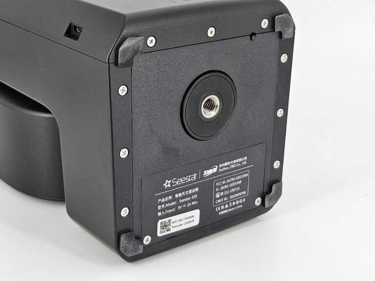 En dessous du télescope on retrouve évidemment la vis de serrage pour le trépied mais on voit ici l'axe motorisé qui va permettre au télescope de s'orienter sur l'axe horizontal. Ce mécanisme de rotation ne va pas créer un décalage entre le télescope et son pied comme c'était le cas sur le Dwarf II, il va donc occuper le même espace peu importe sa position.