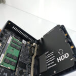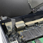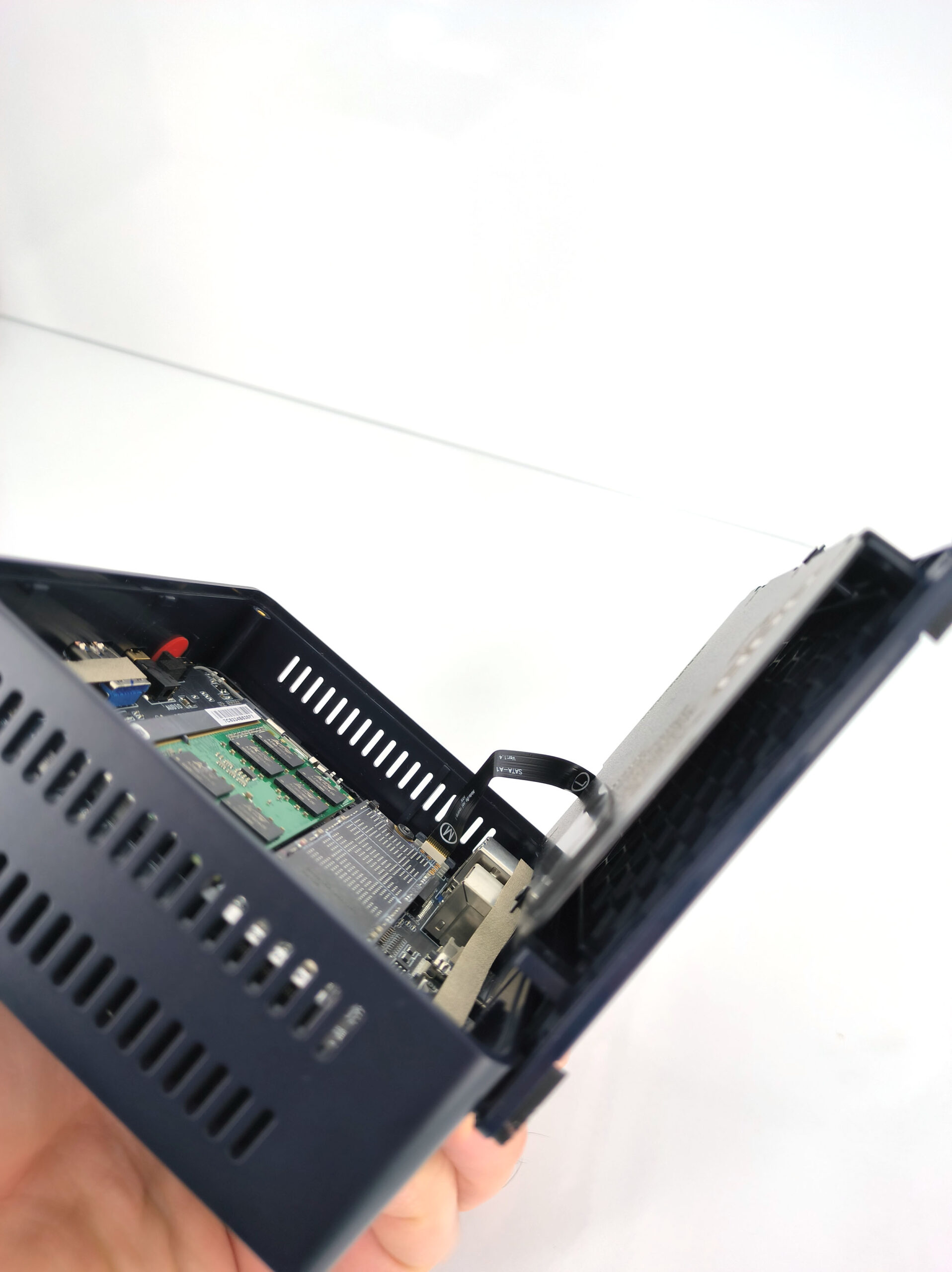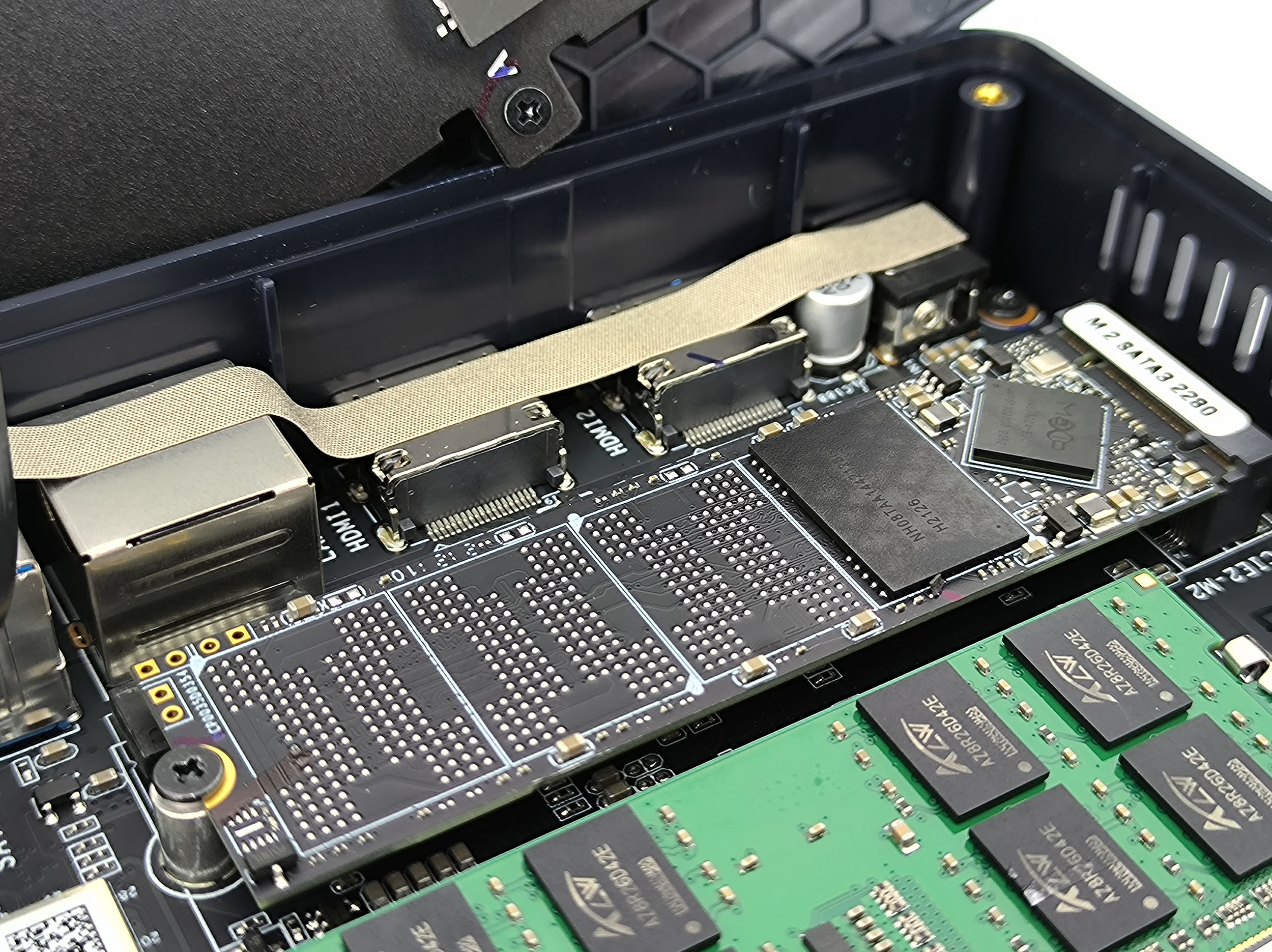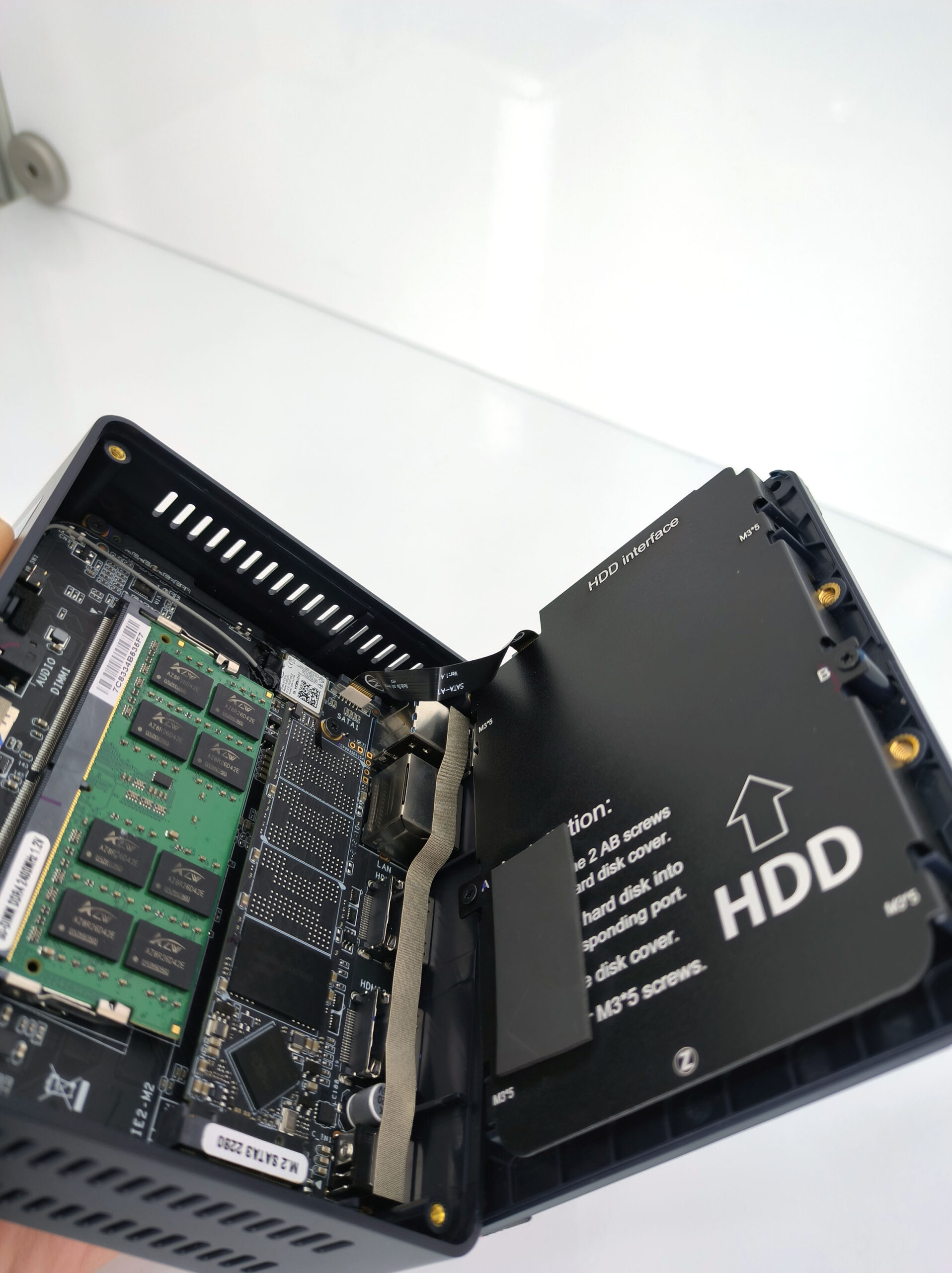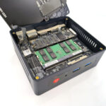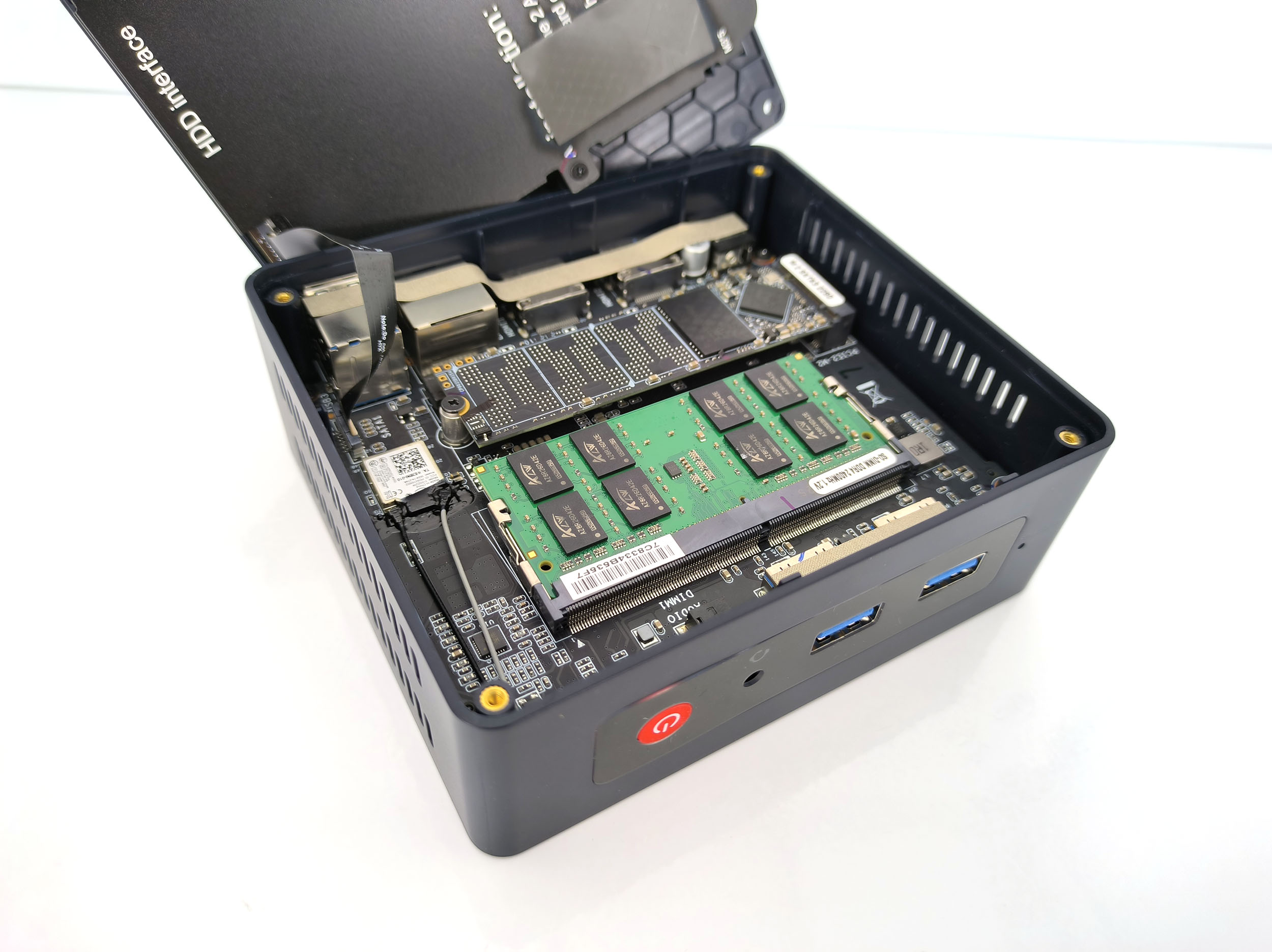 Vous pouvez facilement dévisser le plateau inférieur du Beelink pour voir ce qu'il a dans le ventre. Ici aussi la conception est assez simple, il y a 3 niveaux. Il y a un niveau qui héberge le processeur et son ventilateur, un niveau avec la mémoire et le disque SSD en format M2 et finalement un étage permettant d'accueillir un disque dur SSD au format SATA. Et tout ceci tient parfaitement dans un espace réduit. Le plus gros défi sera de gérer la montée en température du processeur.