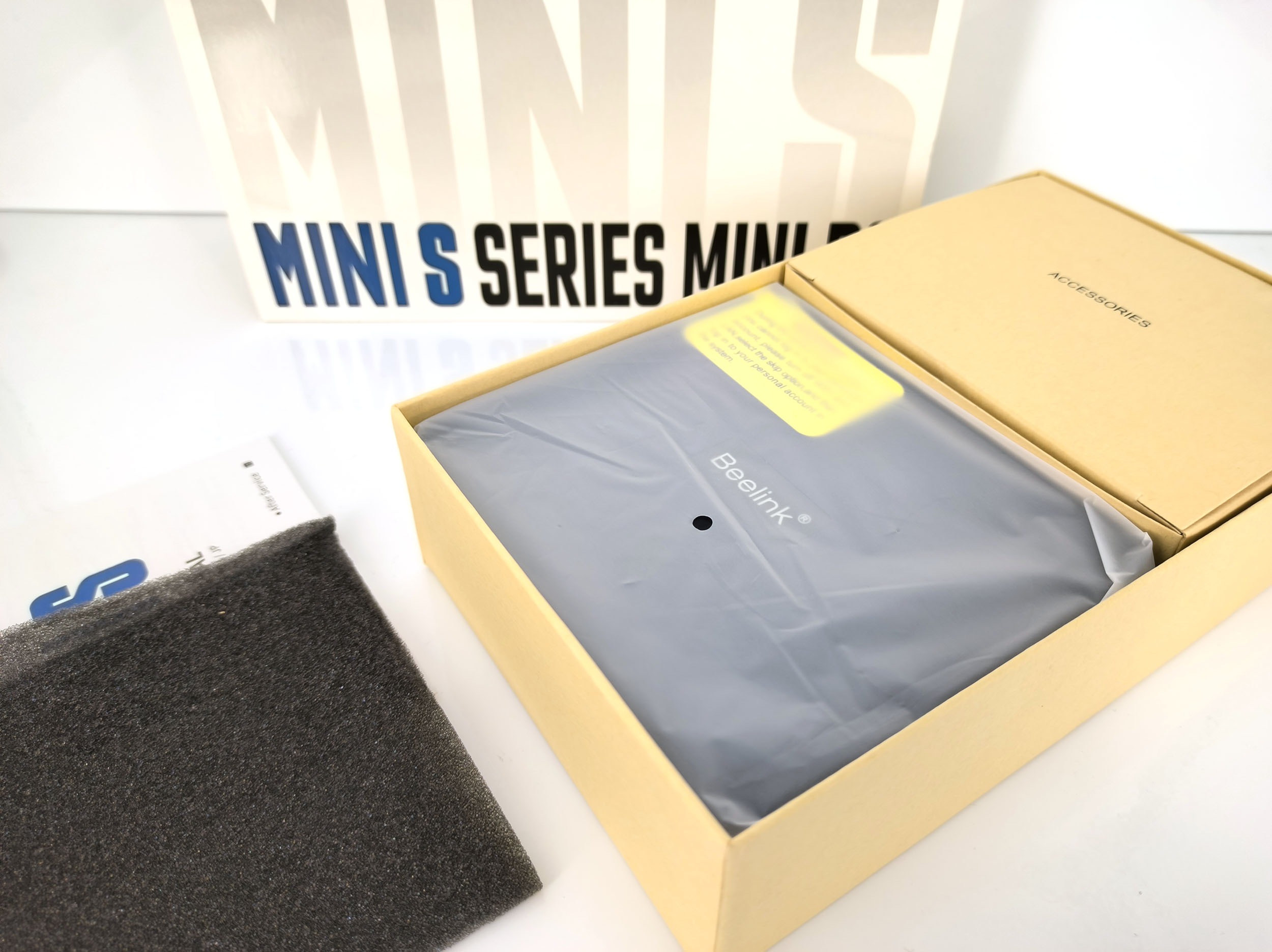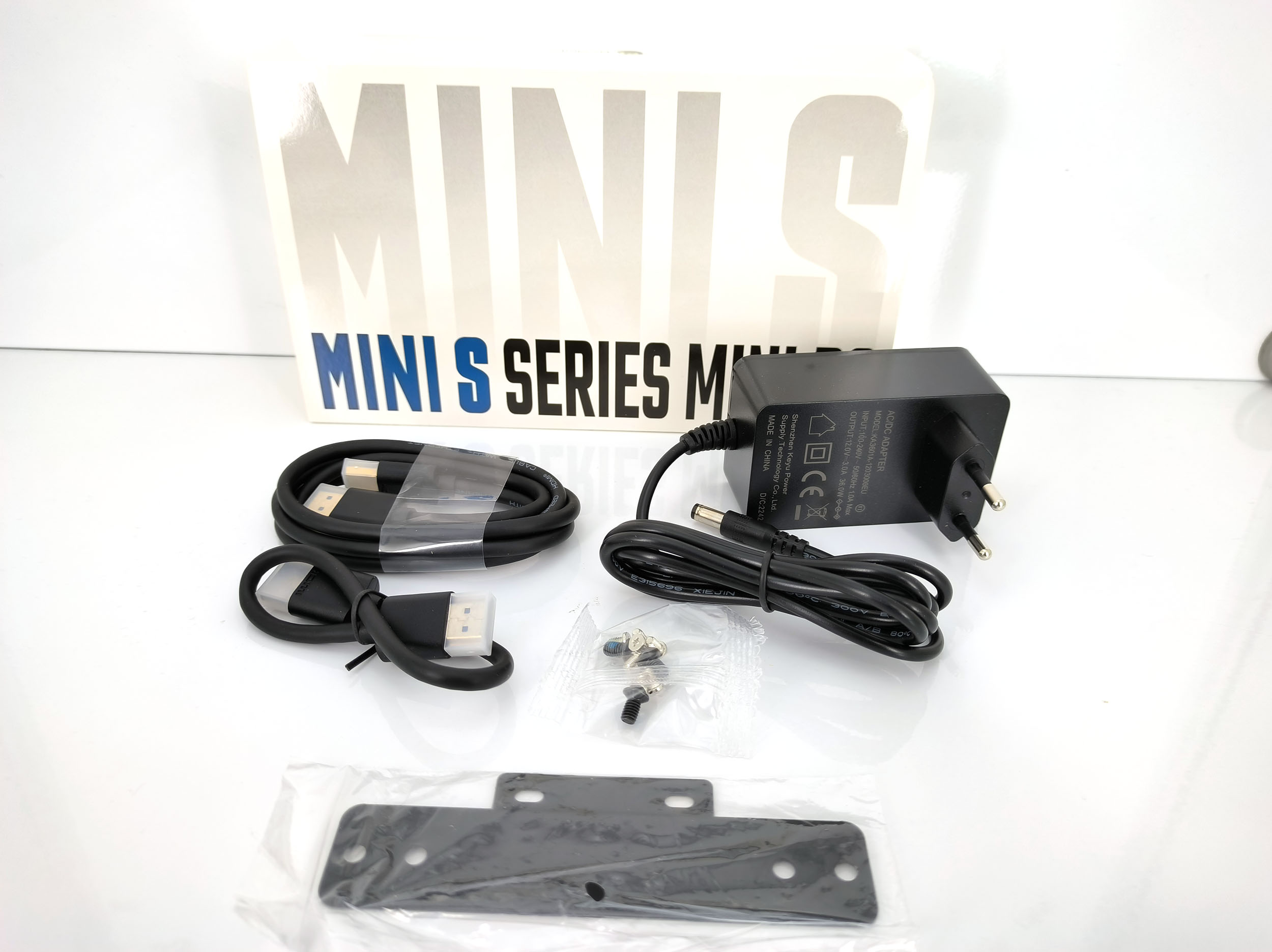 La boite du Beelink n'est pas "anonyme" comme la plupart des mini PCs chinois vendus sur Aliexpress, il y a un minimum d'identité de marque qui inspire confiance au déballage. J'ai acheté des produits de ce type qui étaient livrés nus dans du papier à bulles. La boite contient l'unité centrale, un bloc d'alimentation, un câble USB, un câble HDMI, un manuel et un support pour attacher l'ordinateur derrière un écran.