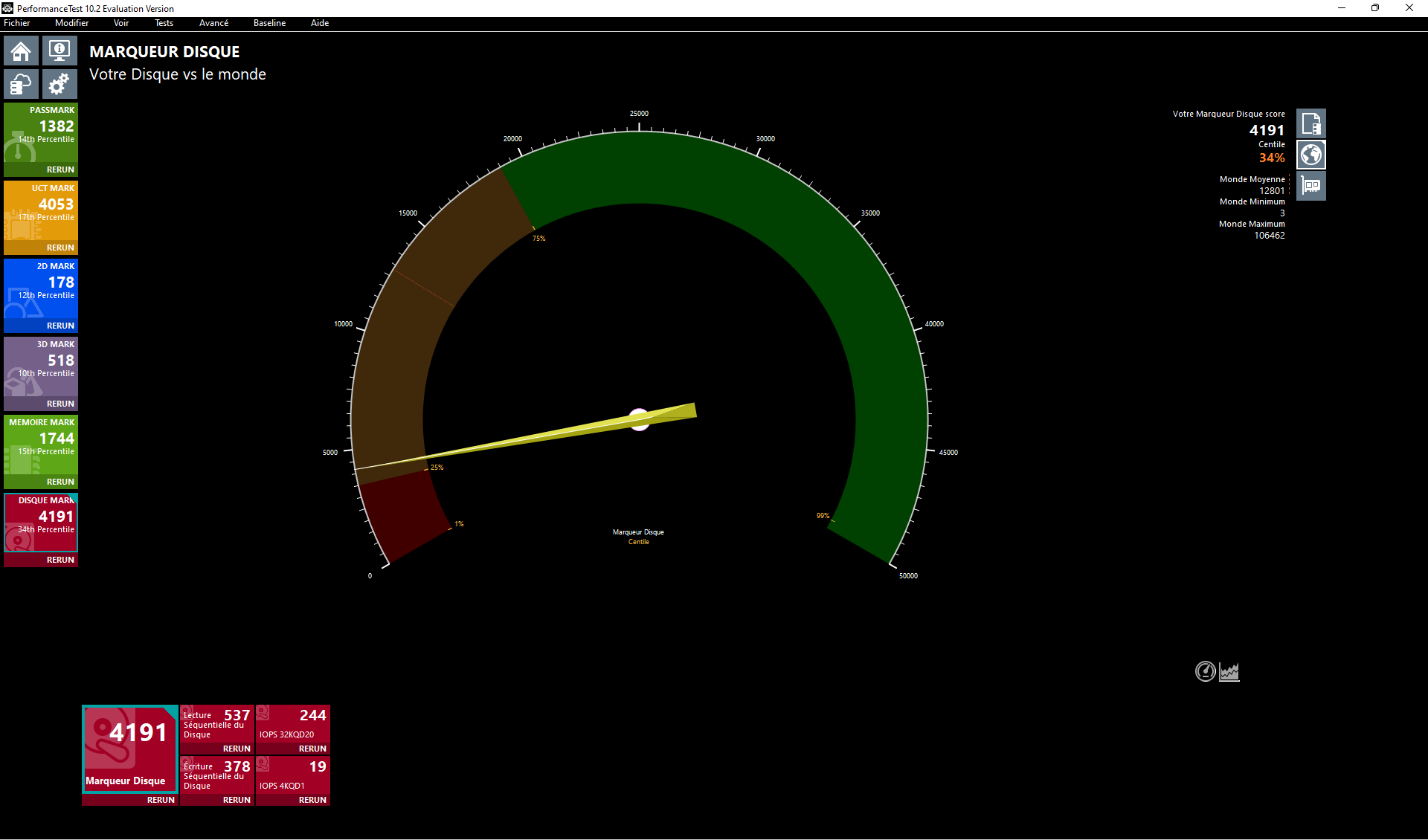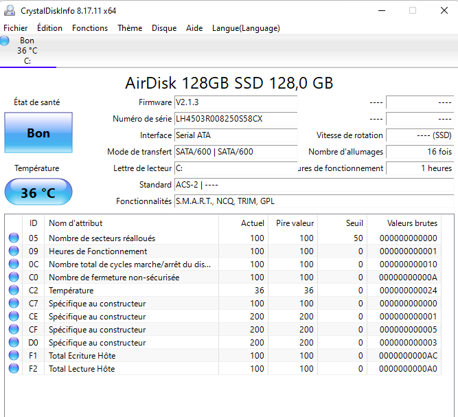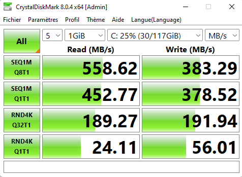 Voici un rapport de performance du disque fait avec CrystalDisk: