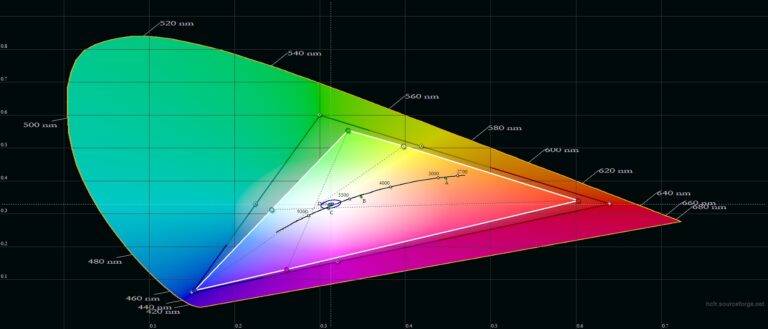 L'espace de couleurs (aussi appelé gamut) correspond à la palette de couleurs qu'un écran est capable d'afficher. Il existe différentes normes, j'ai utilisé le REC709 pour mesurer cet écran et je constate que l'écran n'arrive même pas au niveau de la norme. Le triangle blanc devrait être aussi grand que le triangle noir mais on voit que les couleurs produites par cet écran sont plus limitées que la norme. Ce n'est pas très étonnant de voir ça dans cette gamme de prix, cet écran n'est pas conçu pour faire de la retouche photo/vidéo.