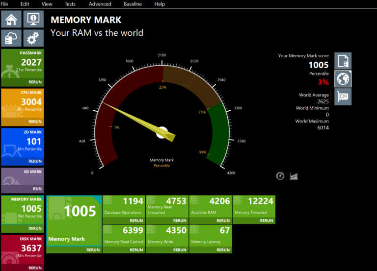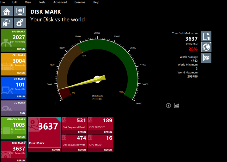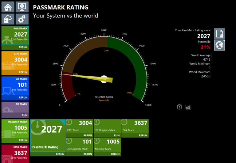 Pour tester la performance globale, j'utilise le logiciel Passmark qui permet de situer les performances d'un ordinateur par rapport à des milliers d'autres tests. J'ai obtenu un score de 2027 points au total, ce score est en dessous de la moyenne mondiale et c'était tout à fait prévisible pour un ordinateur dans cette tranche de prix. Les performances se situent dans les 21% du bas du tableau. Le petit PC Beelink qui utilise également un Celeron fait un peu mieux mais il ne s'agit que d'un boitier et pas un ordinateur complet.