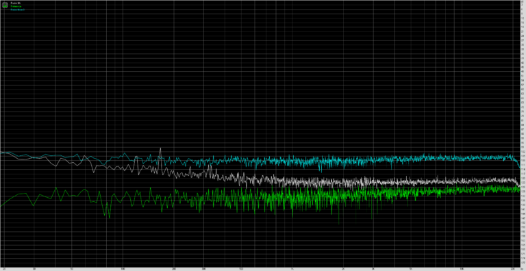 Ce test vise à tester la capacité de l’appareil à reproduire correctement toutes les fréquences. La ligne blanche au milieu du graphique est la situation idéale et les autres couleurs proviennent des tests sur différents téléphones. Une déviation de la ligne de référence indique un écart par rapport à la situation idéale. Pour voir un bon son sur toutes les fréquences il faut donc s’approcher le plus possible de la ligne de référence.