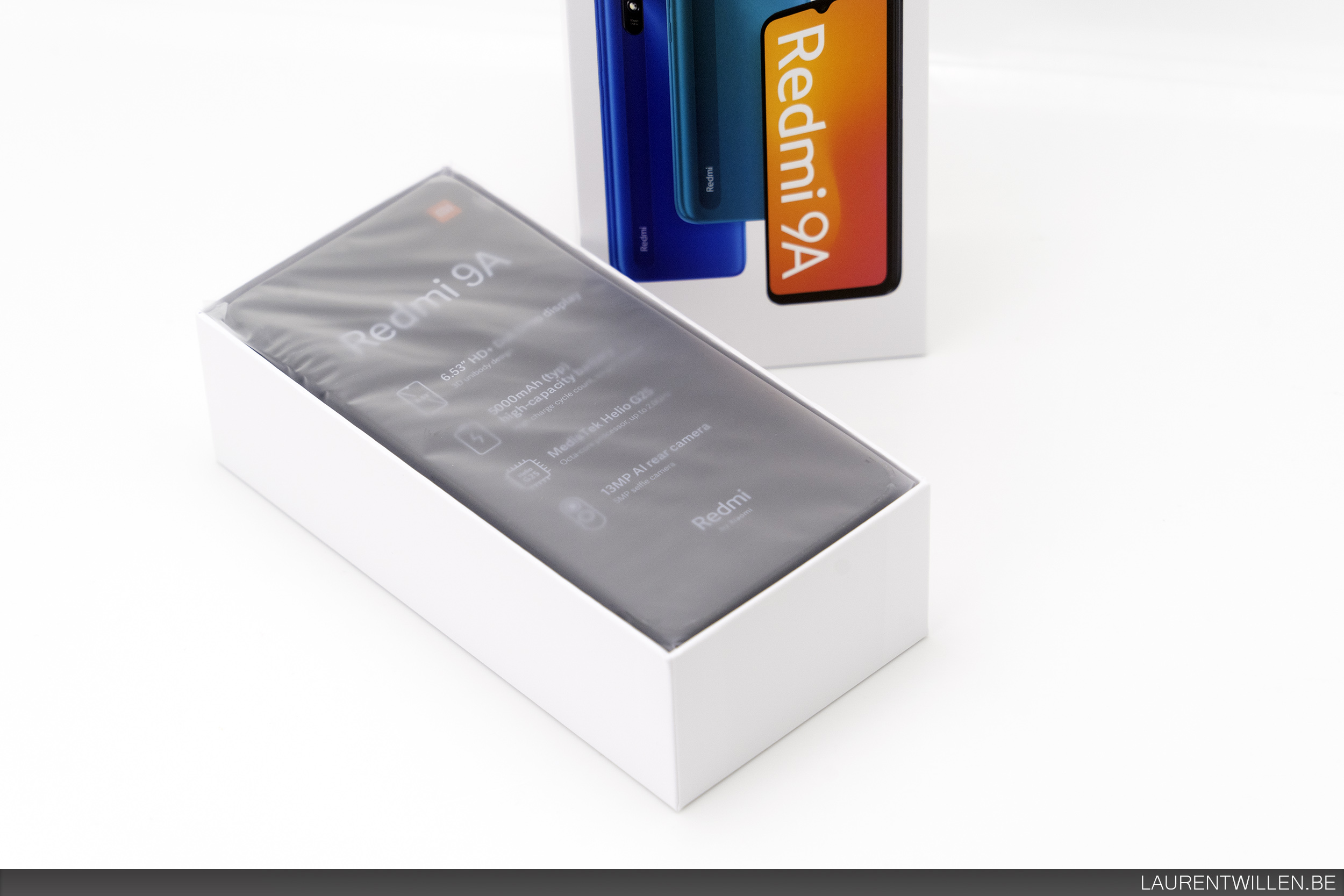 Le Redmi 9A est emballé dans une boite identique à ce que Xiaomi fait pour ses autres modèles. La boite contient le téléphone, un chargeur, un cable micro USB et de la documentation. La boite ne contient pas de protection transparente.