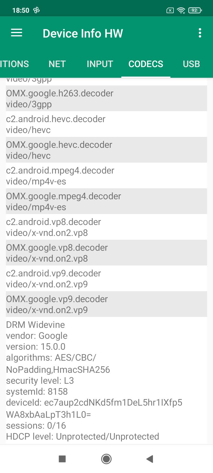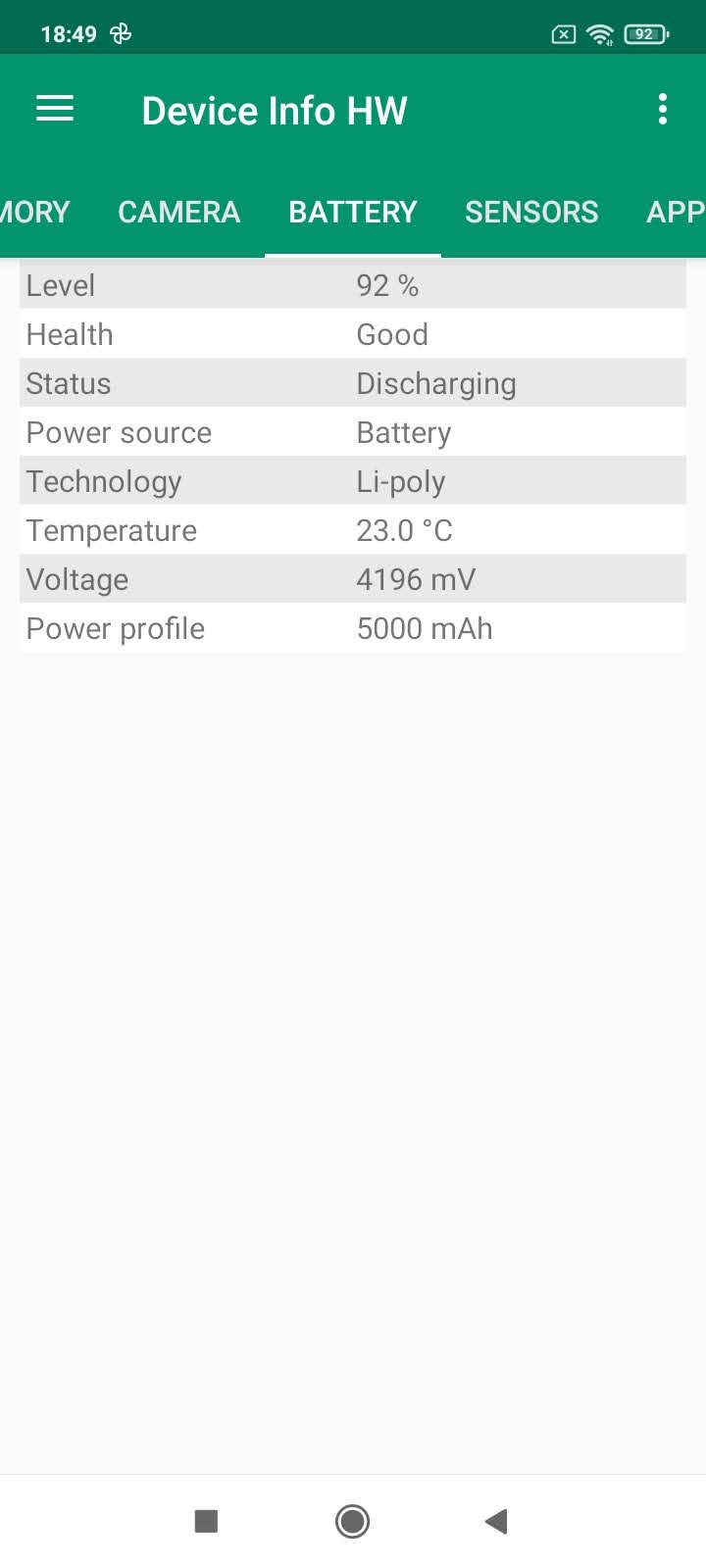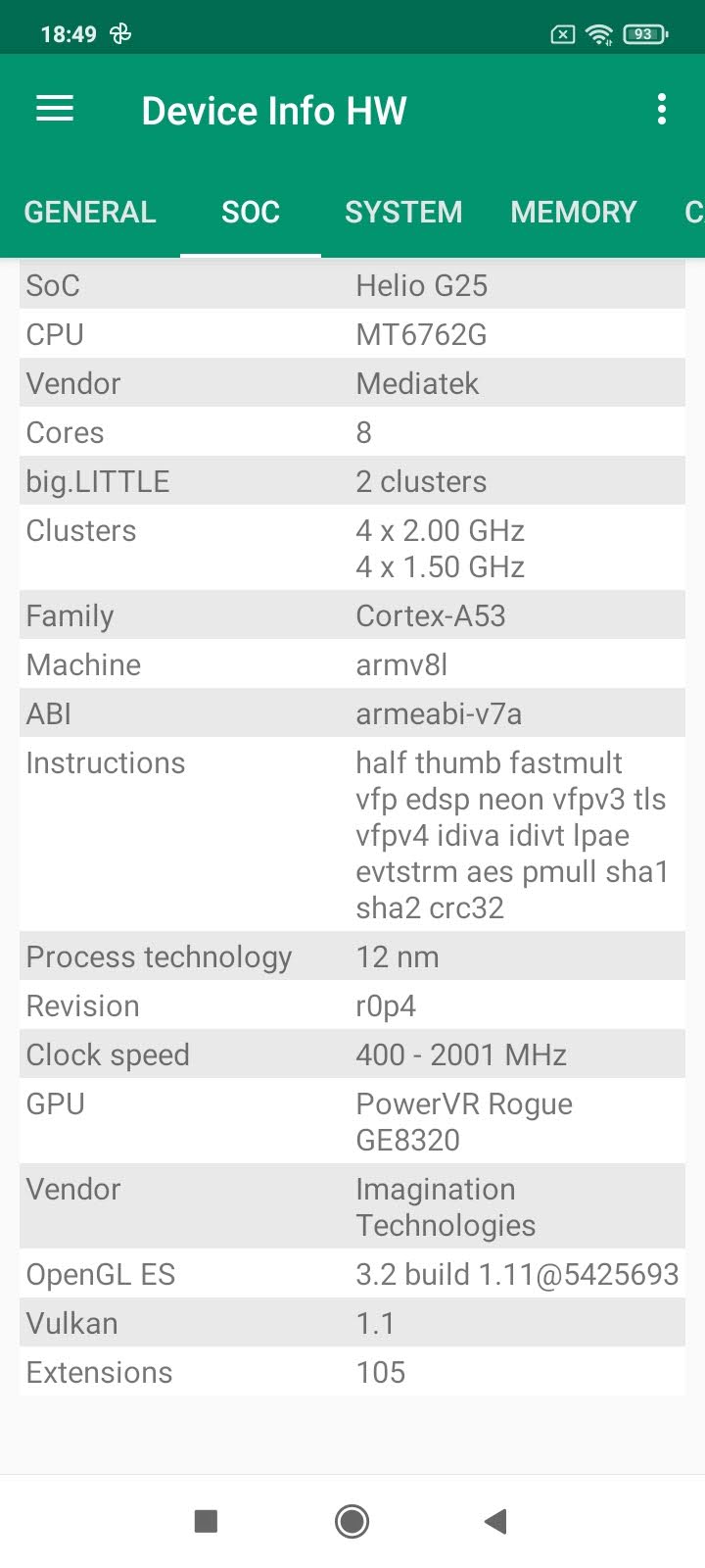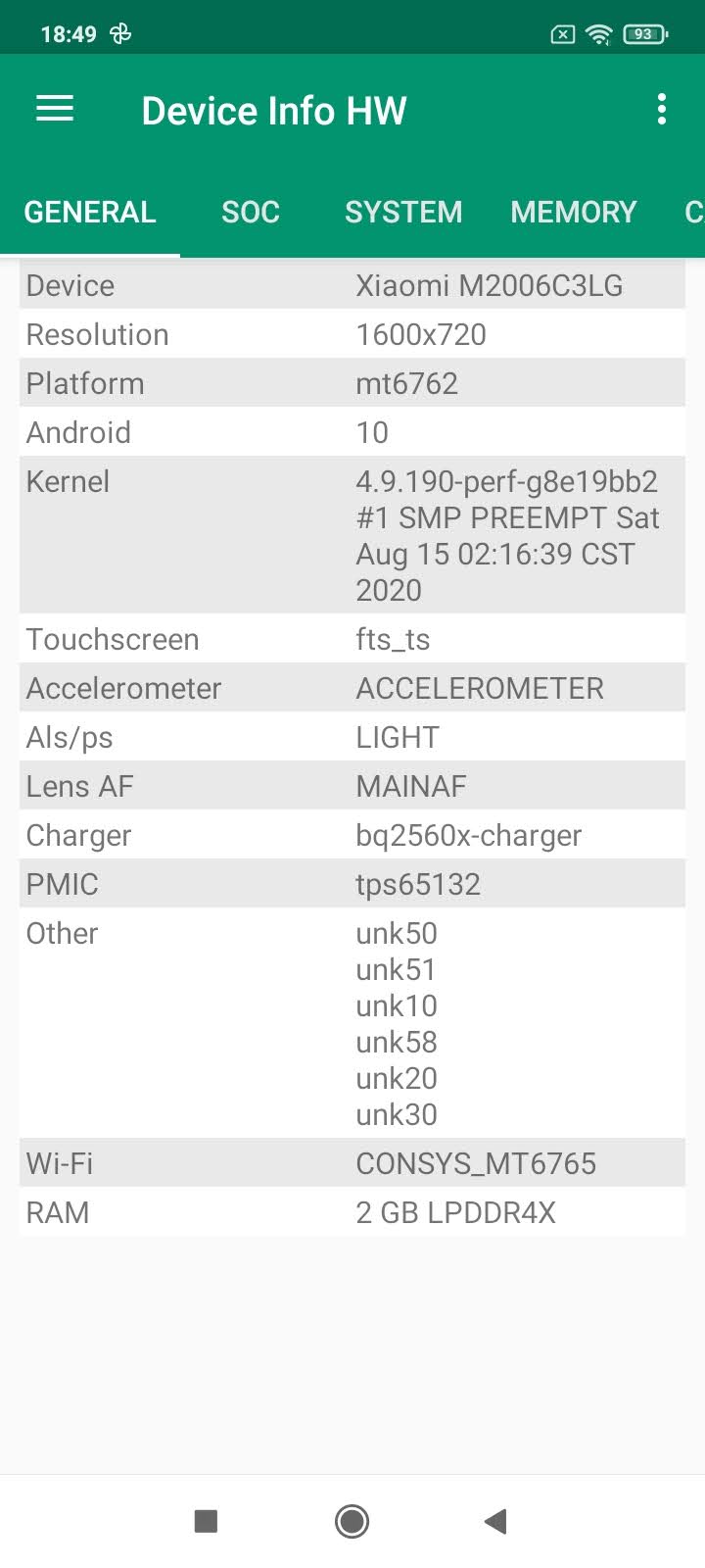 Les informations ci-dessous proviennent de l'application Device Info HW. L'application fournit des informations techniques détaillées sur le téléphone testé.