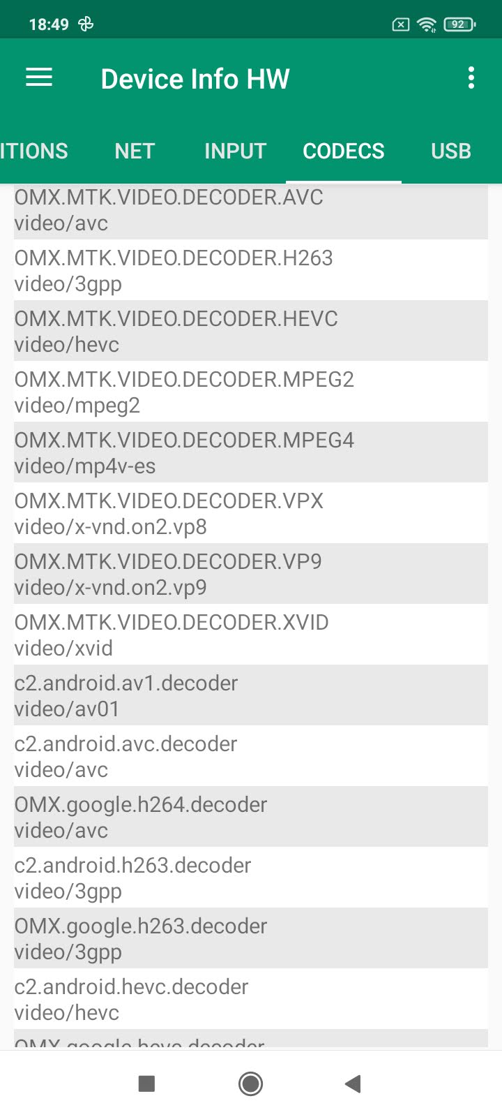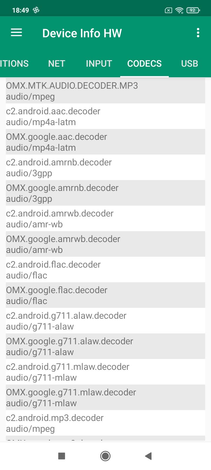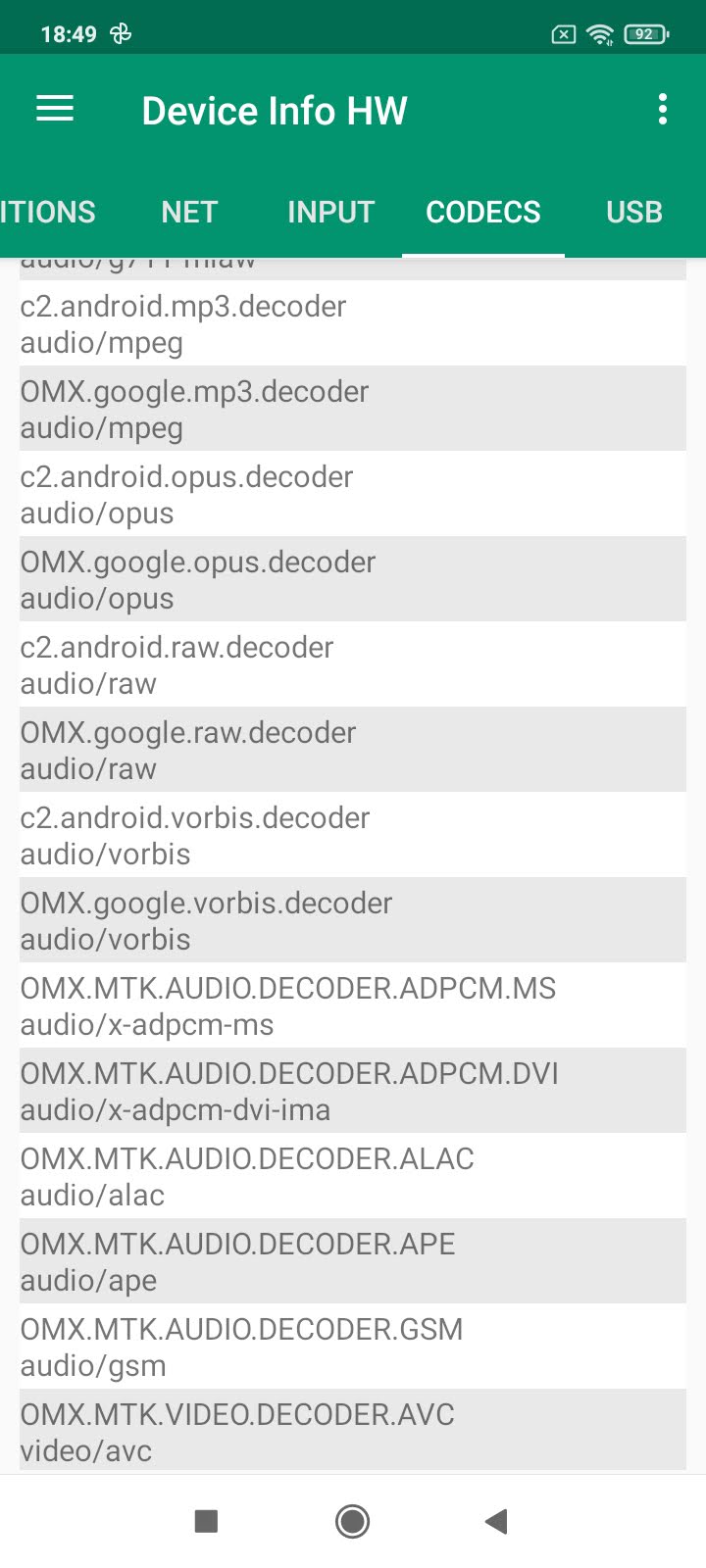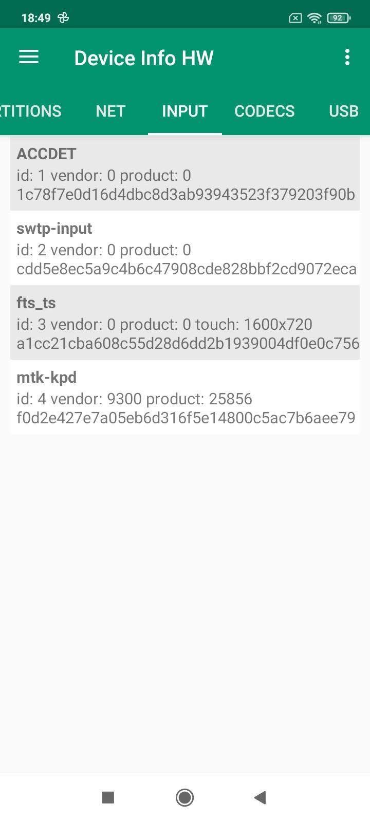 Les informations ci-dessous proviennent de l'application Device Info HW. L'application fournit des informations techniques détaillées sur le téléphone testé.