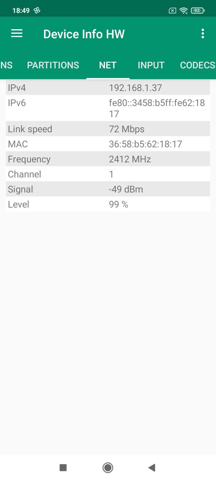 J'ai mesuré un signal de -19 dBm à proximité du routeur, c'est un bon score indiquant une bonne sensibilité au wifi. J'ai mesuré -63 dBm à distance, c'est un excellent score qui s'explique par la fréquence utilisée par le Redmi 9A. Le téléphone utilise la fréquence 2.4Ghz qui permet de capter un signal plus loin mais cela se fait au détriment de la vitesse de téléchargement.