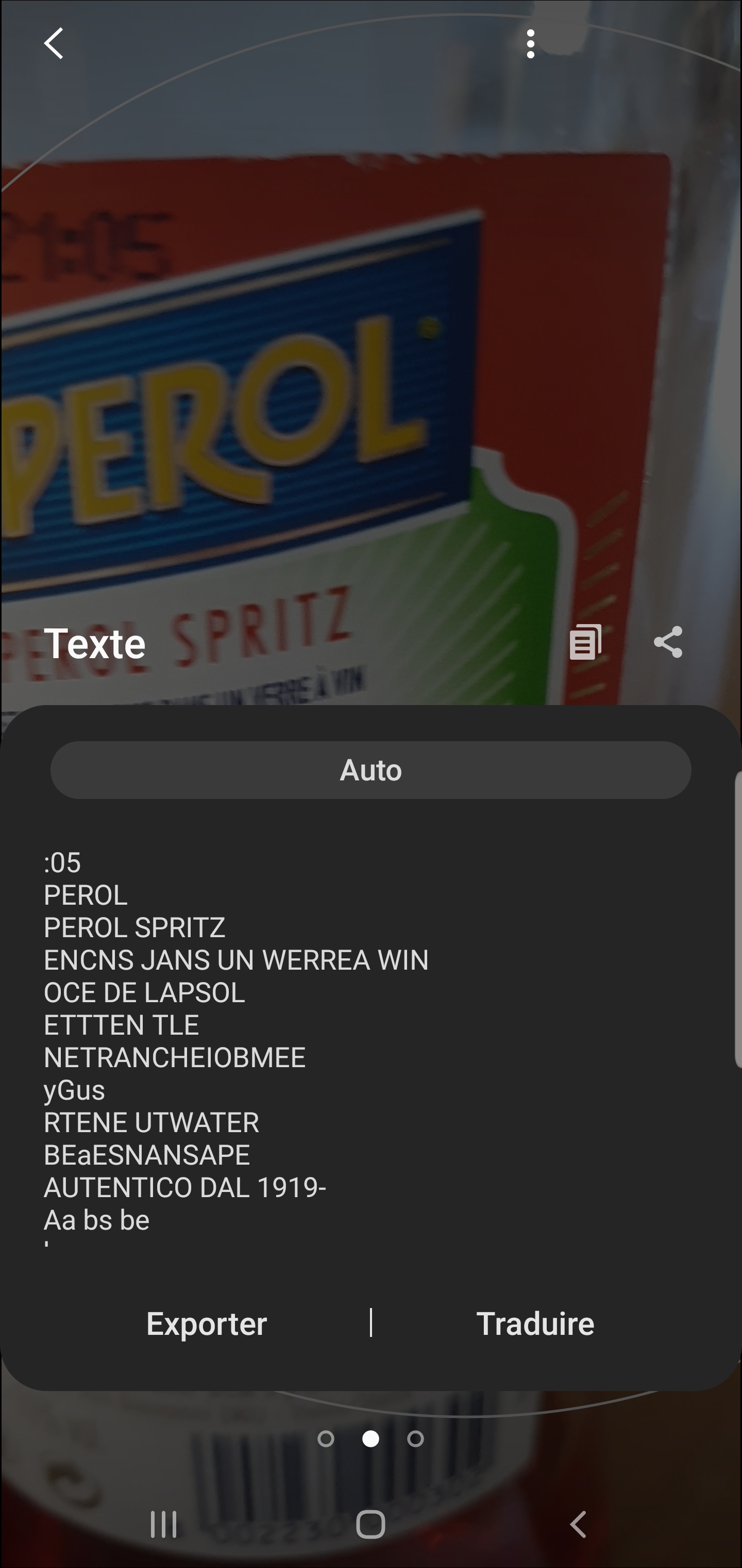J'ai utilisé la reconnaissance de texte pour voir si Bixby allait reconnaitre le texte de l'étiquette mais le résultat n'est franchement pas très bon, pas un seul mot n'a été reconnu correctement.