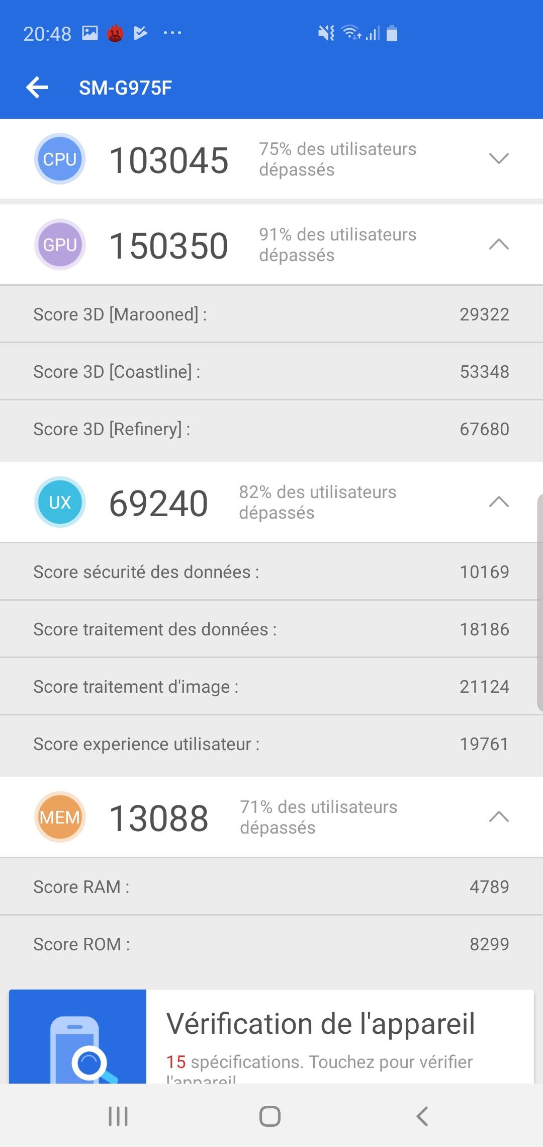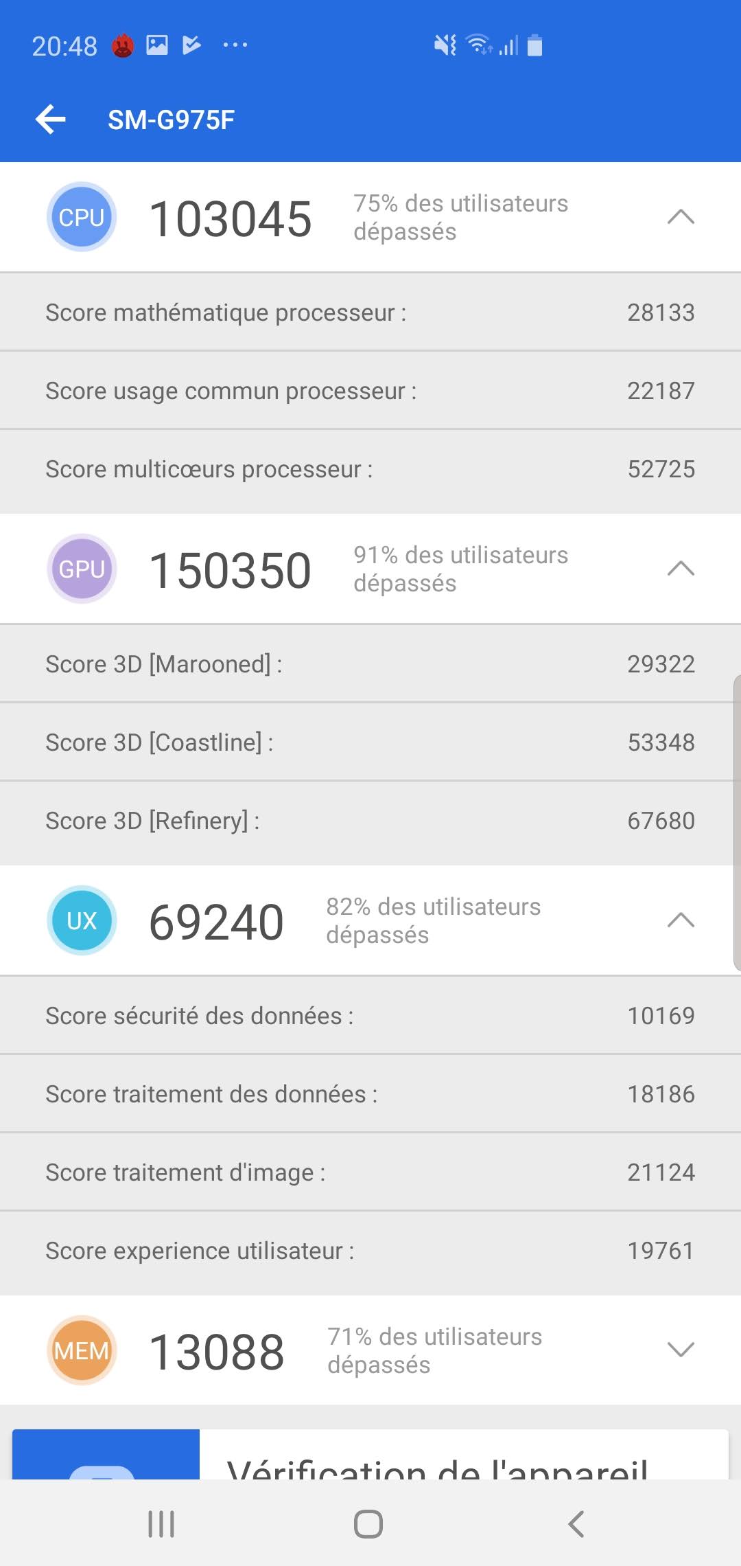 Le test avec Antutu révèle que c'est surtout le processeur graphique Mali G76 qui domine la plupart des appareils sur le marché, il dépasse 91% des appareils mesurés. Avec 3D Mark, on obtient le même genre de résultat. Le s10+ est une machine de compétition!