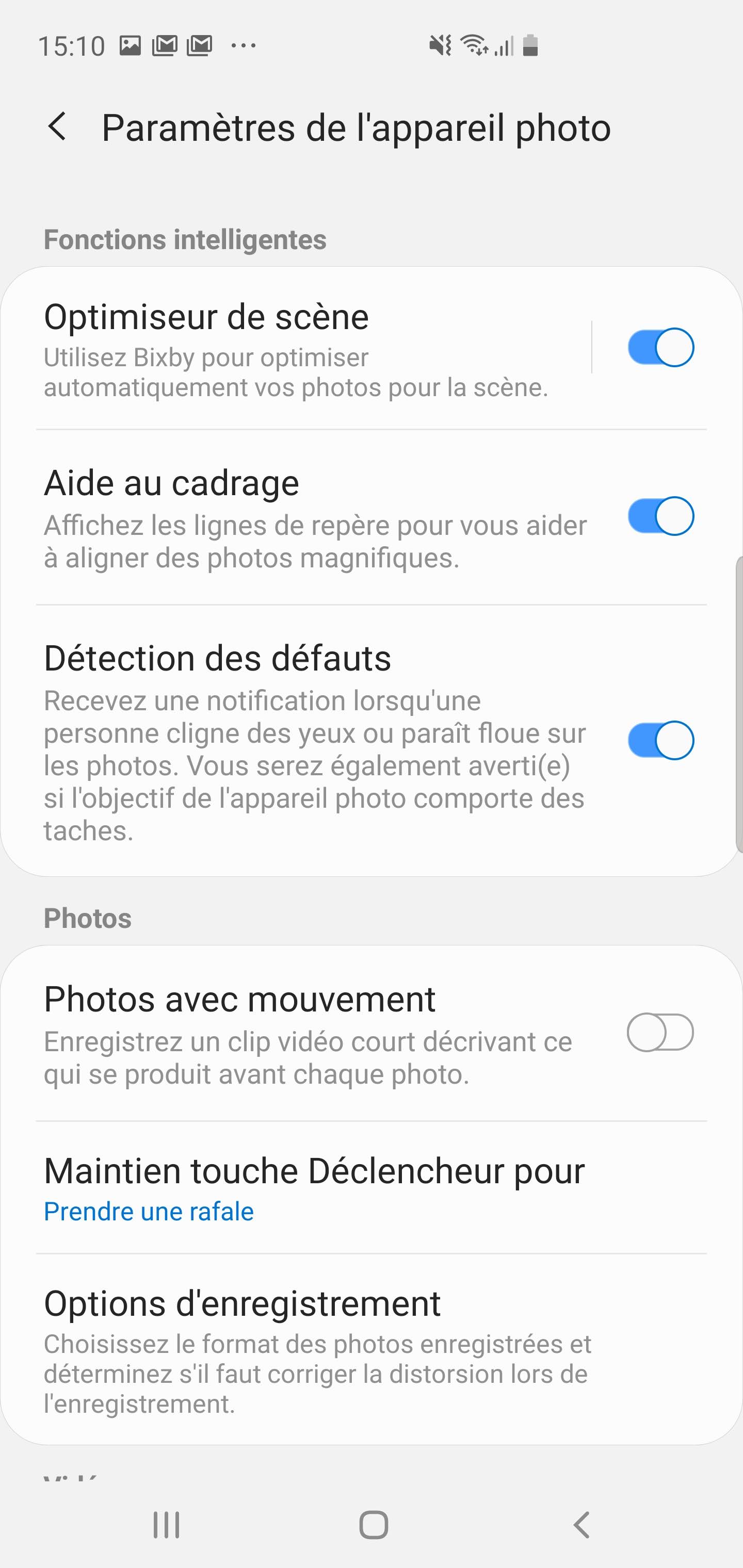 L'application photo de base est fournie par Samsung, elle ne ressemble donc pas à ce que j'ai vu jusqu'à présent et ce n'est pas toujours une bonne chose malheureusement. L'application offre une multitude de choix, d'un côté c'est bien mais d'un autre côté cela ajoute une complexité inutile à l'interface. La plupart des gens vont se contenter d'utiliser le mode automatique, toutes les options supplémentaires devraient être classées ailleurs.