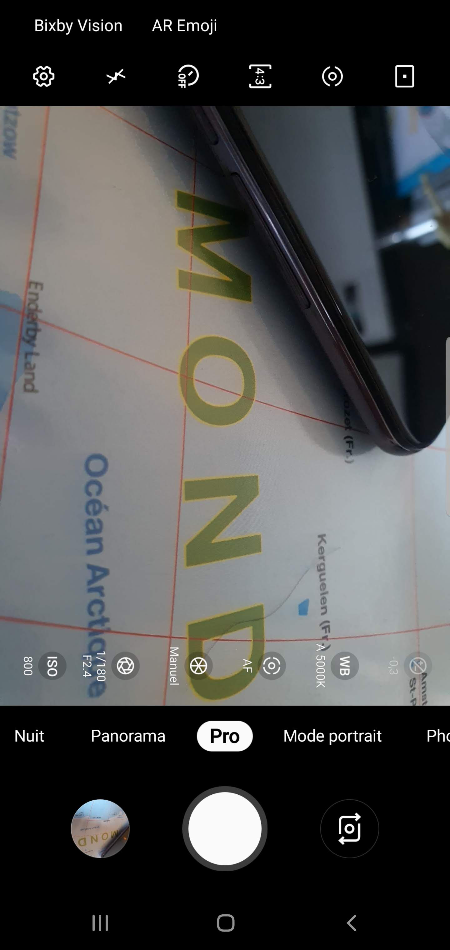 Le mode pro donne la possibilité de régler l'obturateur, le diaphragme (c'est très rare!), le niveau ISO, la température des couleurs, le contraste, la saturation, la netteté, les ombres ainsi que le focus. C'est de loin le mode pro le plus élaboré que j'ai pu tester jusqu'à présent. Ce mode pro est capable de produire des fichiers RAW. Le seul gros défaut du mode pro c'est que les icones sont affichés sur la zone de capture de la photo. Cela pose problème lorsque l'écran affiche des couleurs claires parce que les icones sont blancs et donc du blanc sur une couleur claire, c'est illisible.