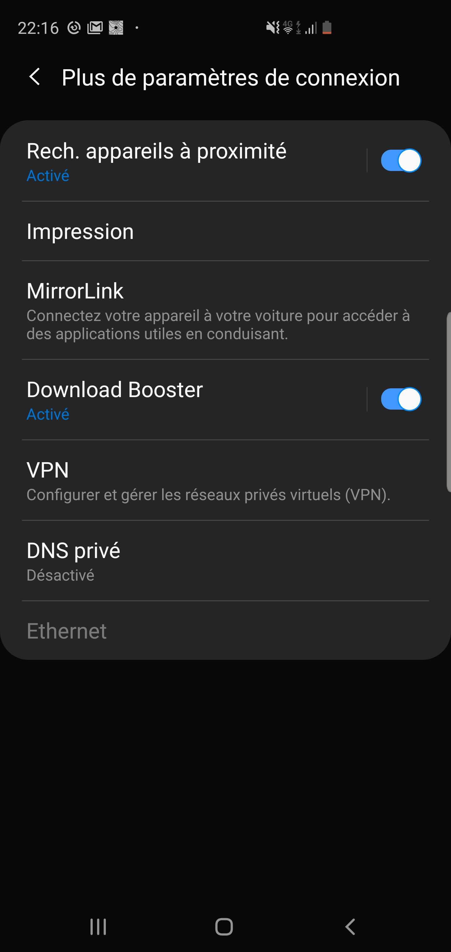 J'ai commencé mes tests de performance en 4G comme je le fait d'habitude en me plaçant sur une cellule 4G qui est capable de délivrer un bon débit et j'attends que la qualité du signal soit bonne pour faire les tests. En utilisant cette méthode sur le Galaxy S10+ j'ai obtenu des résultats médiocres. J'ai d'abord pensé qu'il s'agissait d'un problème avec le réseau ou de la cellule mais en testant d'autres endroits, j'ai également obtenu des scores parmi les plus bas parmi les téléphones que j'ai testés. Je me suis dit que ce n'était pas possible avec un téléphone de ce type, je suis donc allé voir dans les options si il ne fallait pas activer quelque chose...et j'ai trouvé! Il existe un mode "boost" dans les paramètres réseaux (tout en bas de l'écran) et en activant ce mode, j'obtiens un tout autre résultat