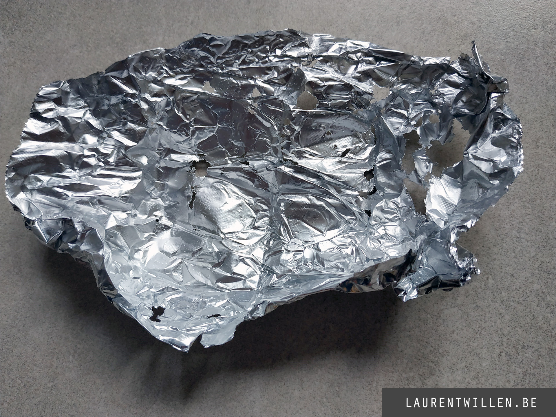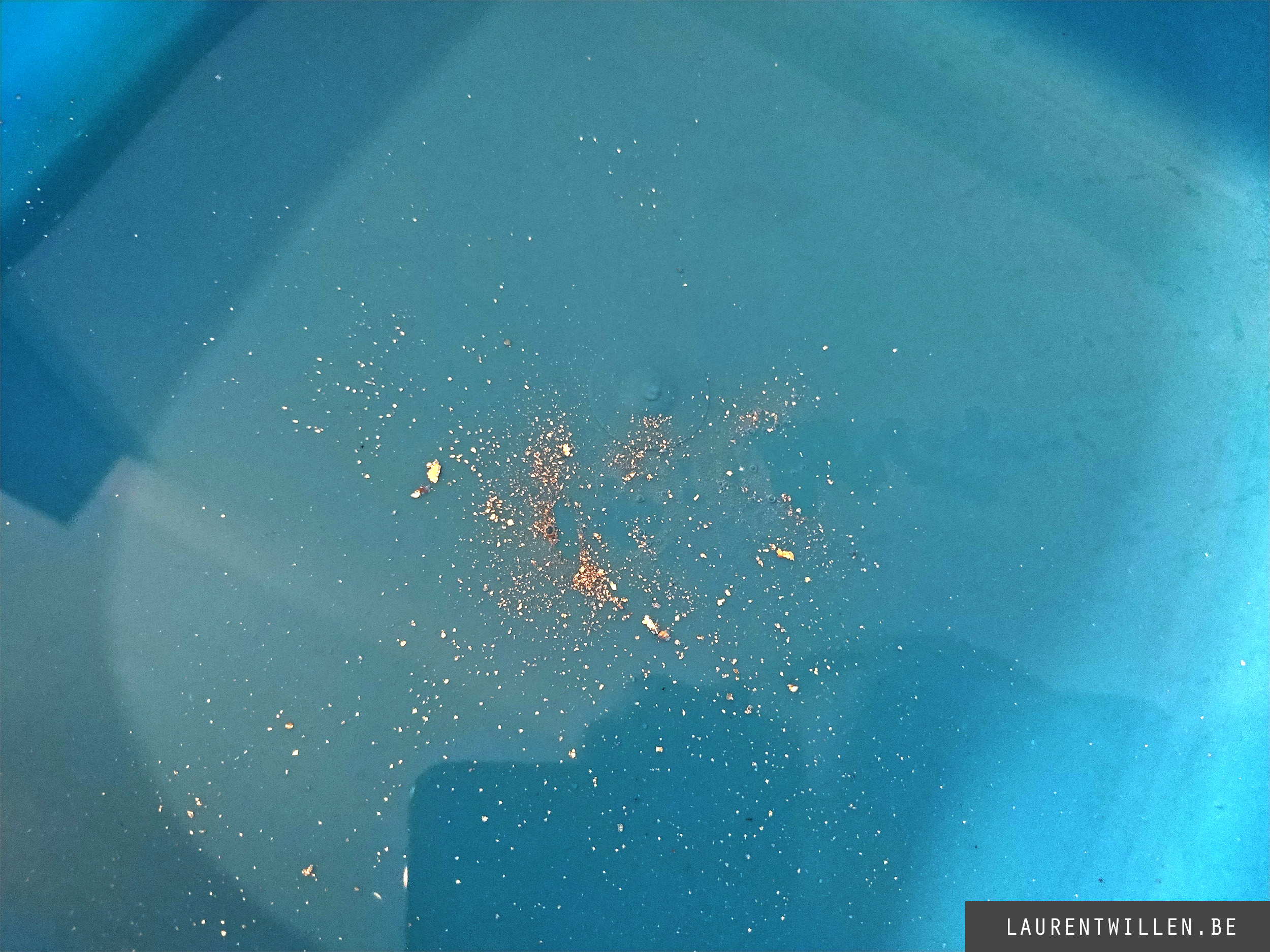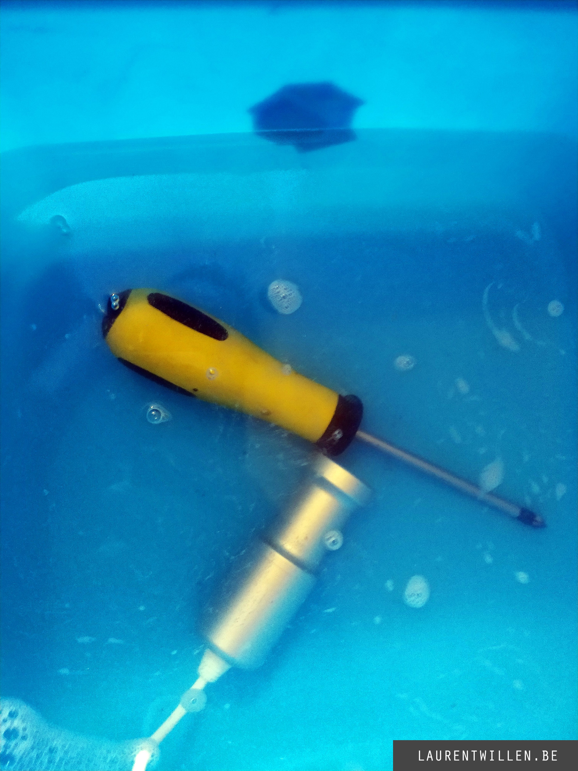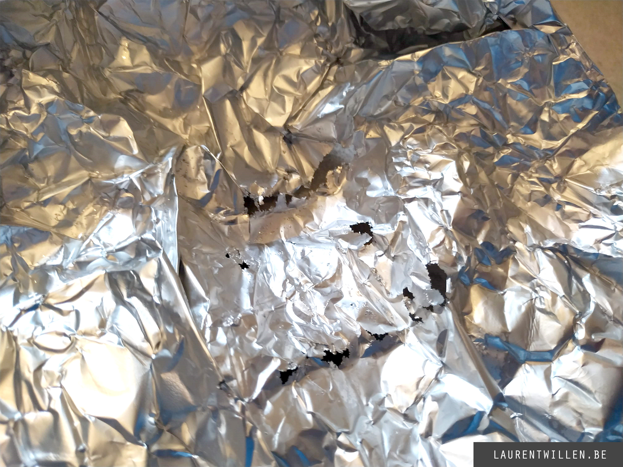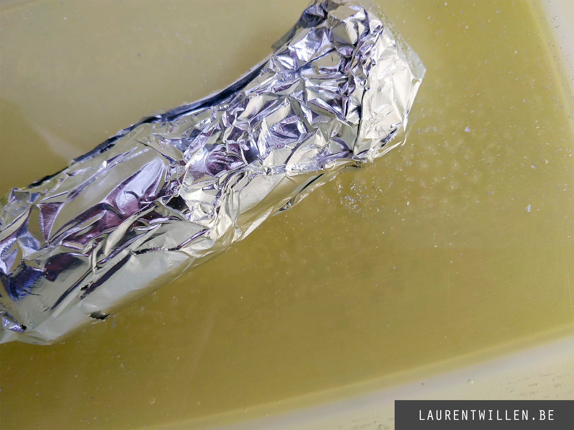 Pour mon deuxième test, j'ai suivi la même méthode que pour le premier. J'ai d'abord enveloppé l'appareil dans un film d'aluminium et l'ai plongé dans l'eau pendant quelques minutes. J'avais un peu peur que l'appareil n'explose à nouveau, mais tout a fonctionné sans problème. A la fin du test, j'ai pu voir des trous dans le pli en aluminium et de la poussière d'aluminium au fond du récipient d'eau. Donc le premier test est ok !